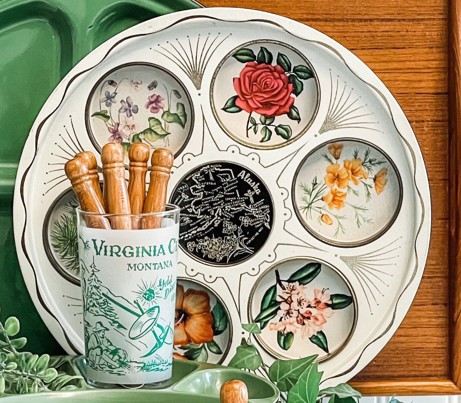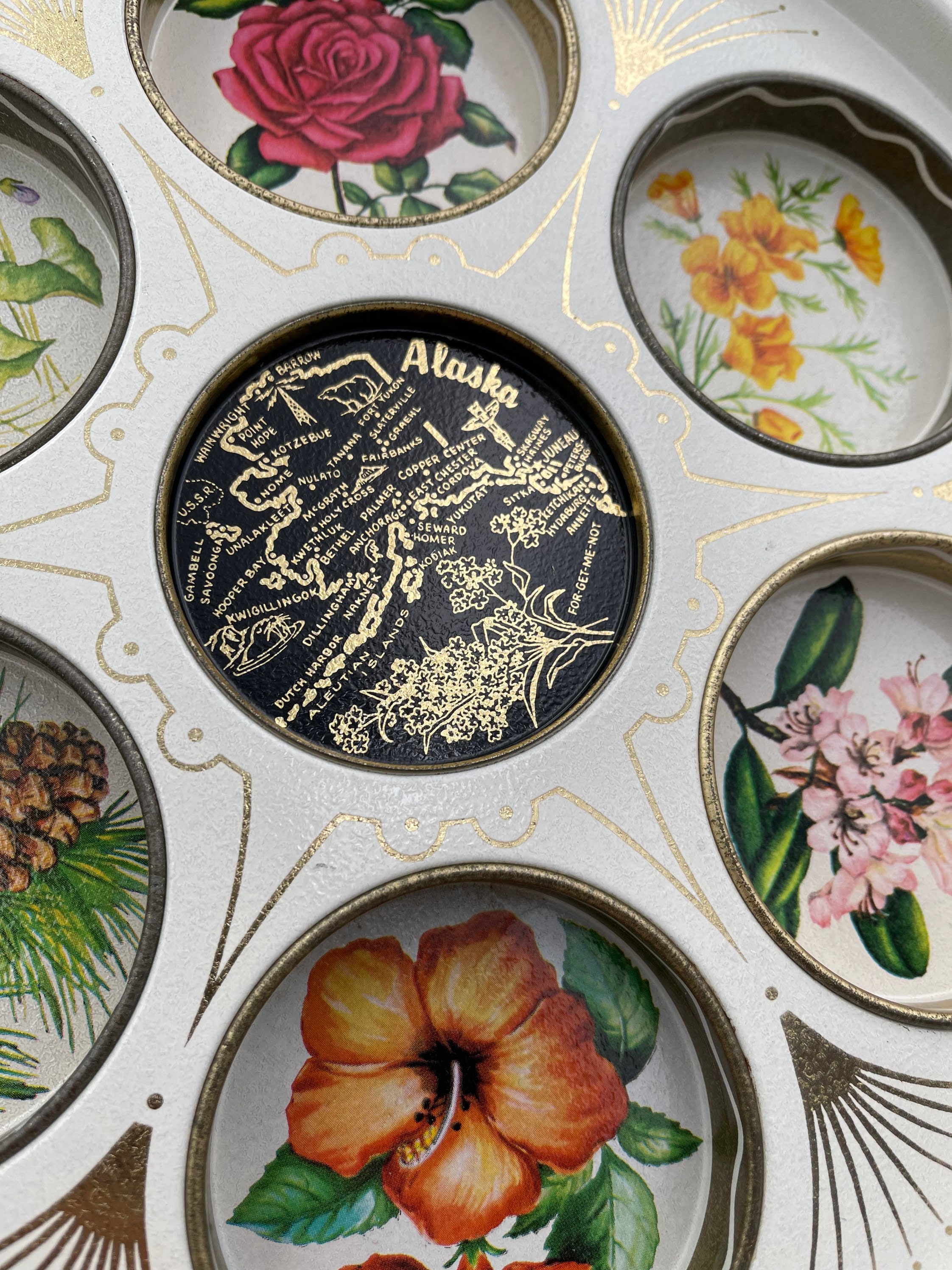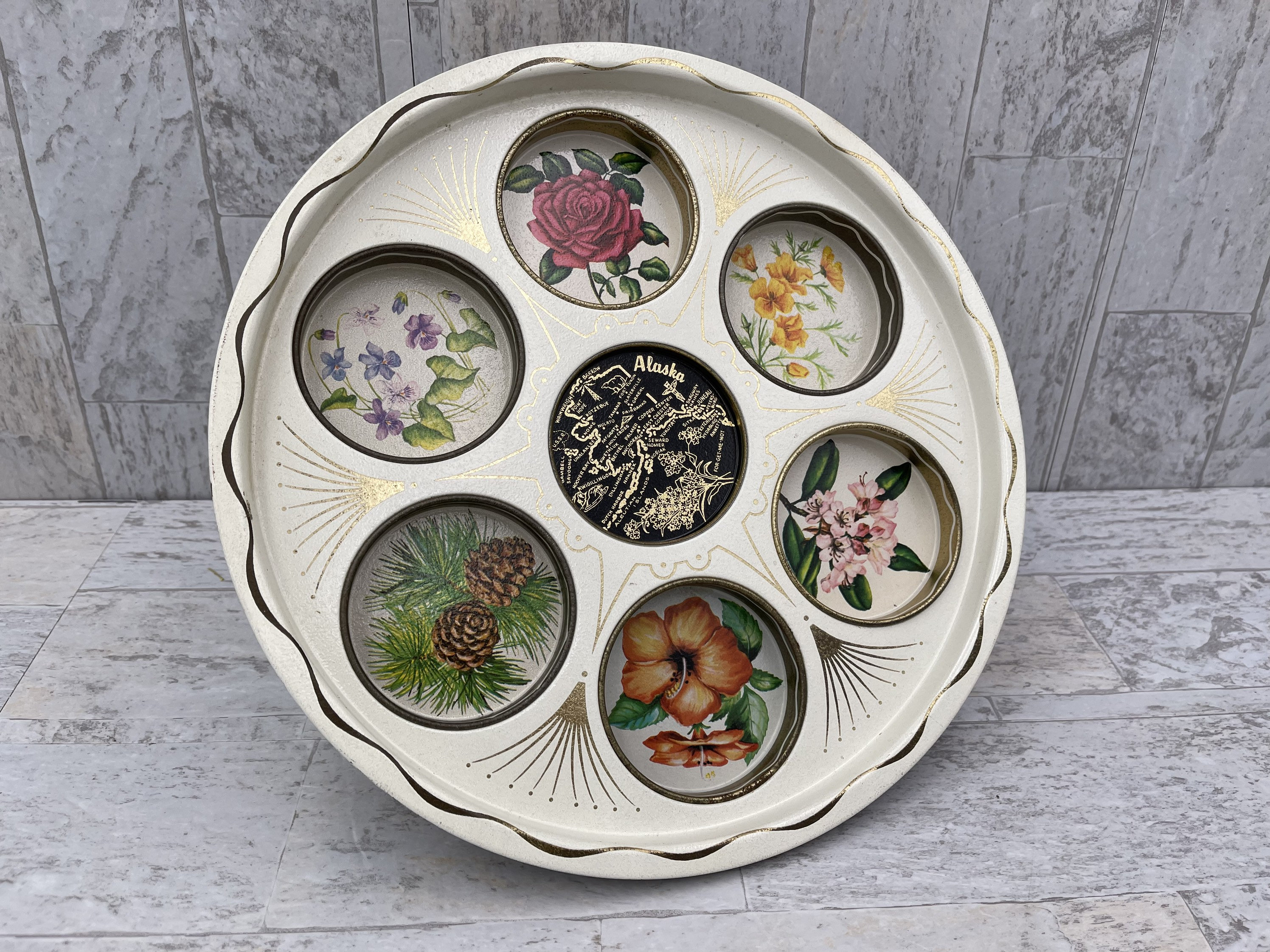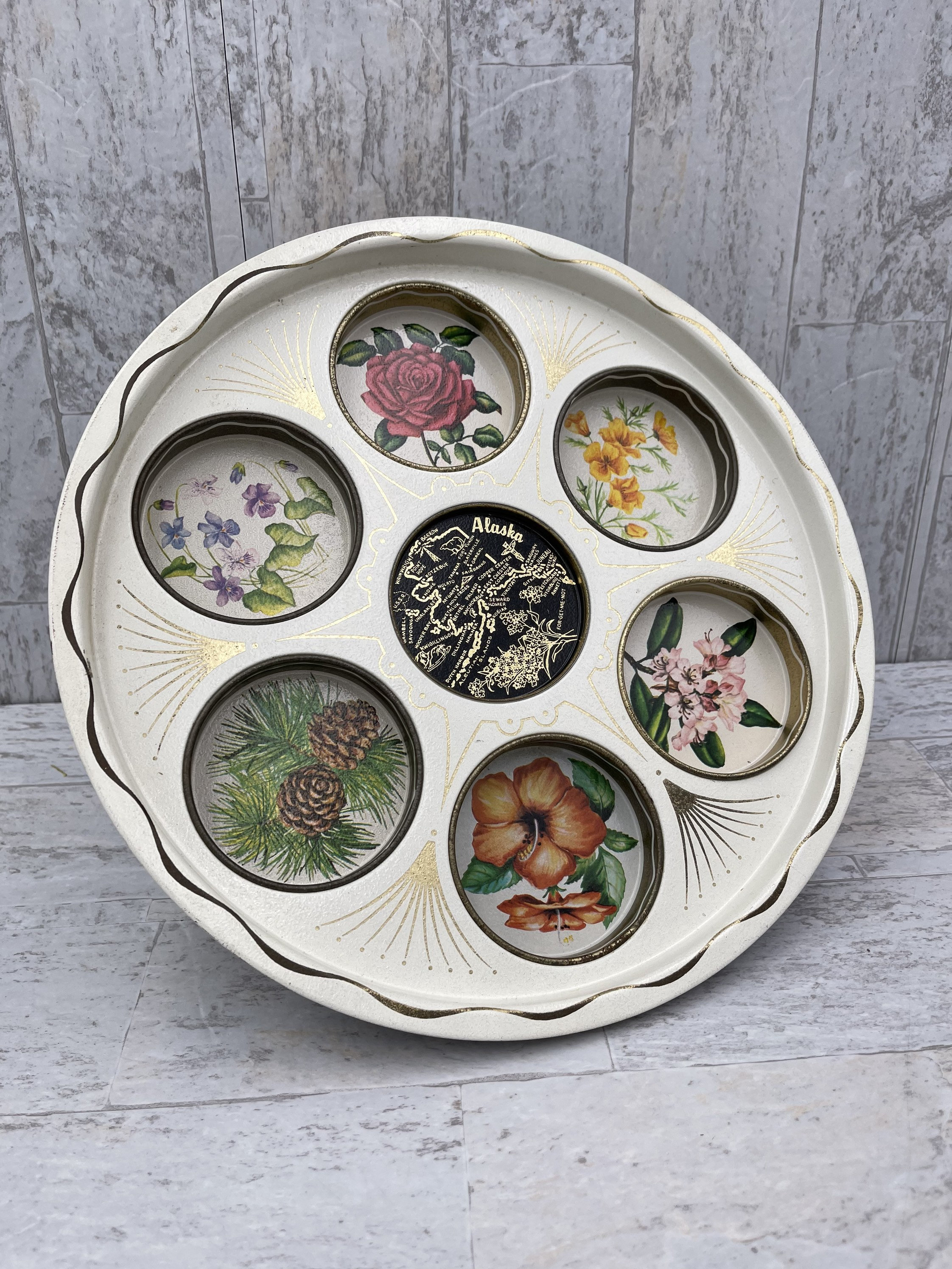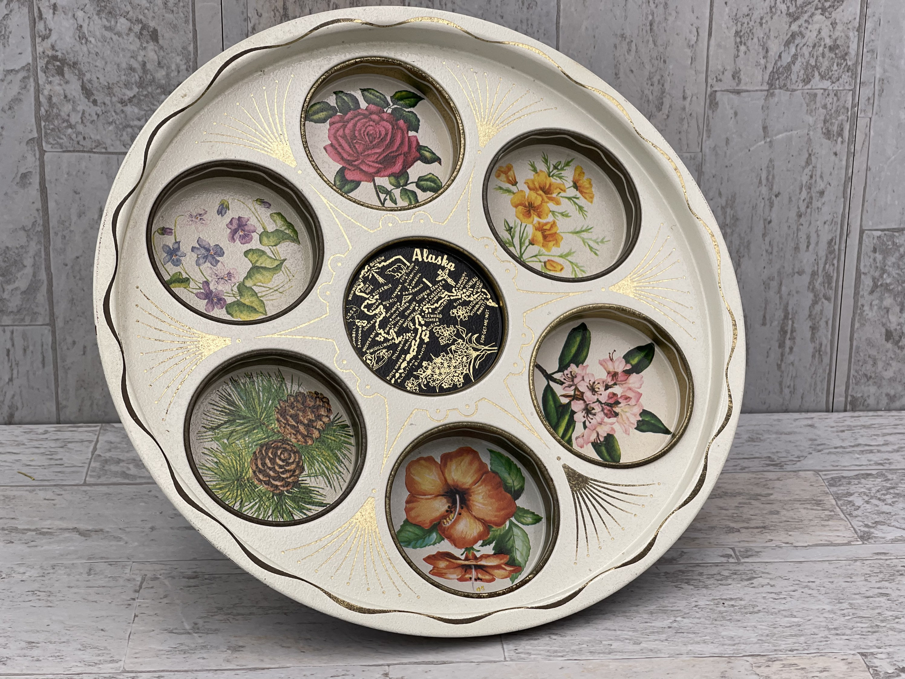 This is a Unique vintage Drink Serving Tray. The Tin tray features insets for holding glasses. A Flower picture decorates each one. The center has an outline map of Alaska.