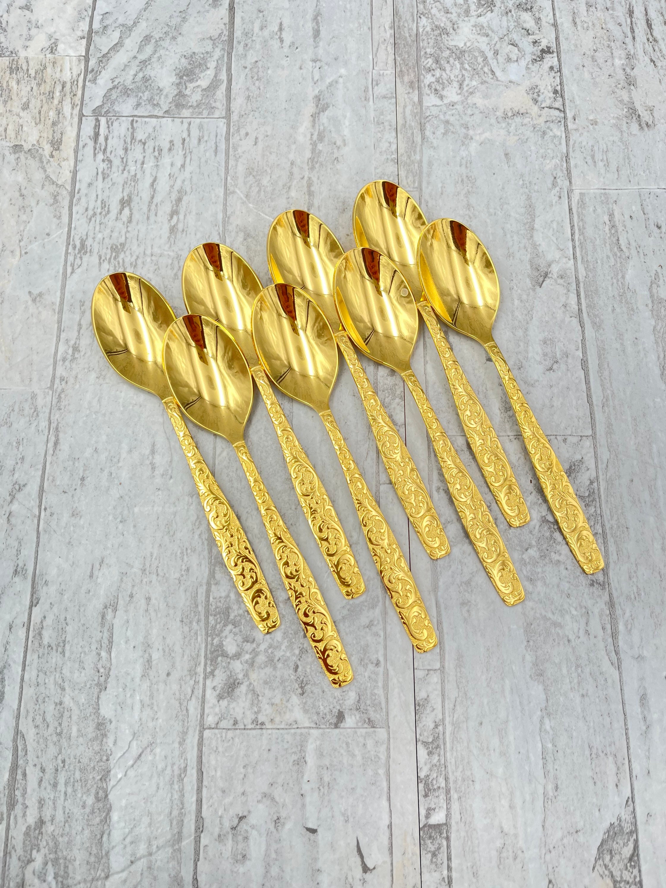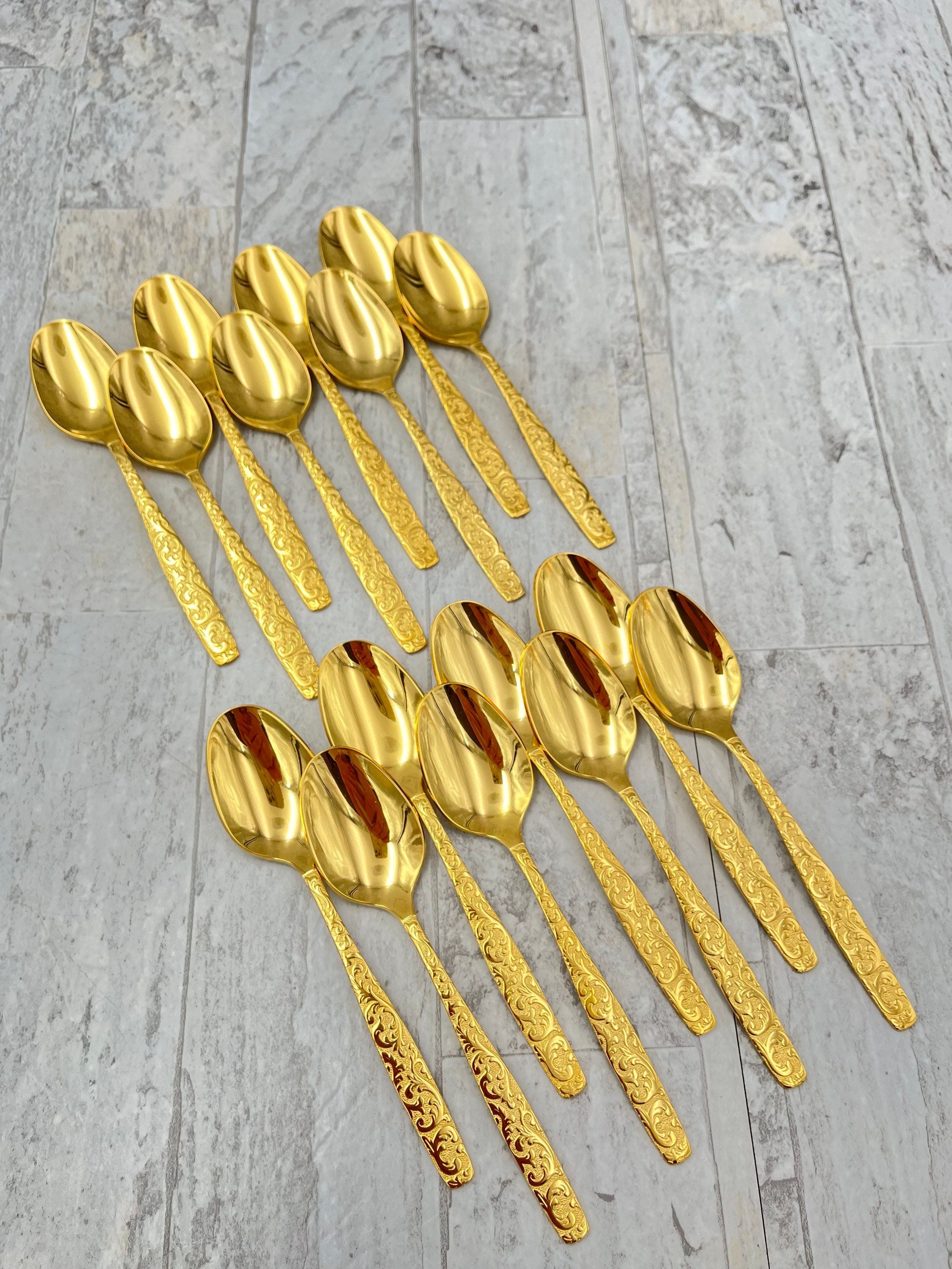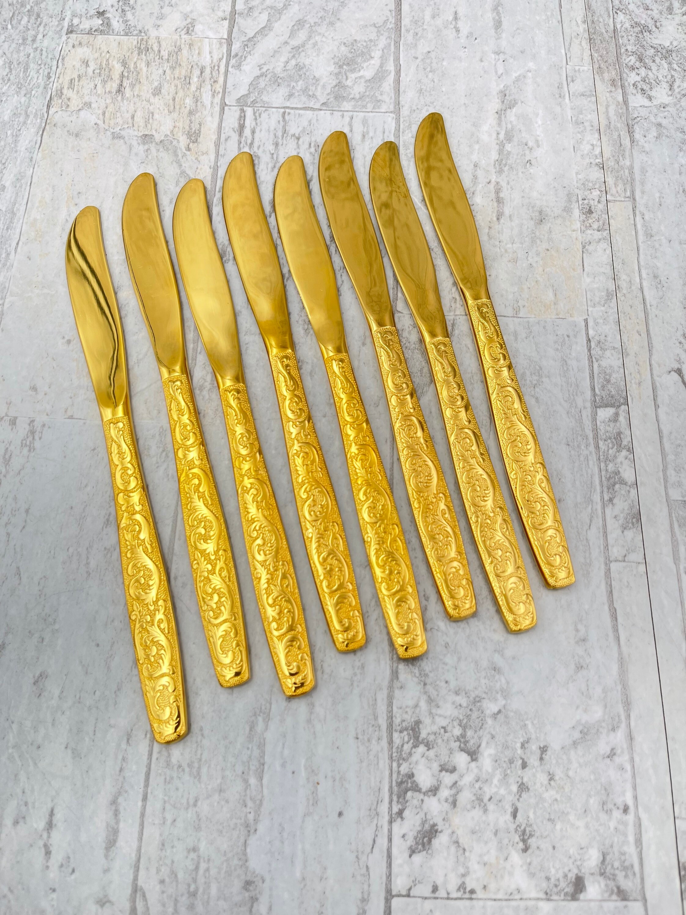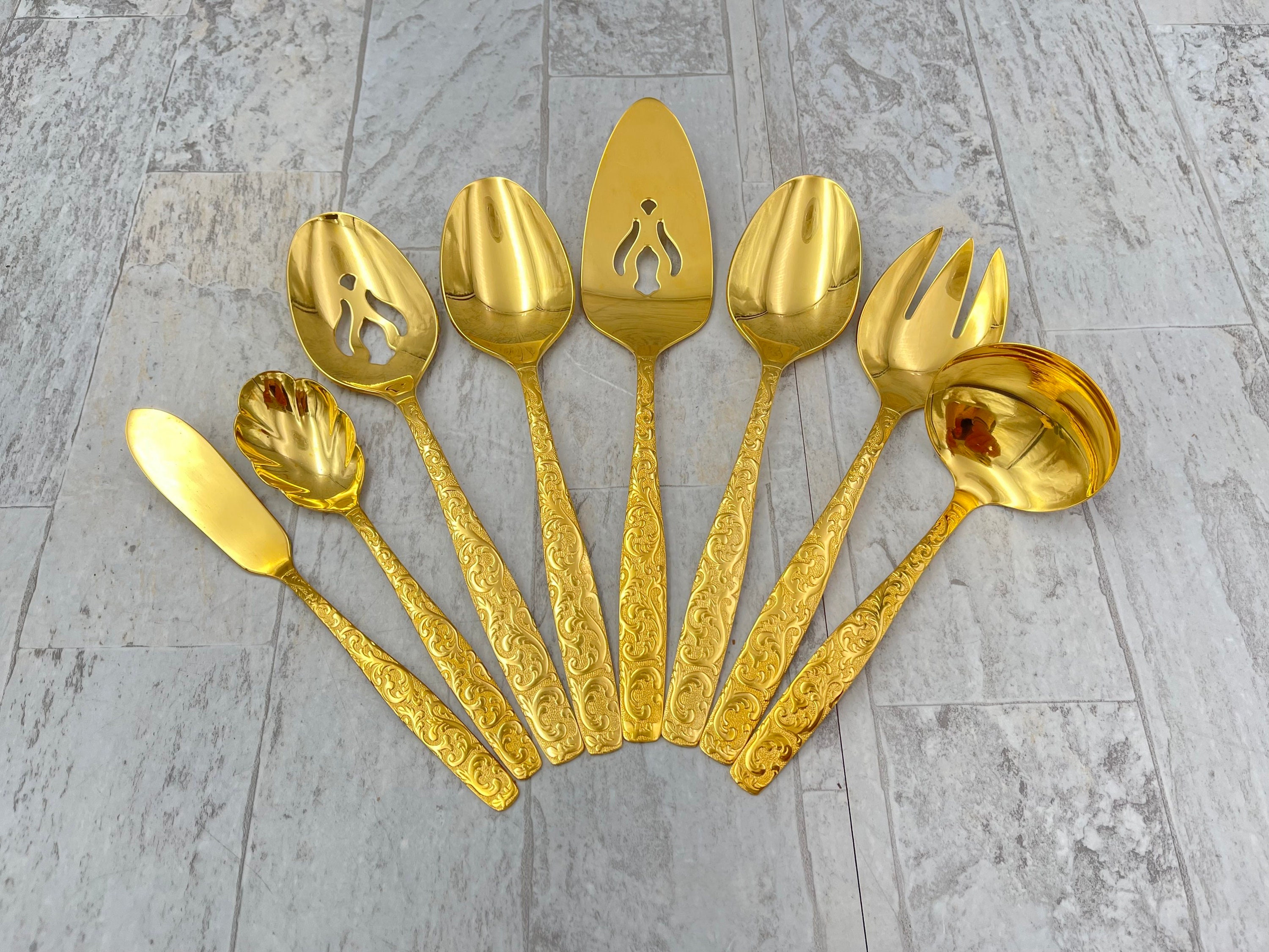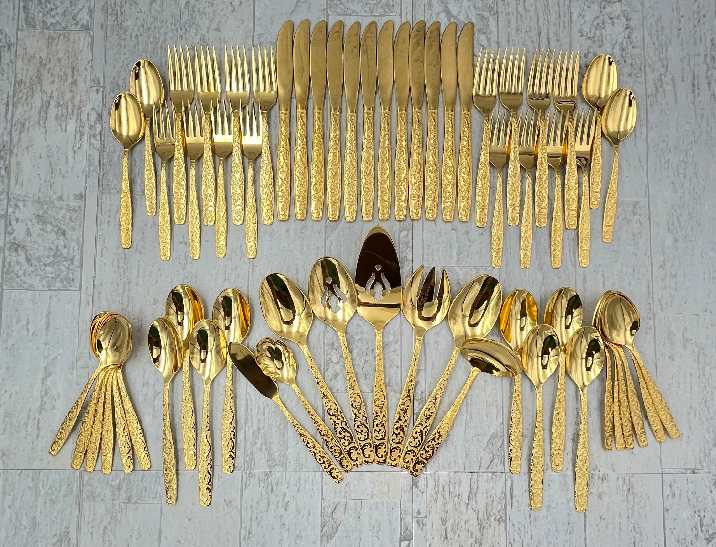 This Is a complete set of Gold Electroplate Flatware in the Golden Americana Heritage pattern by Inernational Silver Co. This Gorgeous flatware is electroplated with Gold on Stainless in an elegant all over scroll pattern on the handle.