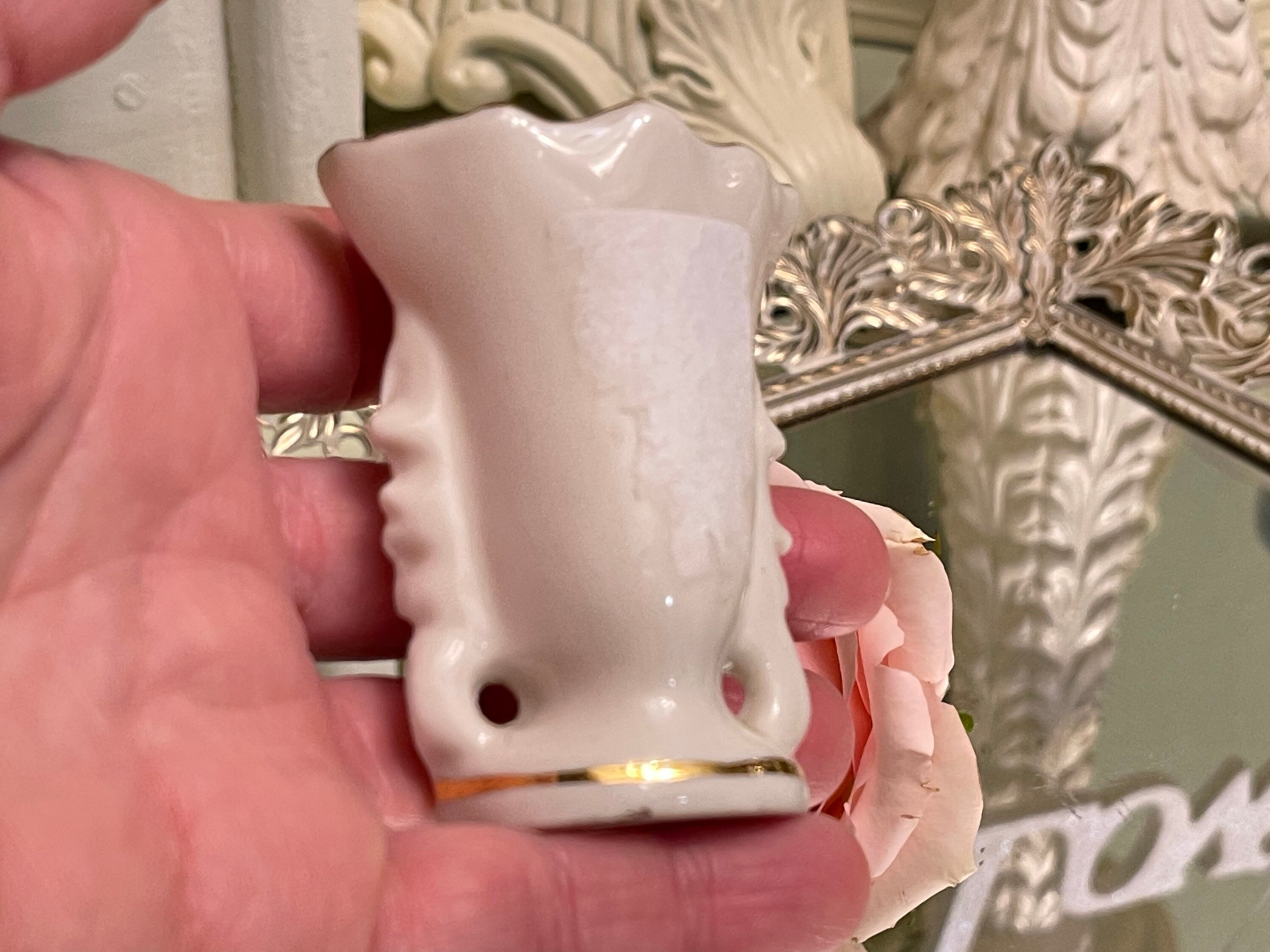 This is a precious miniature Weisley China Vintage Pink Porcelain Vases. This beautiful vase is trimmed in Gold with Lovely Handpainted flowers for decoration. Made by the Lefton. Marked on the bottom. Weisley China Hand painted.