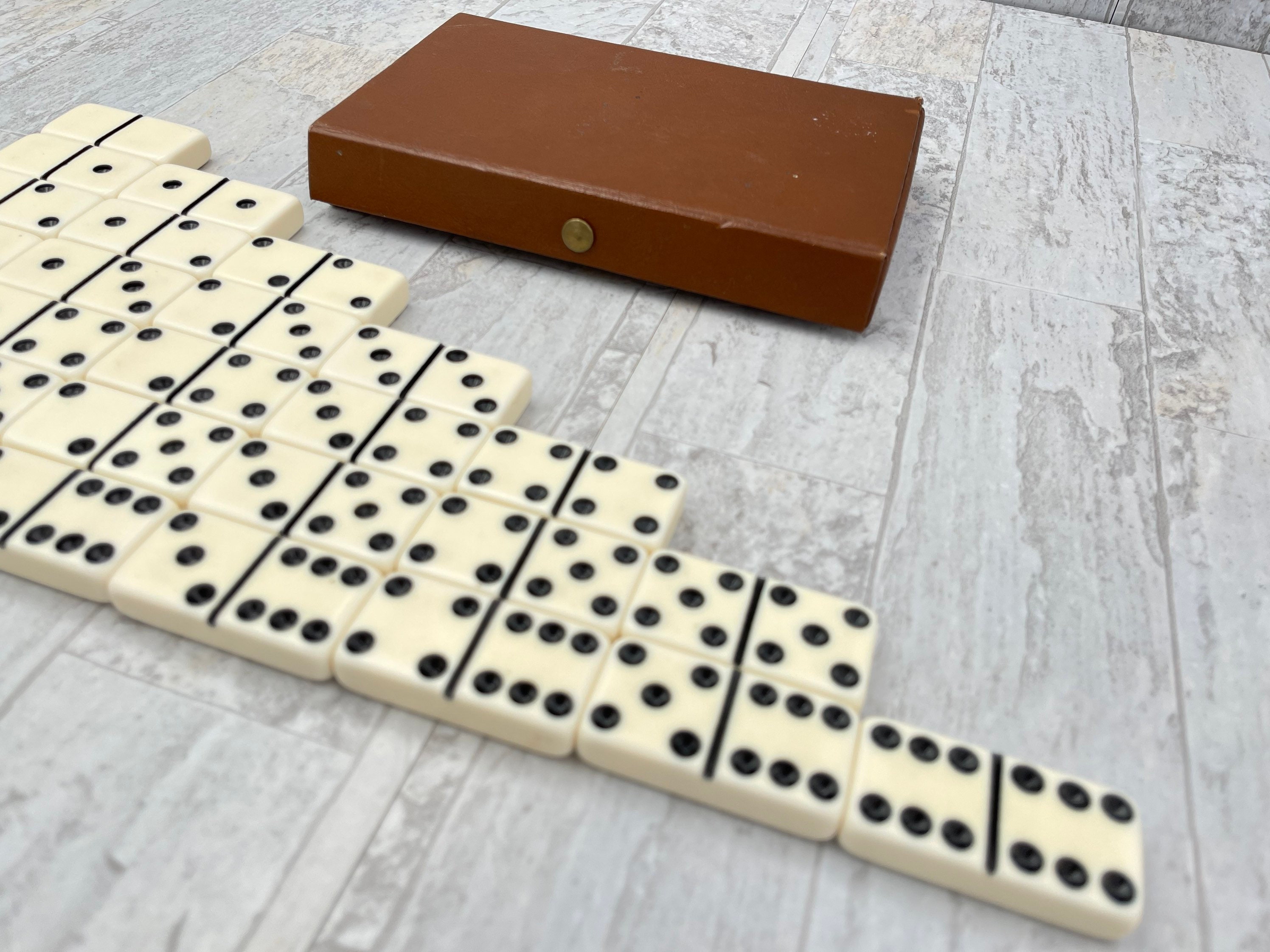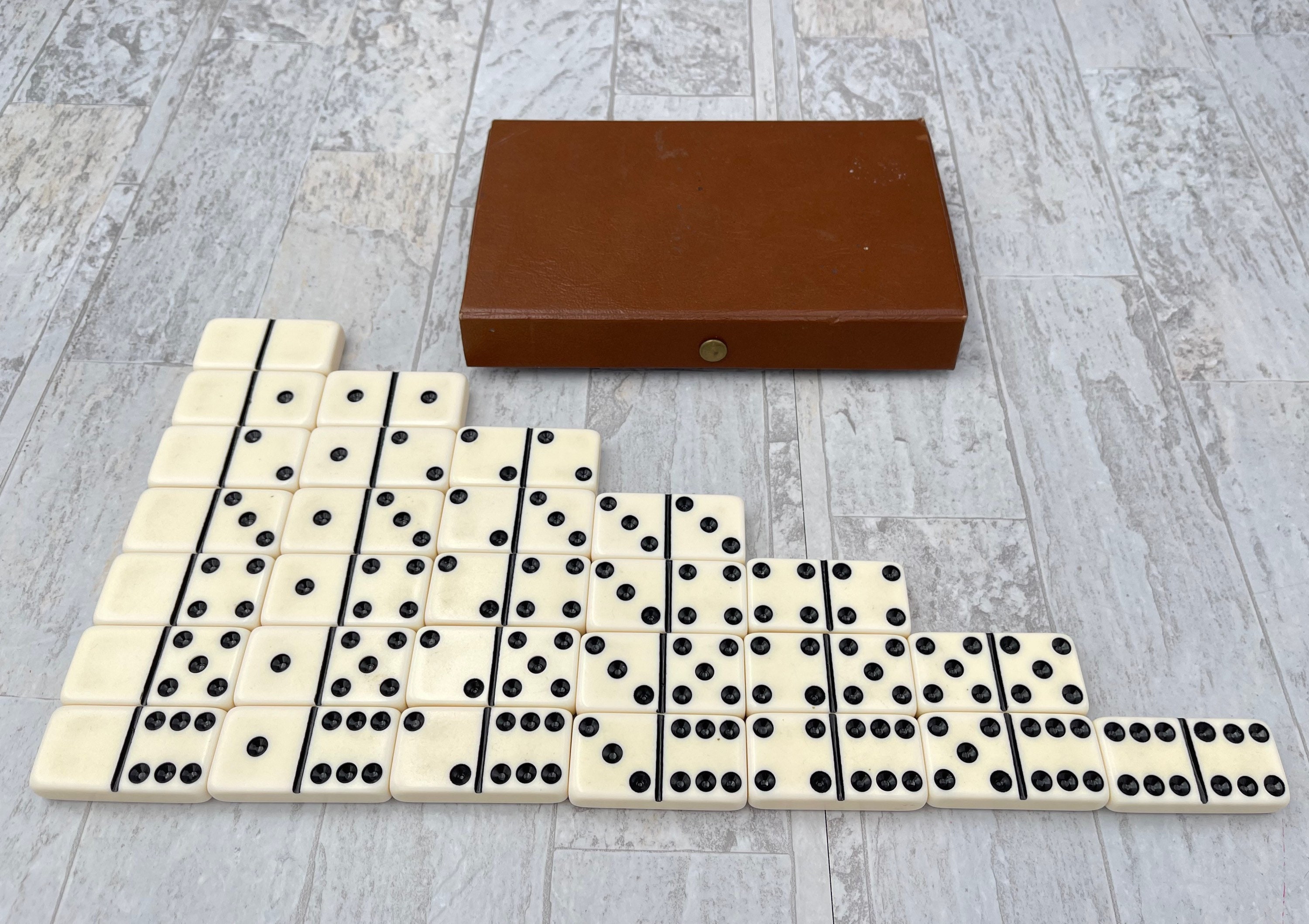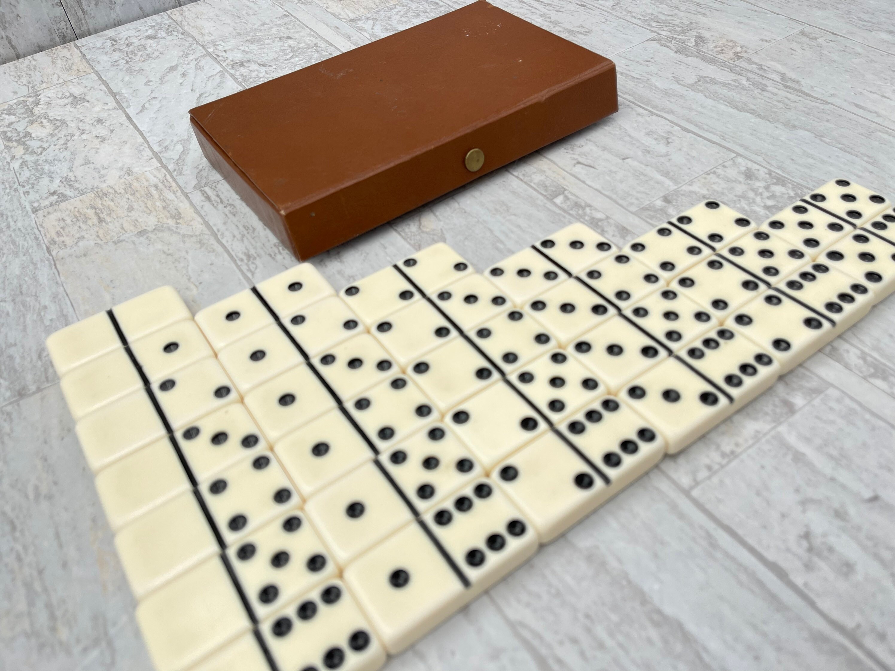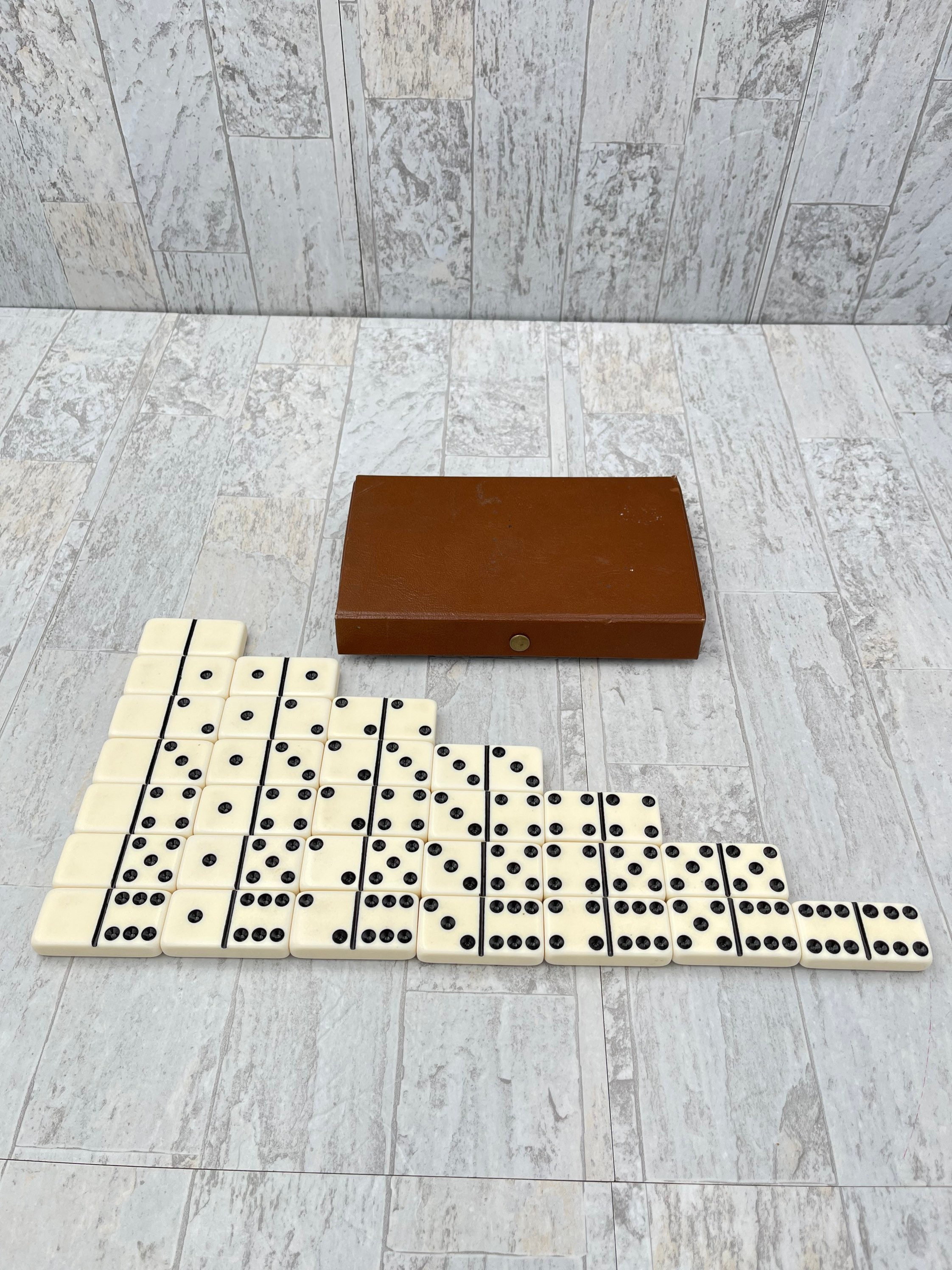 This a complete set of large Double Six Dominoes. The set comes in a little vinyl case. This set is double Six set of 28. These dominoes have a good weight to them. Quality vintage set.