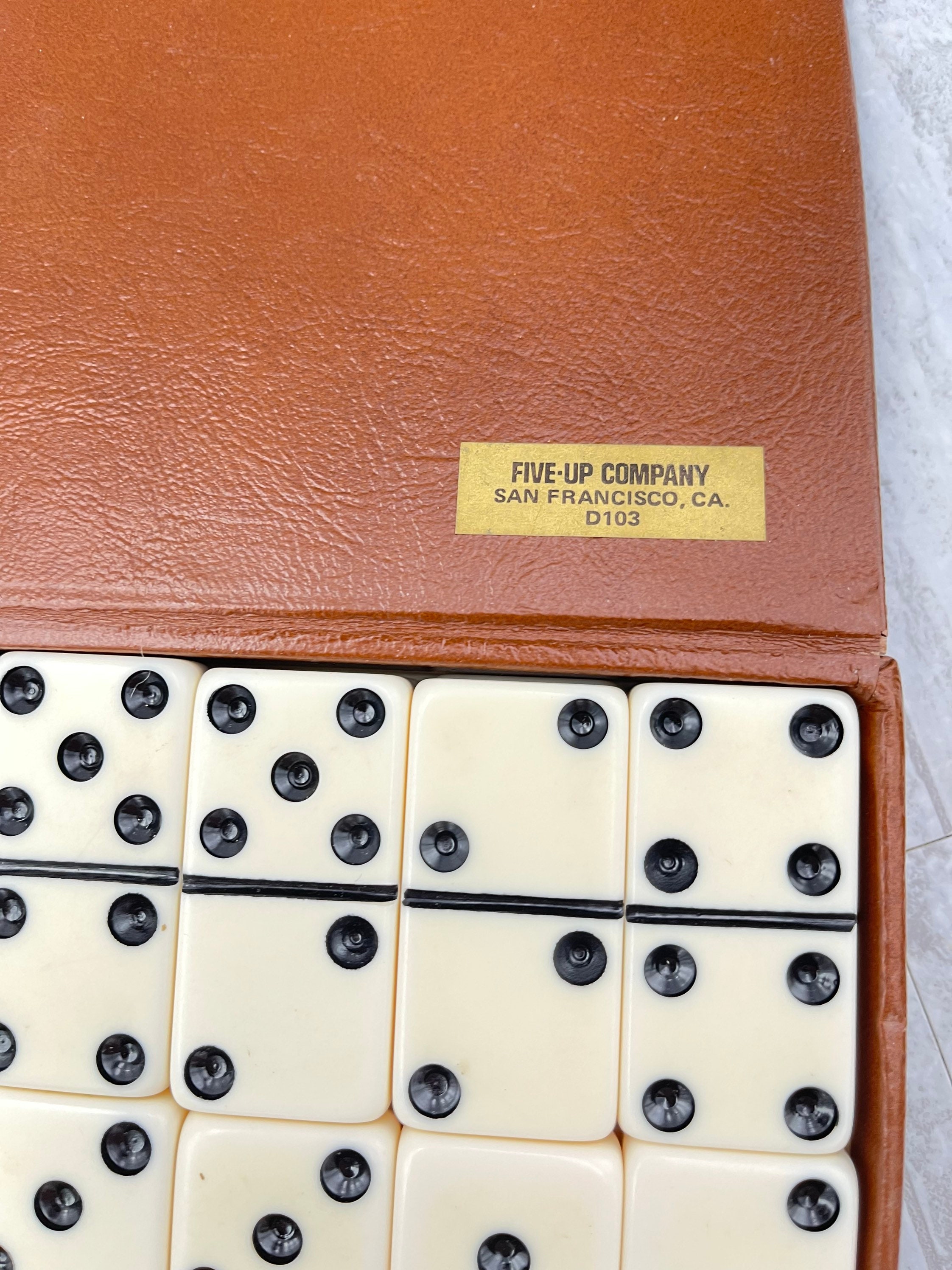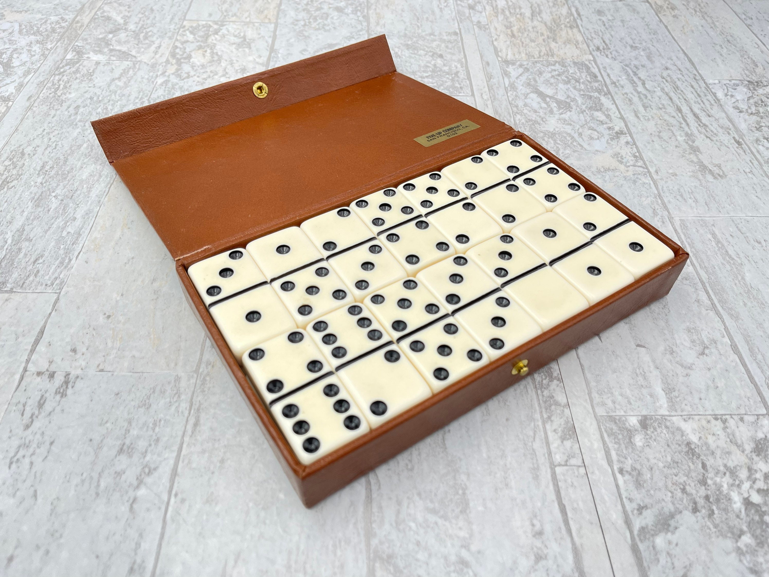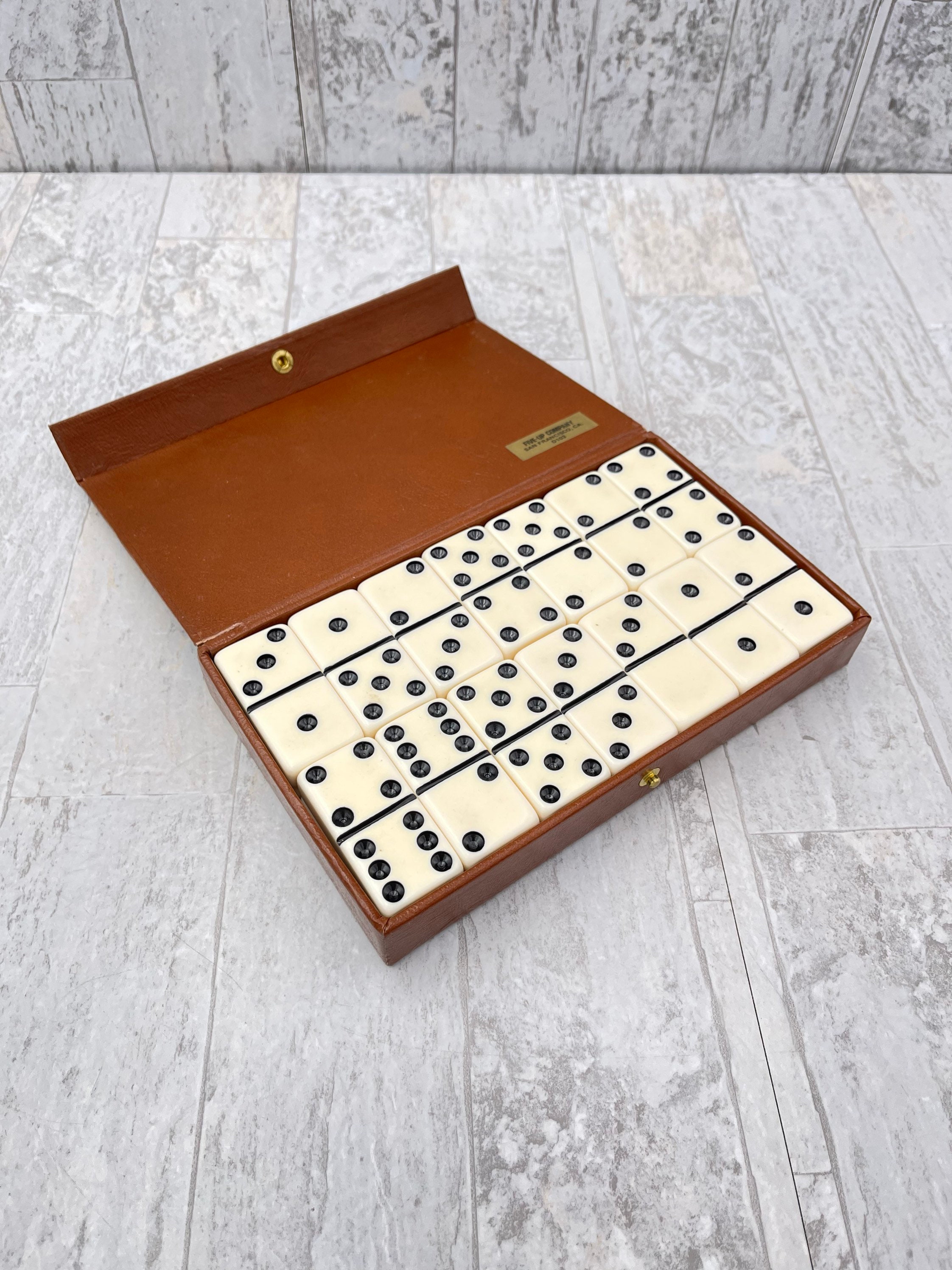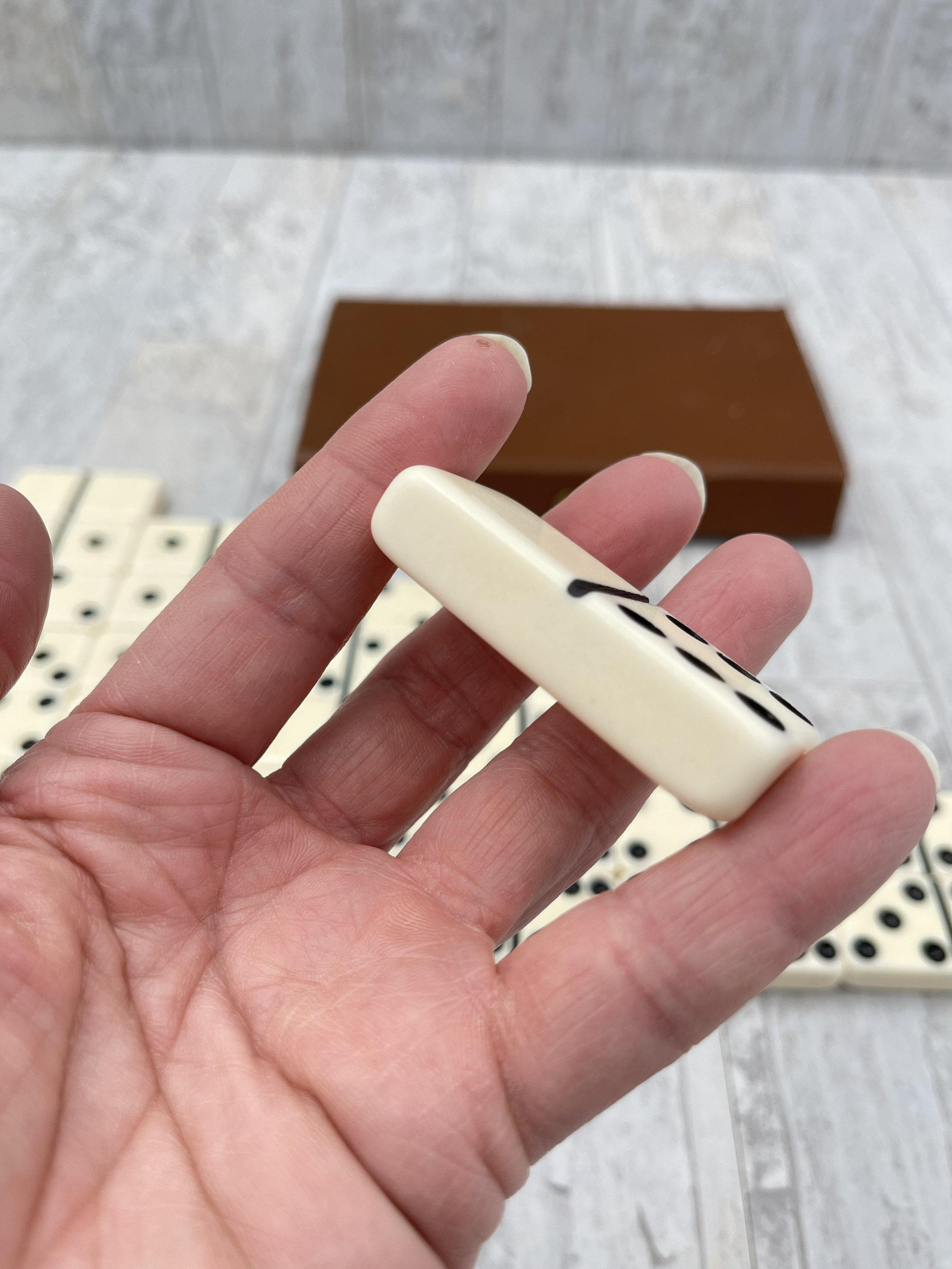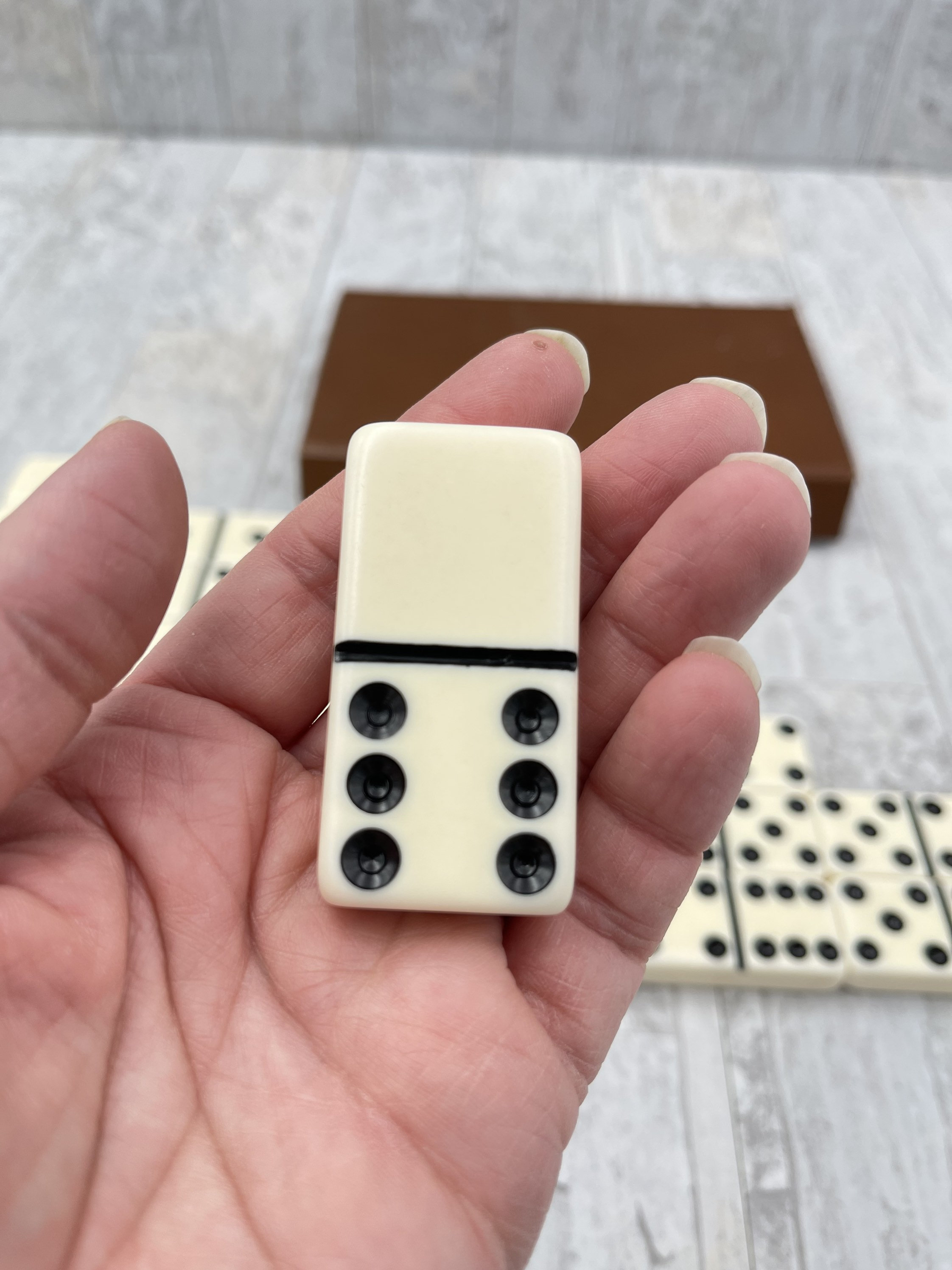 This a complete set of large Double Six Dominoes. The set comes in a little vinyl case. This set is double Six set of 28. These dominoes have a good weight to them. Quality vintage set.
