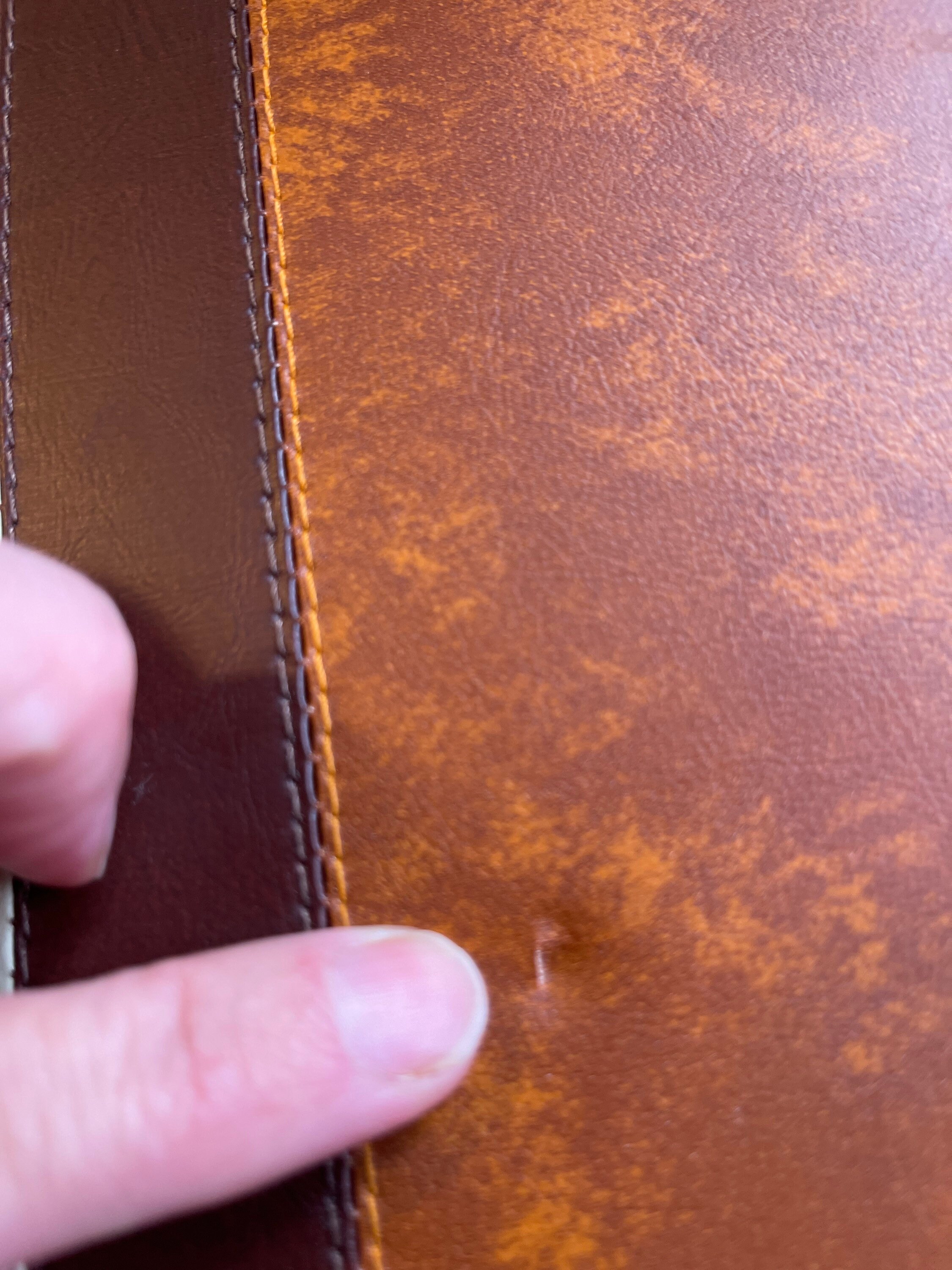 The handsome carrying case is made of Tan vinyl with a Beige and Brown stripe. It is in good vintage condition with a small split in vinyl Pictured.