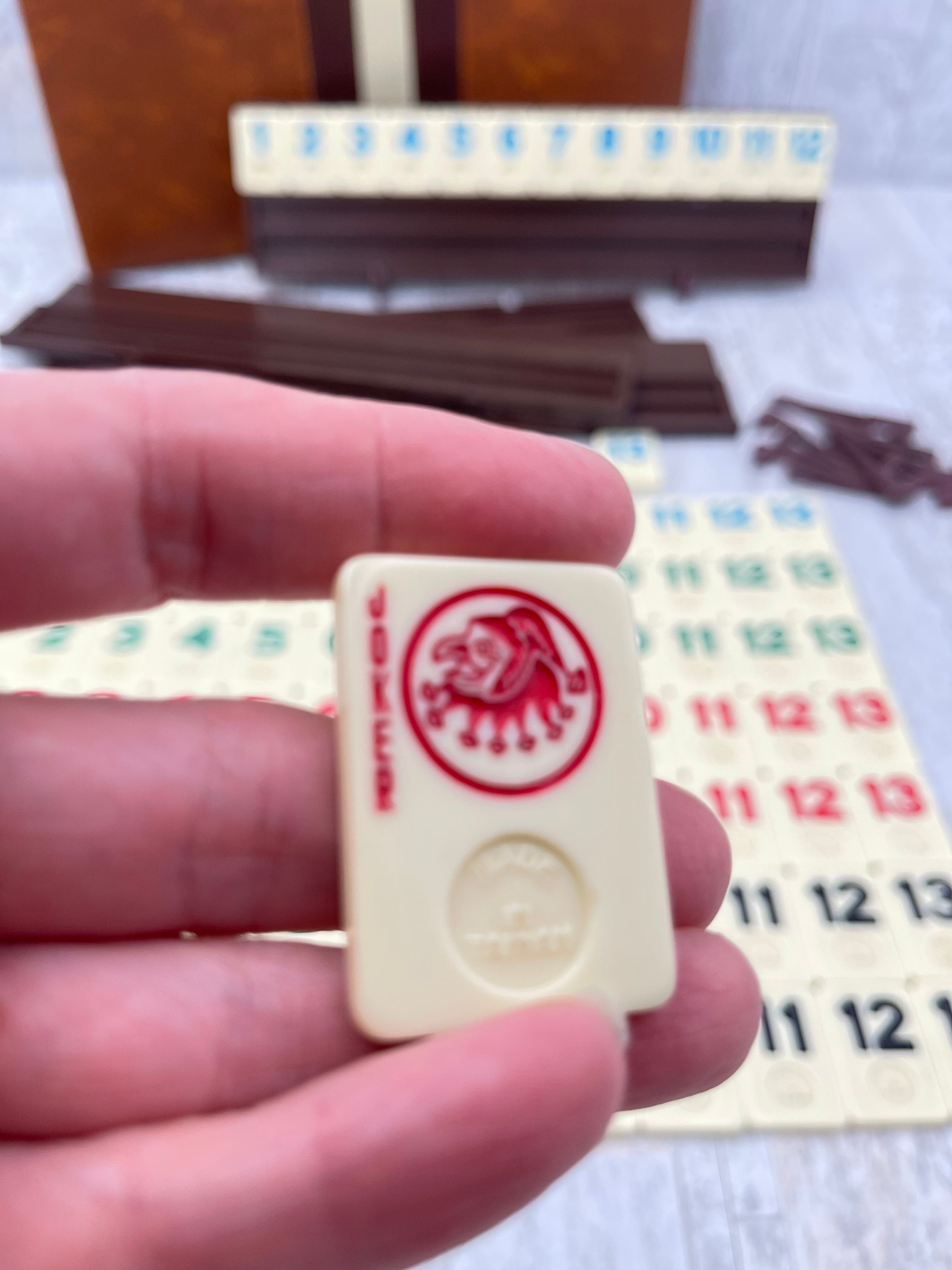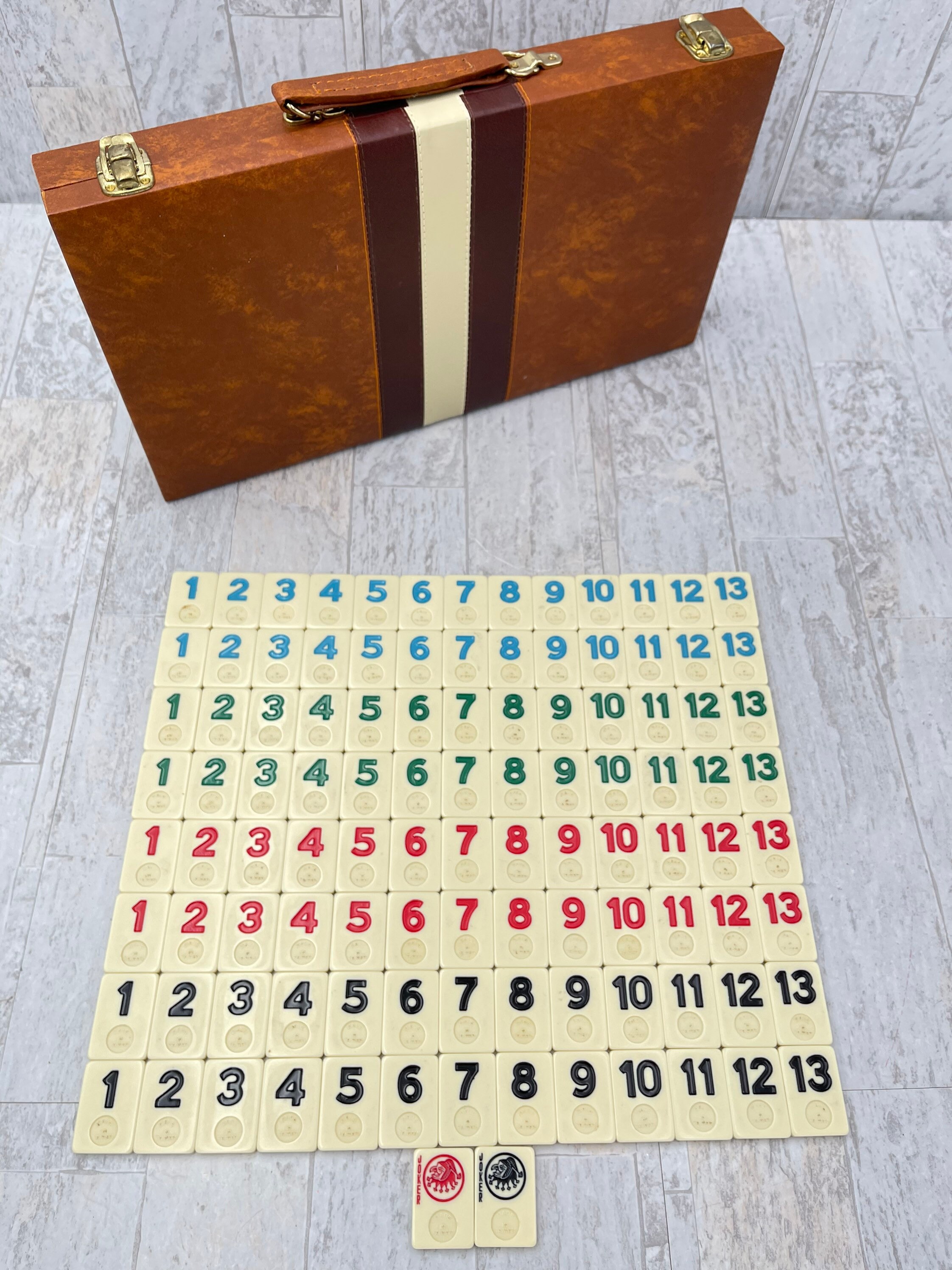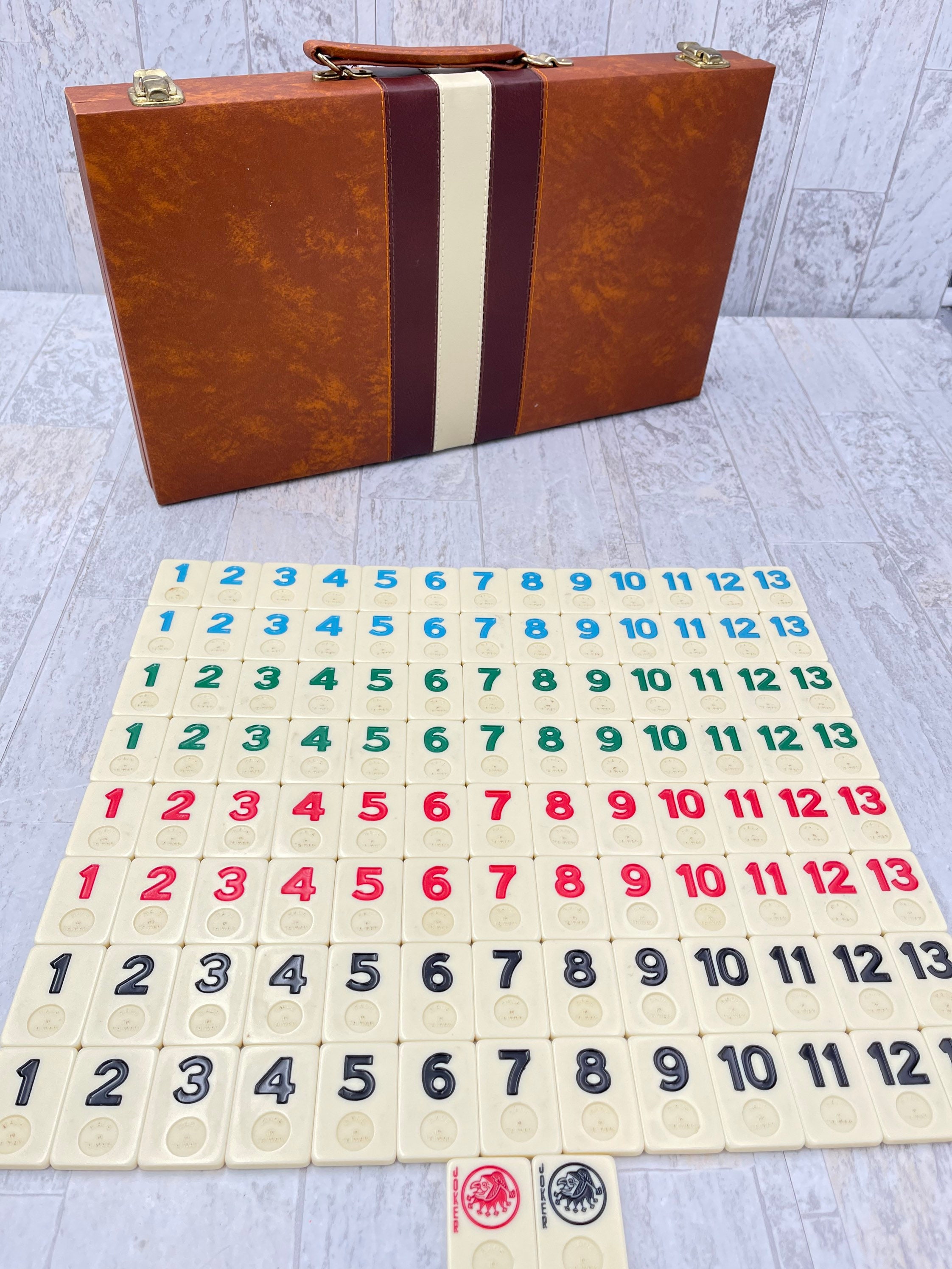 Vintage Deluxe Rummy Tile Game in Vinyl carrying case. This fabulous set is original and complete with 106 Specially designed tiles. The Tile holders/boards are perfect for keeping your tiles organized while you play the game!