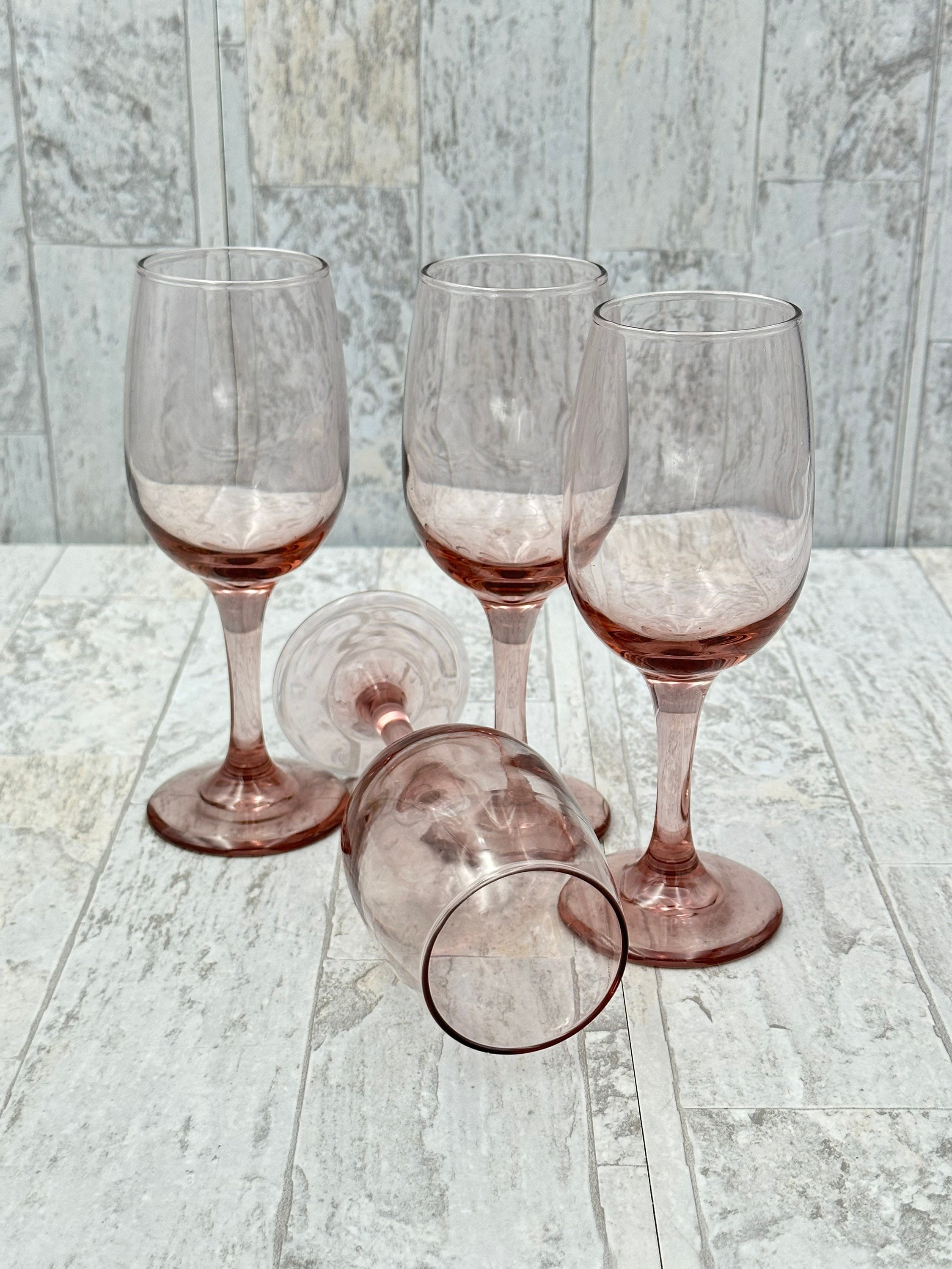 A pretty set of vintage Libbey glasses in an soft pinkish color. These glasses are marked with the Libbey Glass co. Mark of a cursive L.