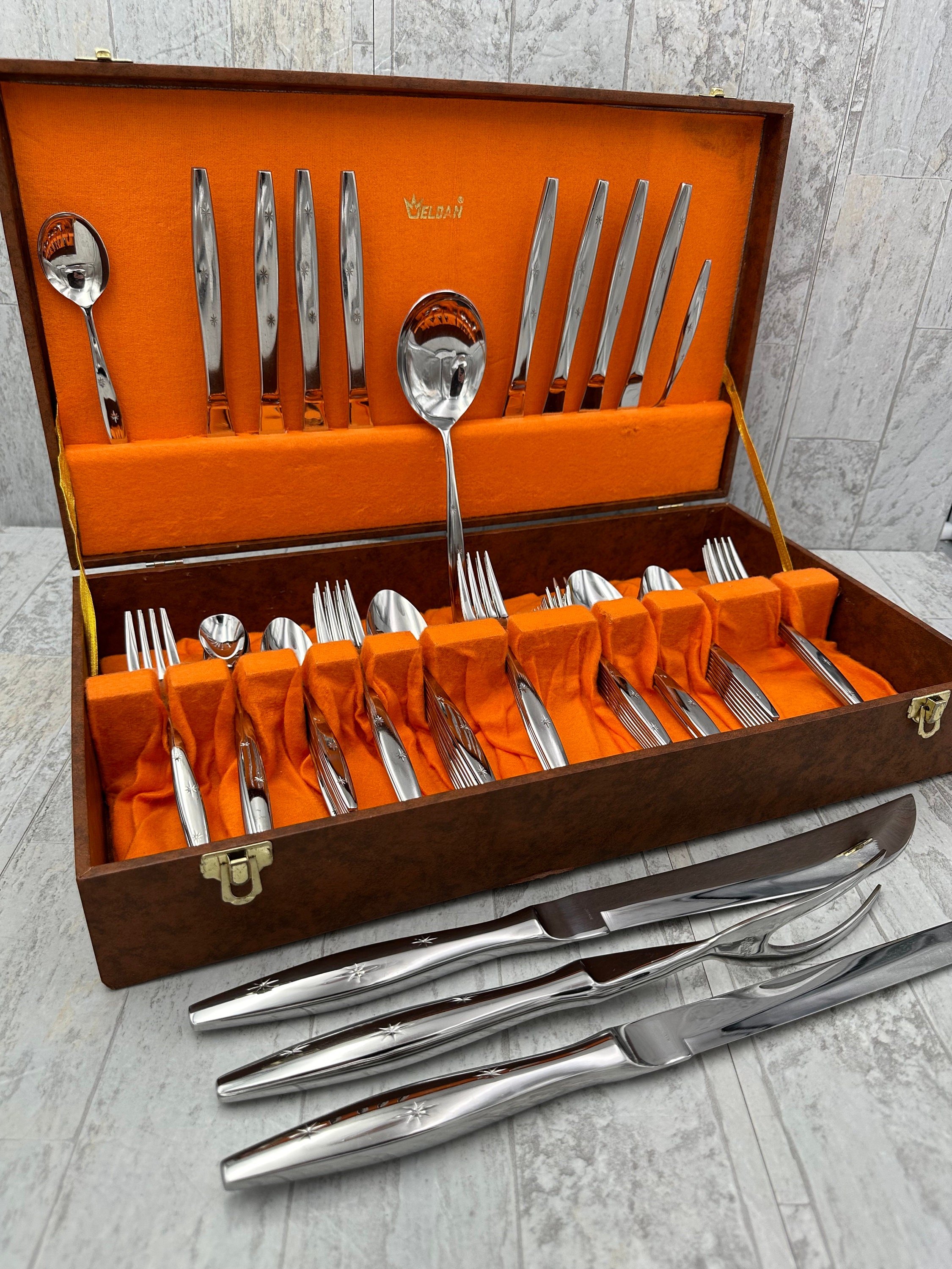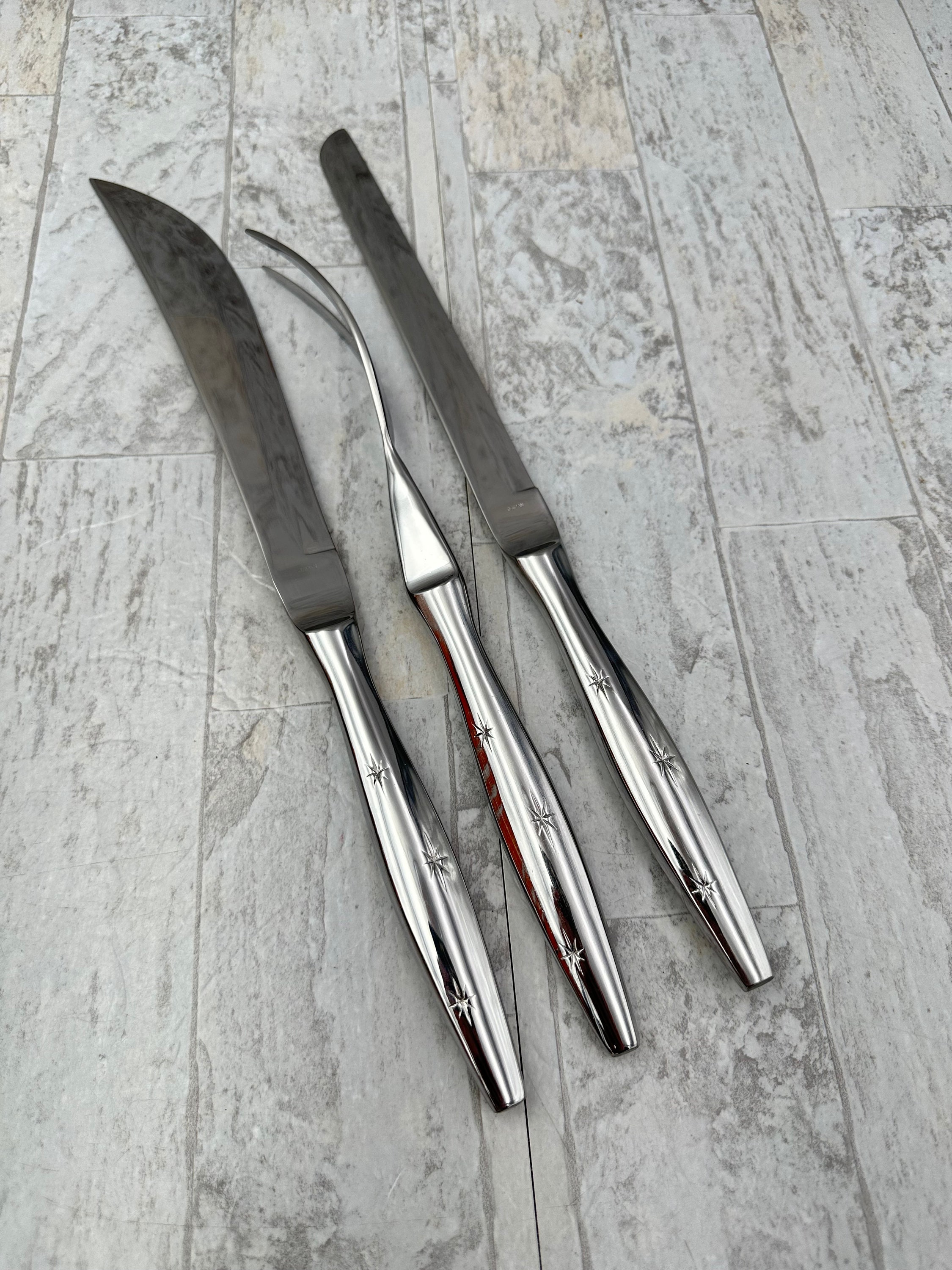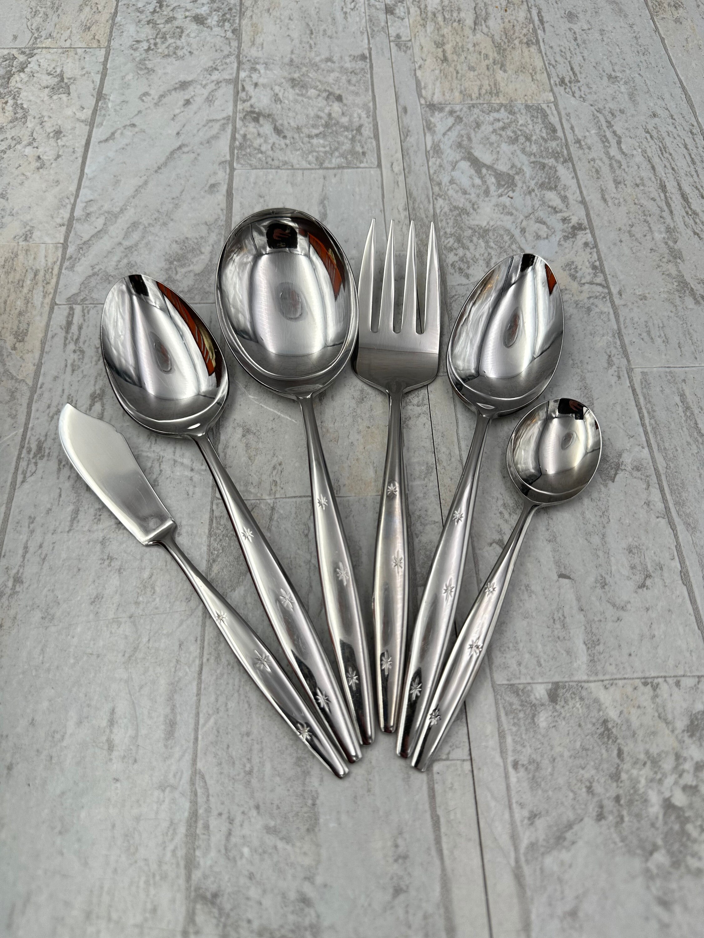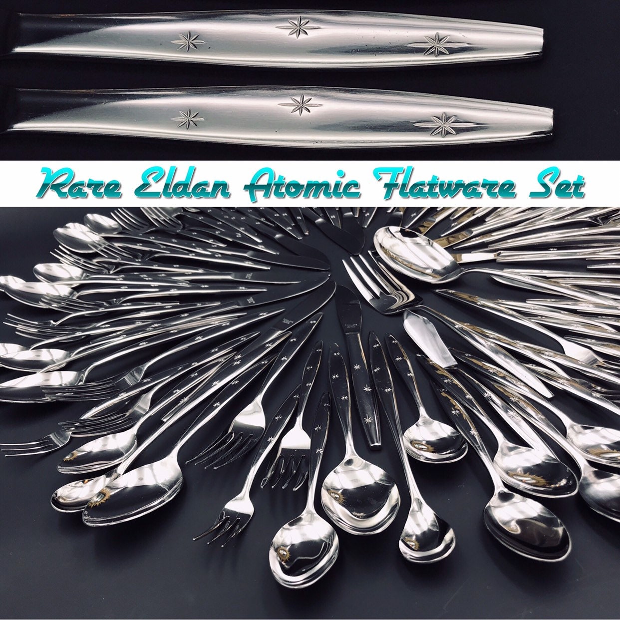 This is a Rare Vintage Atomic Three Star Flatware Set By Eldan. This Set of Flatware is such an Iconic depiction of the Atomic Era of Vintage Flatware. Three starbursts give the flatware its celestial look. The stars are on each handle. The end of the handle comes to a blunt tapered end. Gorgeous!