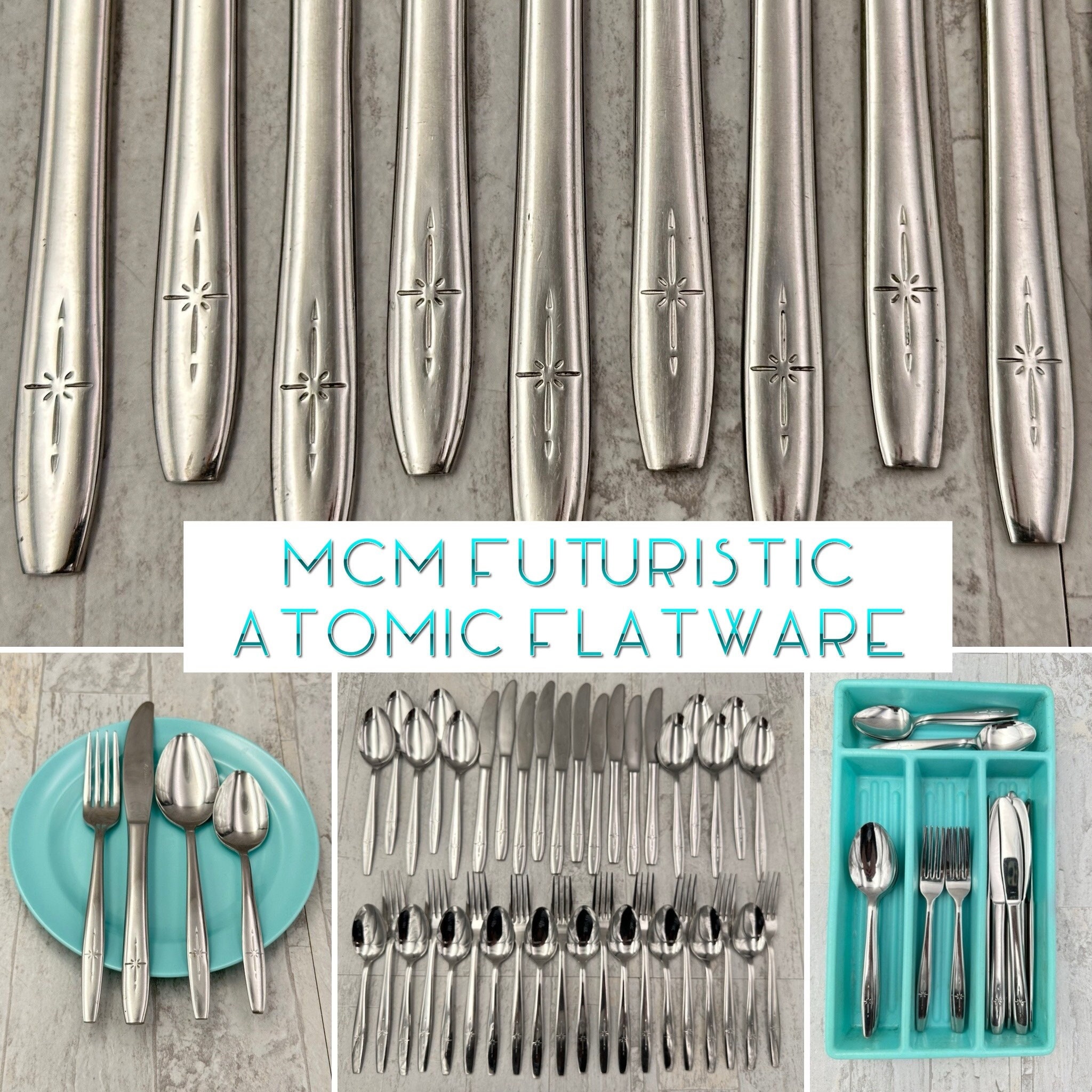 This is a Rare Find of Vintage Atomic Star Flatware Set By CG Silverware Co. This Set of Flatware is designed in Atomic Style of Vintage Flatware. The starbursts give the flatware its celestial look. The stars are on each handle. The end of the handles come to a tapered end.