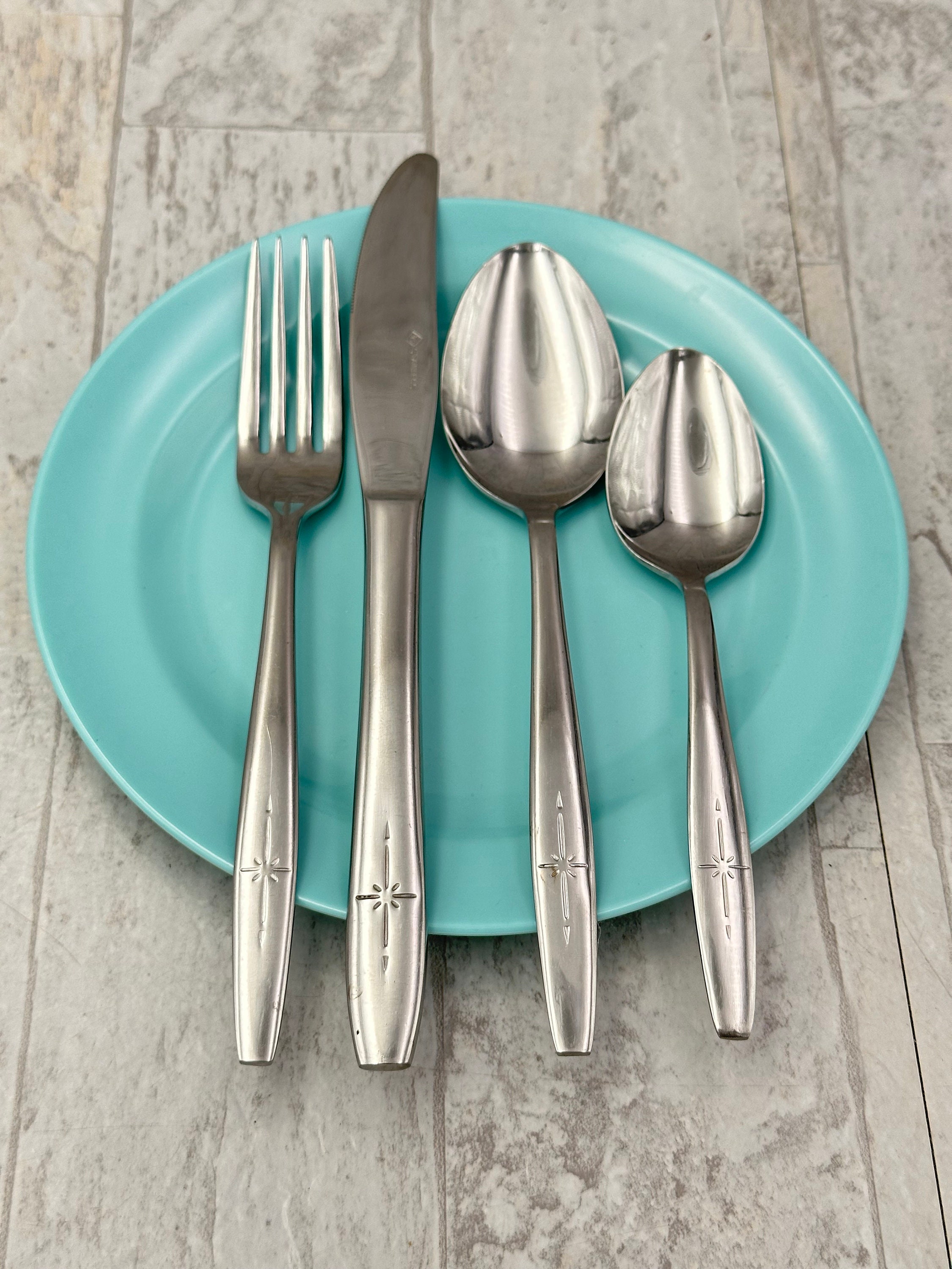 This set comes in a Vintage turquoise Flatware tray.