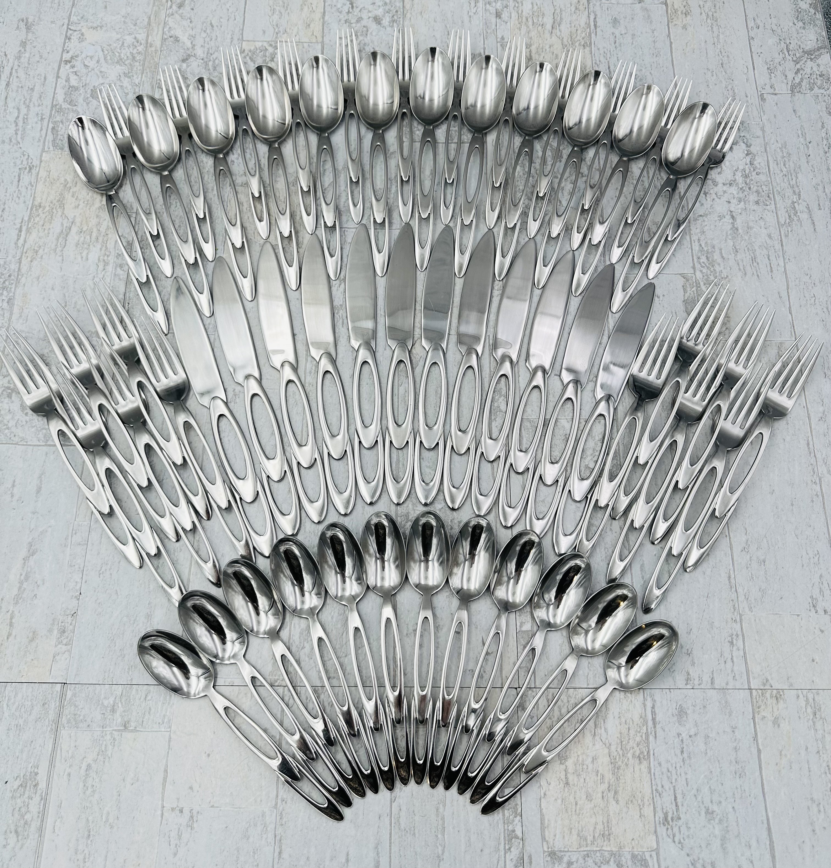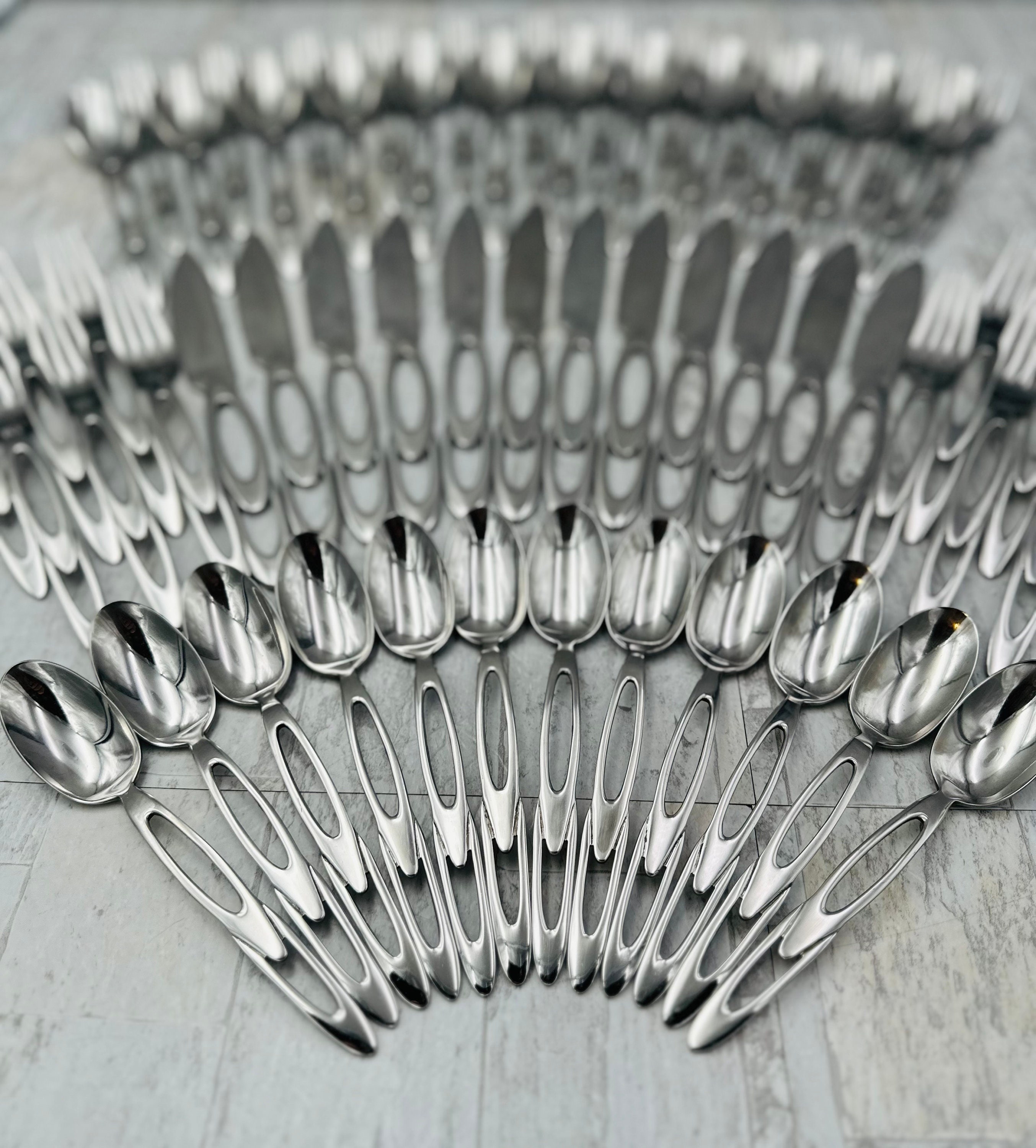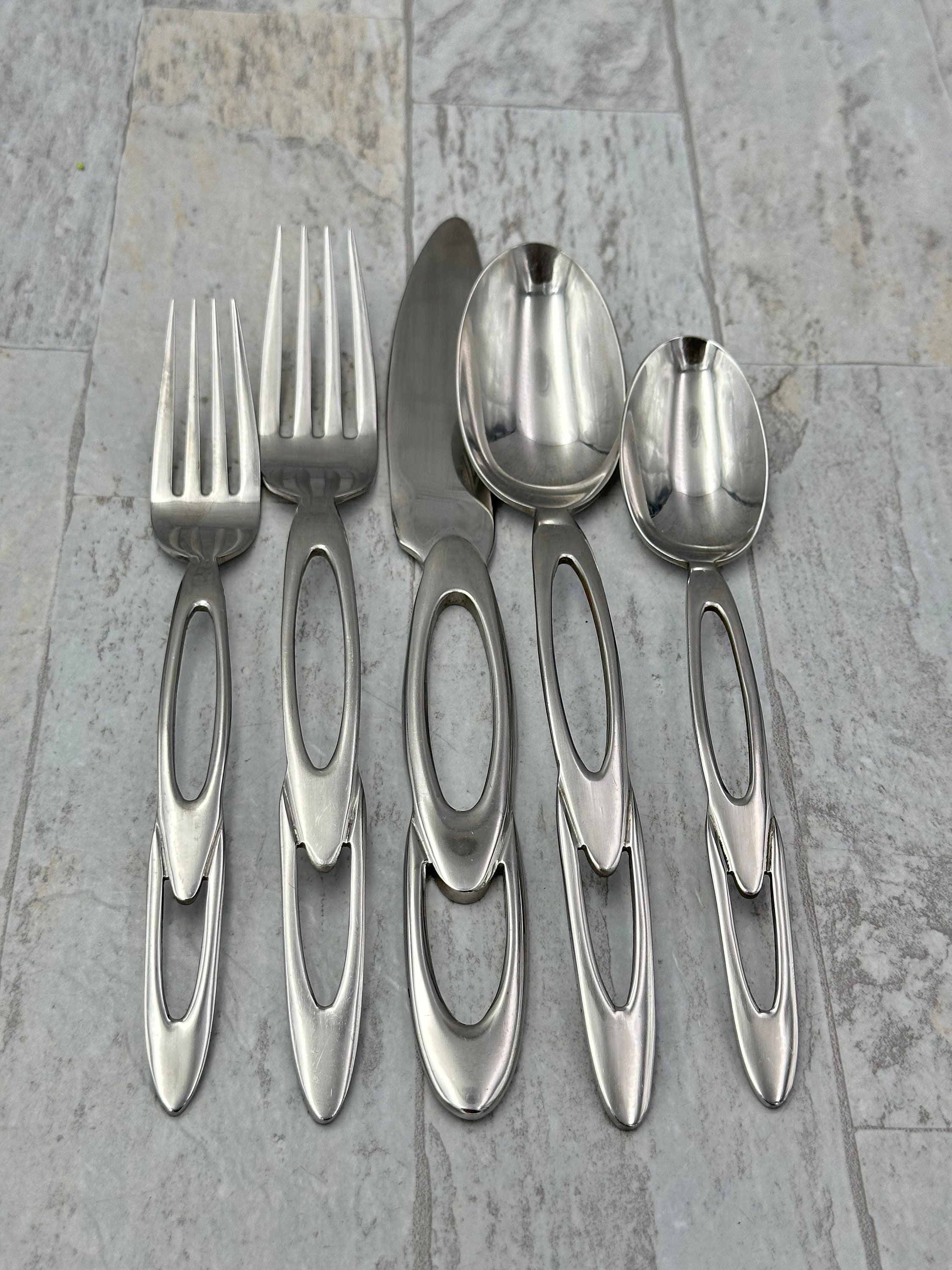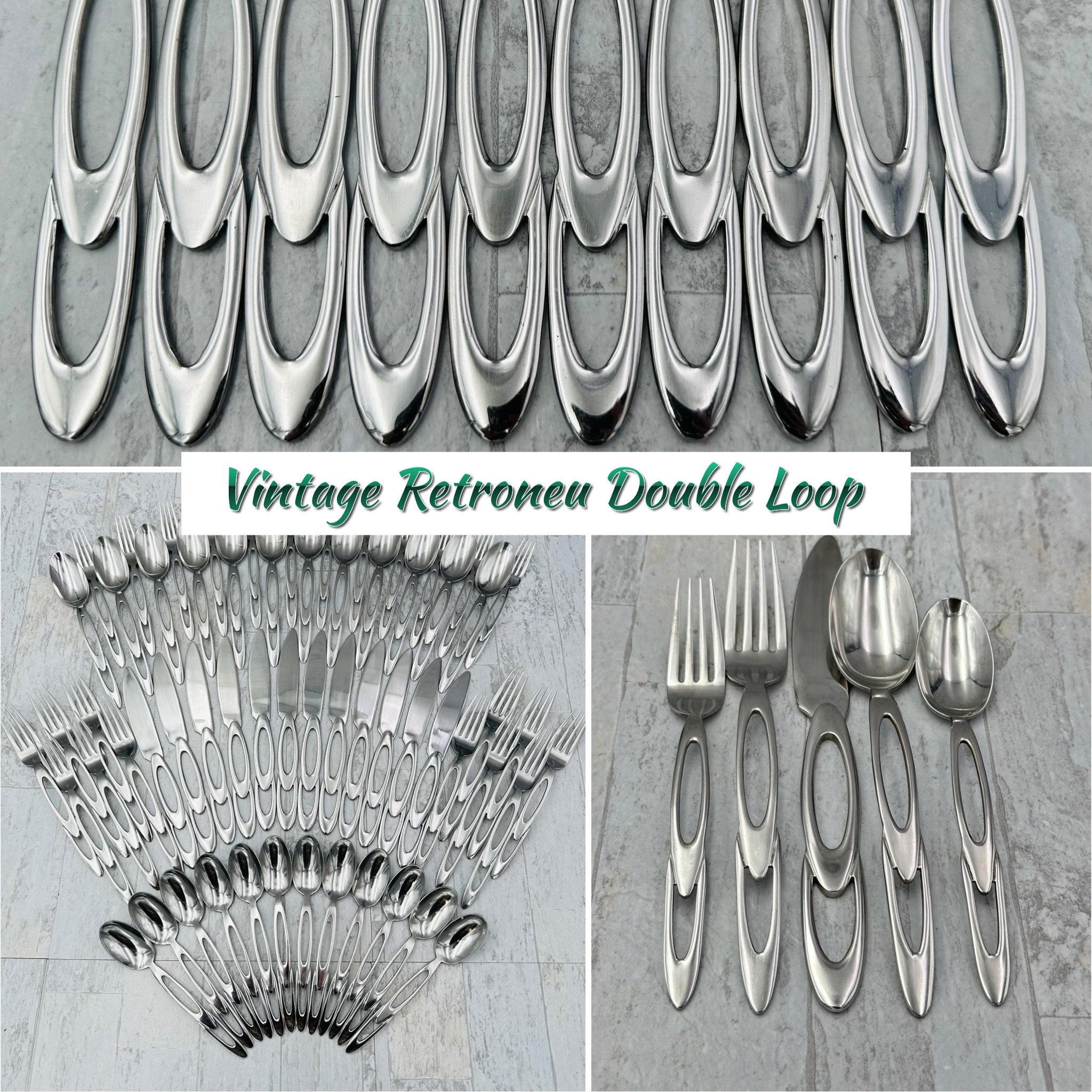 This set is a fabulous MOD Flatware Set in a Pattern Called Double Loop. It is by Retroneu. This is a Rare Vintage service for 12!