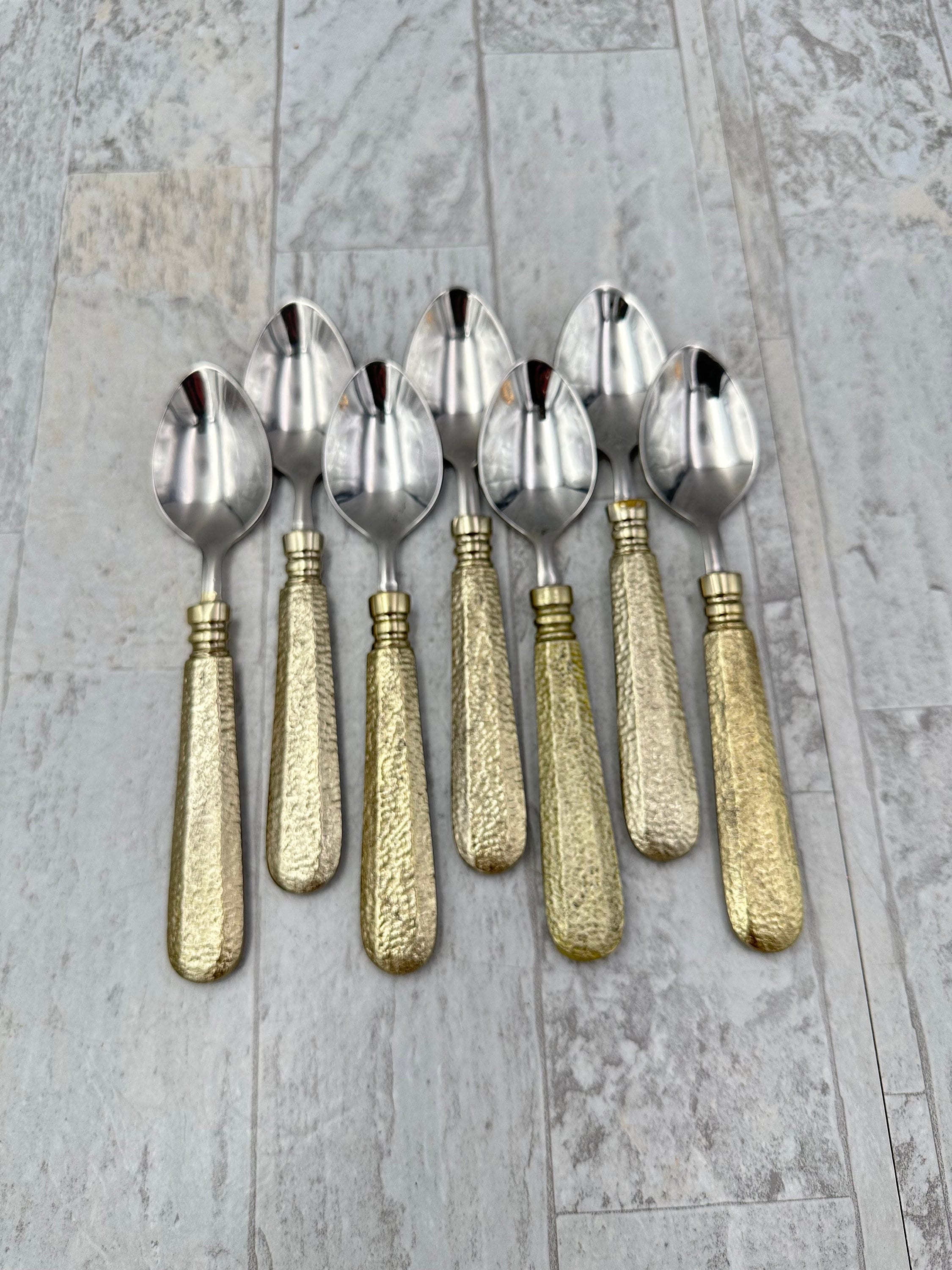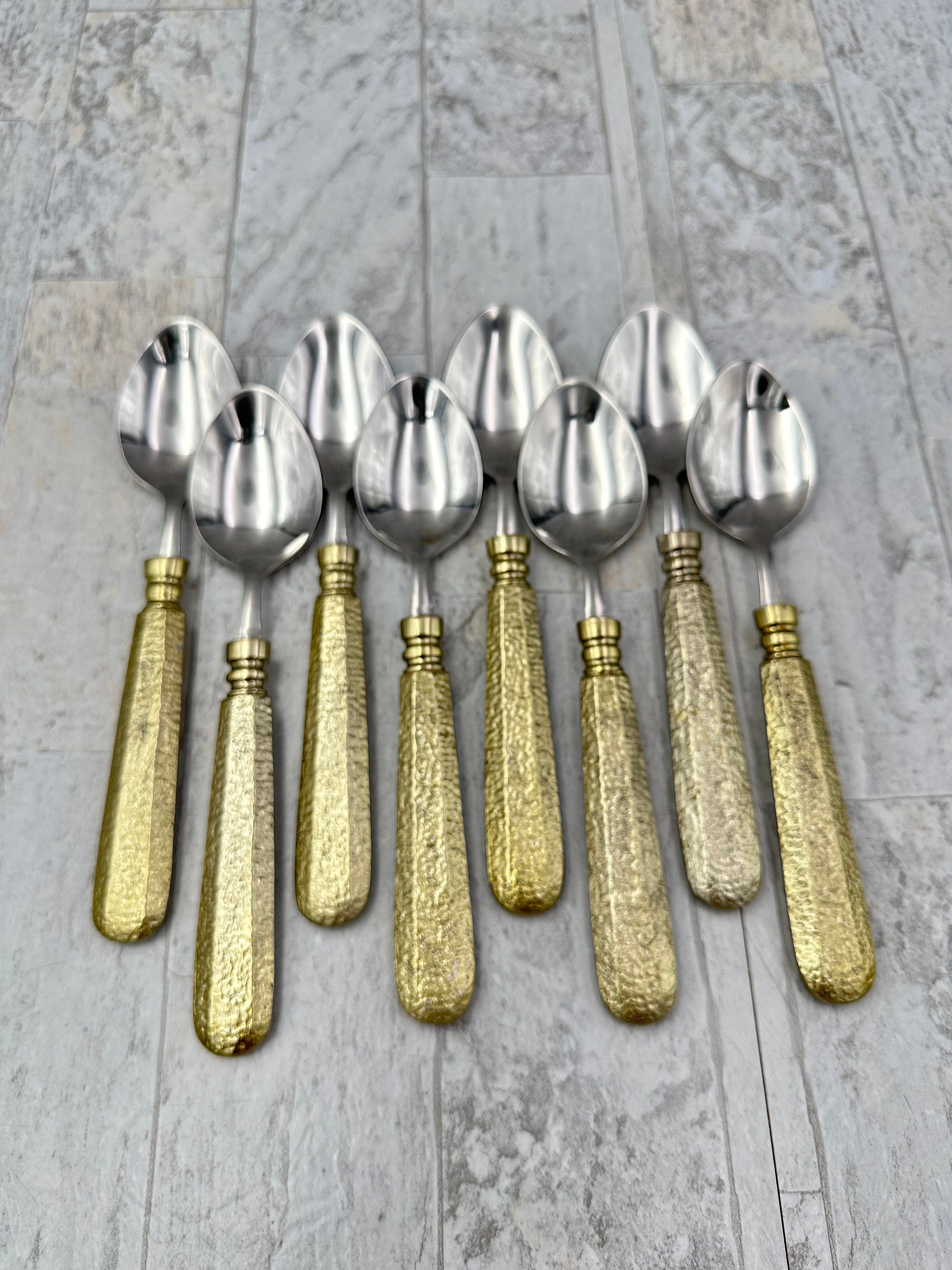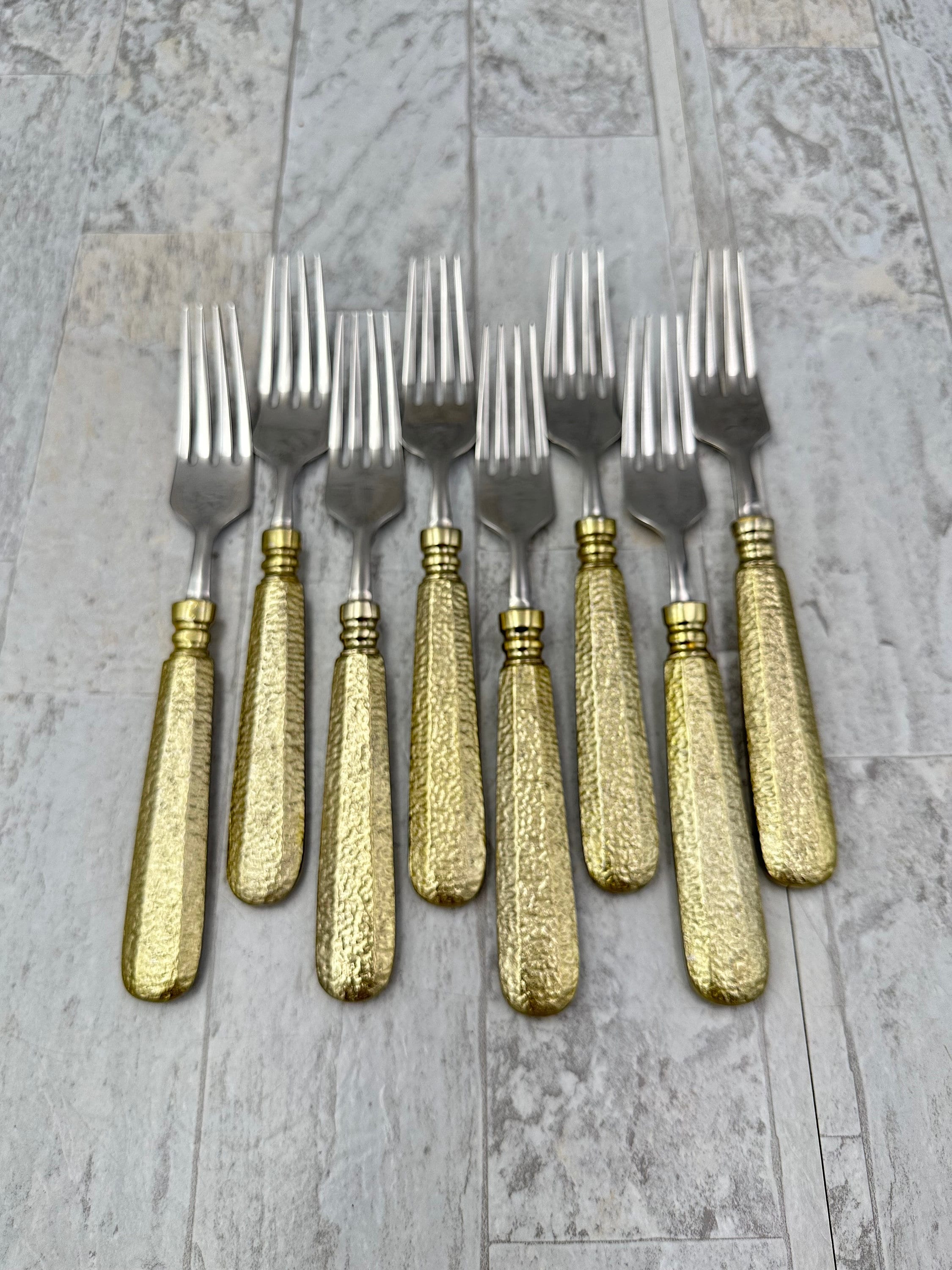 This unique set of flatware is in unused Vintage Condition. I love the way the Hammered pattern reflects the light. It gives off a stunning faceted golden glow.