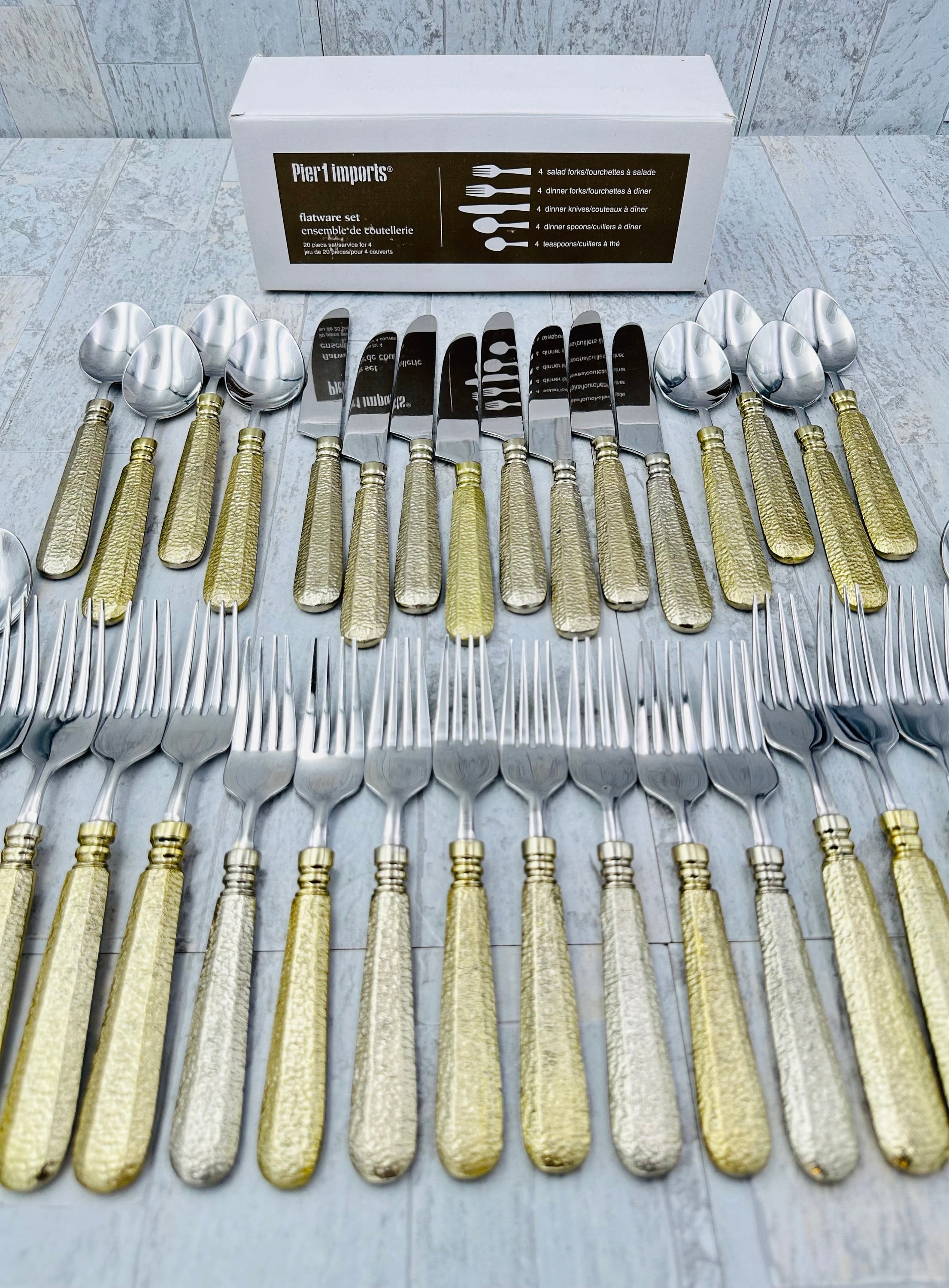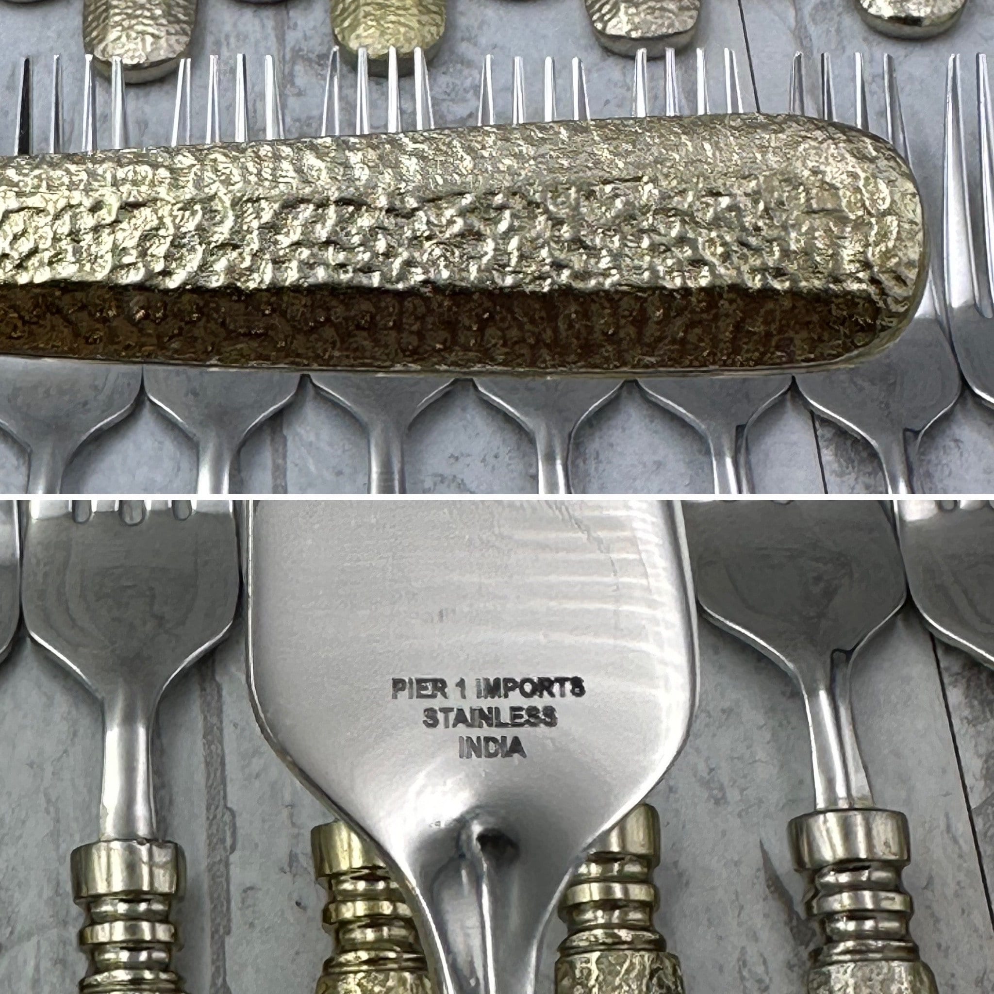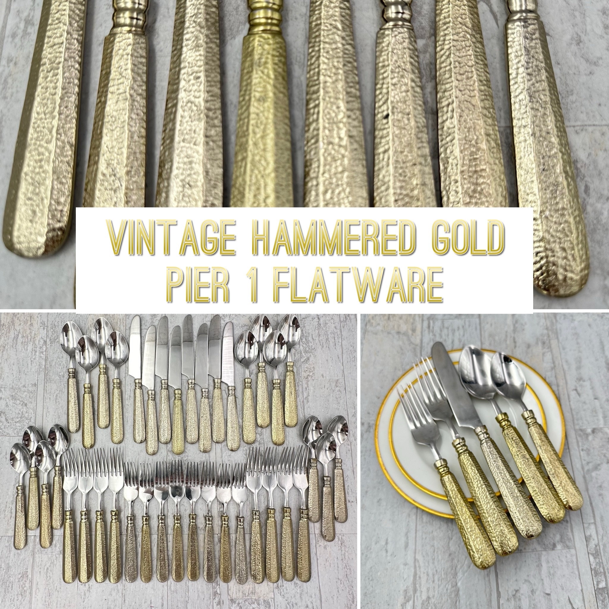 A Fabulous set of Cutlery by Pier 1. This is an amazing Rare set of Hammered Gold handles on Stainless Flatware. Gorgeous Stainless flatware with Gold tone handles on a stunning Hammered pattern.