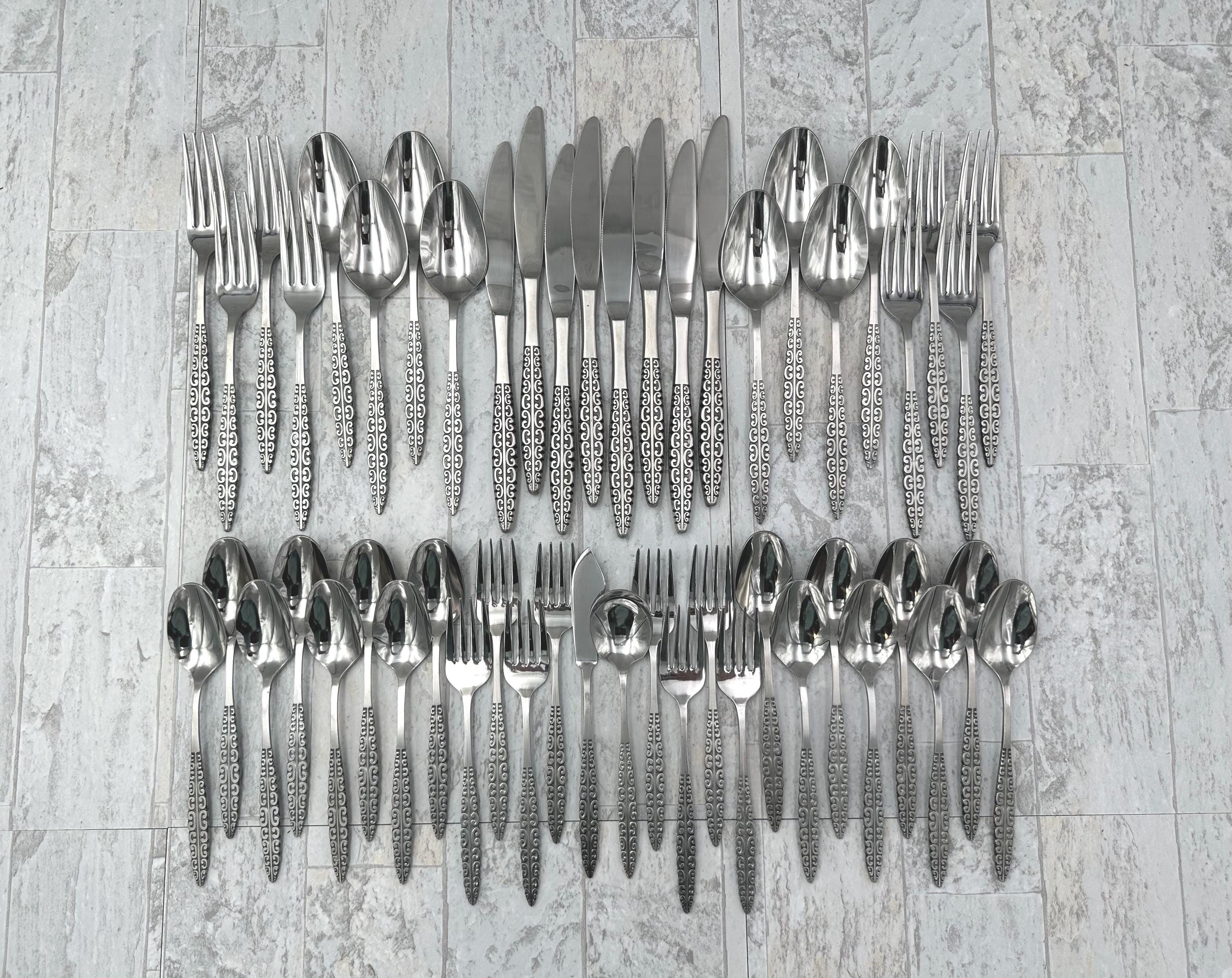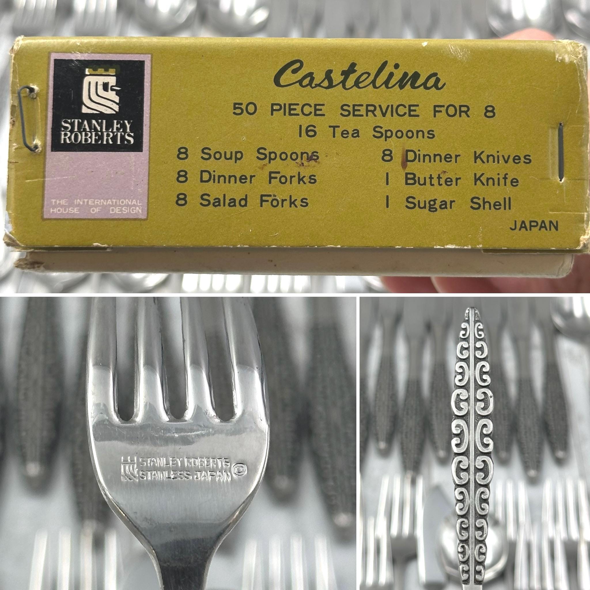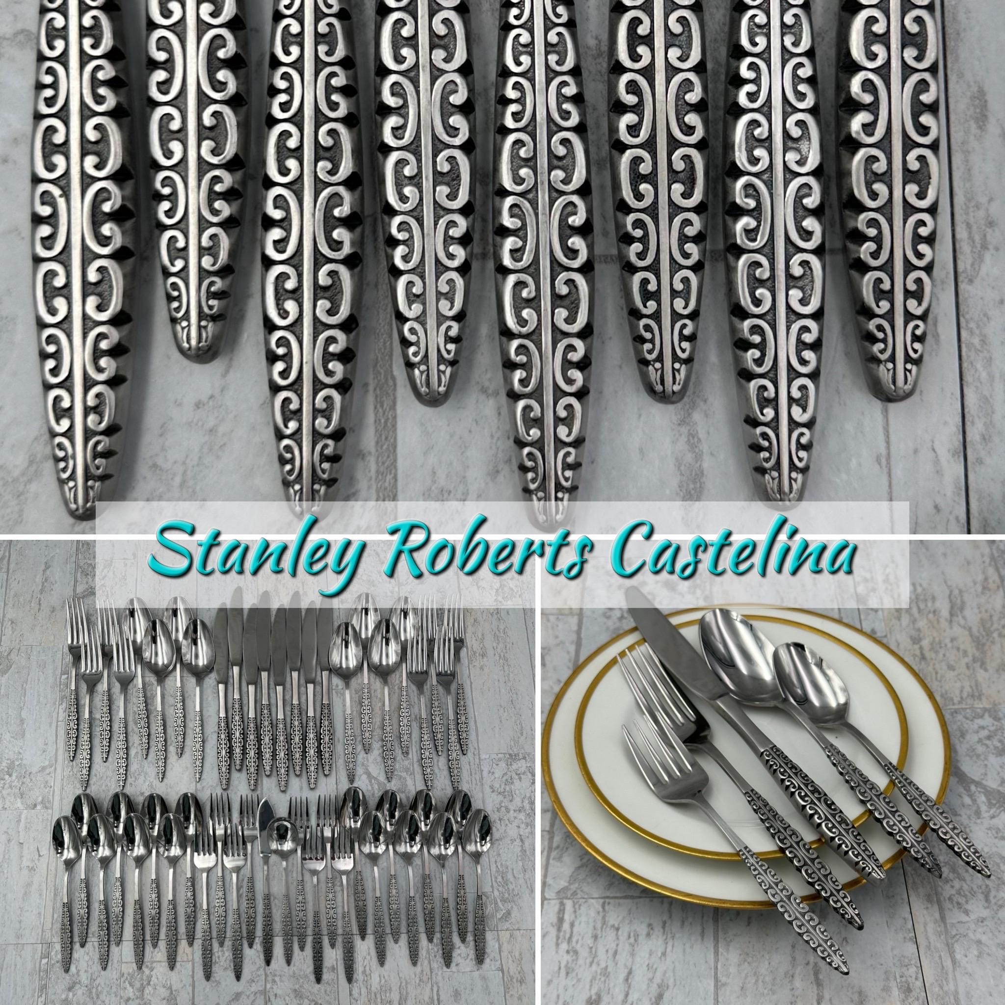 This is a RARE set of vintage Stainless Flatware in a MCM pattern called Castelina. This GORGEOUS flatware has a black accented handles with a satin stainless steel base.