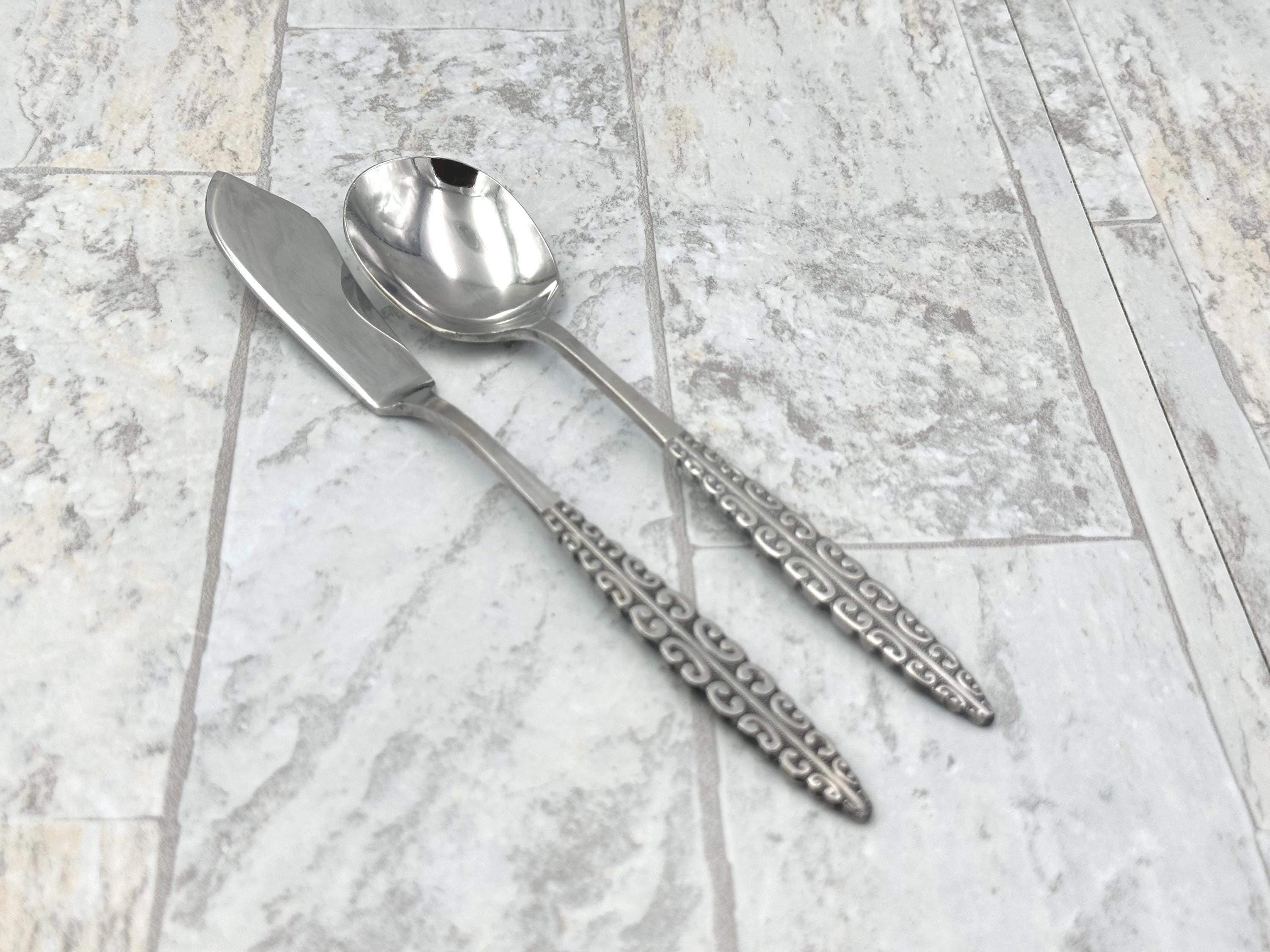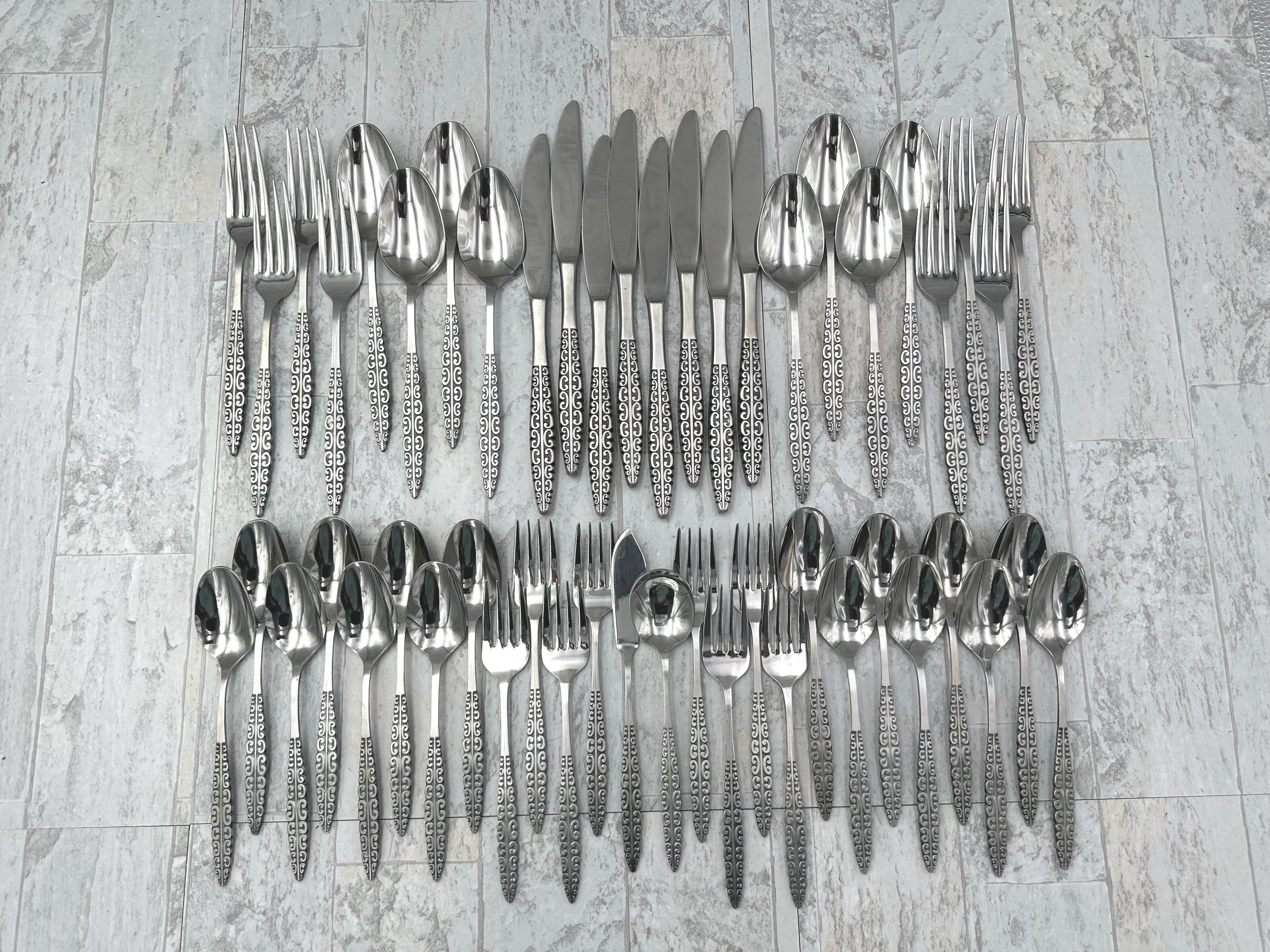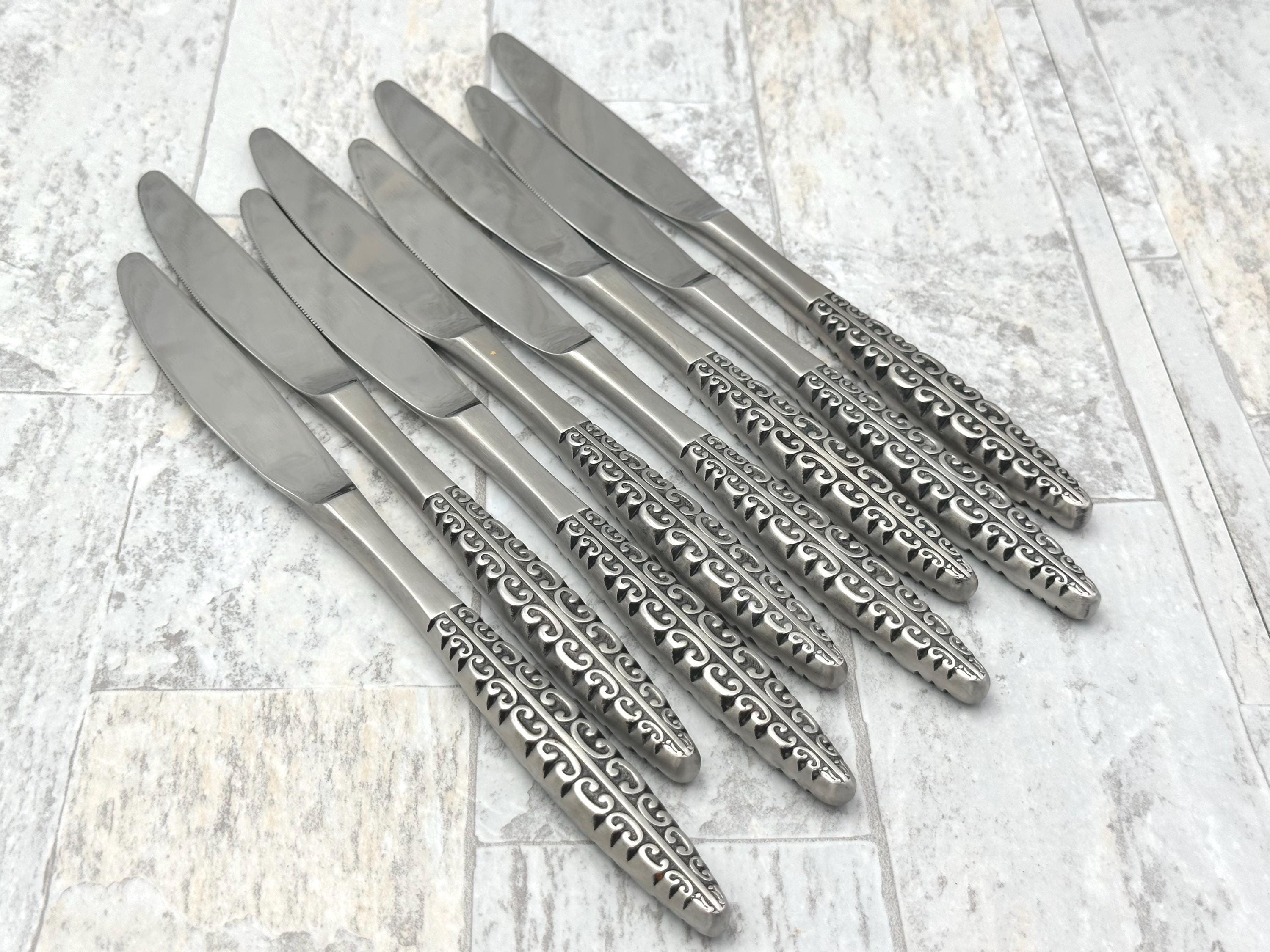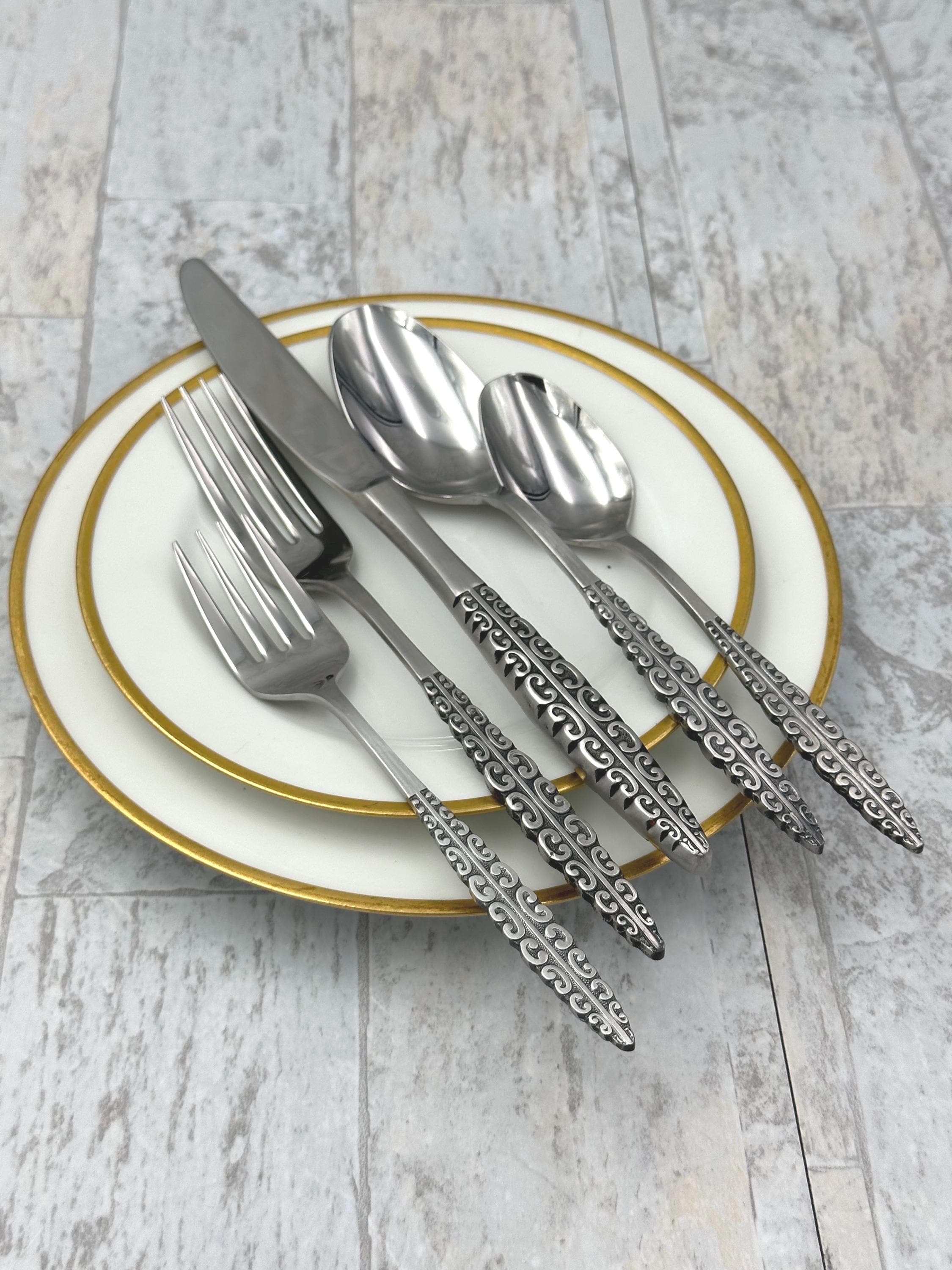 This is a RARE set of vintage Stainless Flatware in a MCM pattern called Castelina. This GORGEOUS flatware has a black accented handles with a satin stainless steel base.