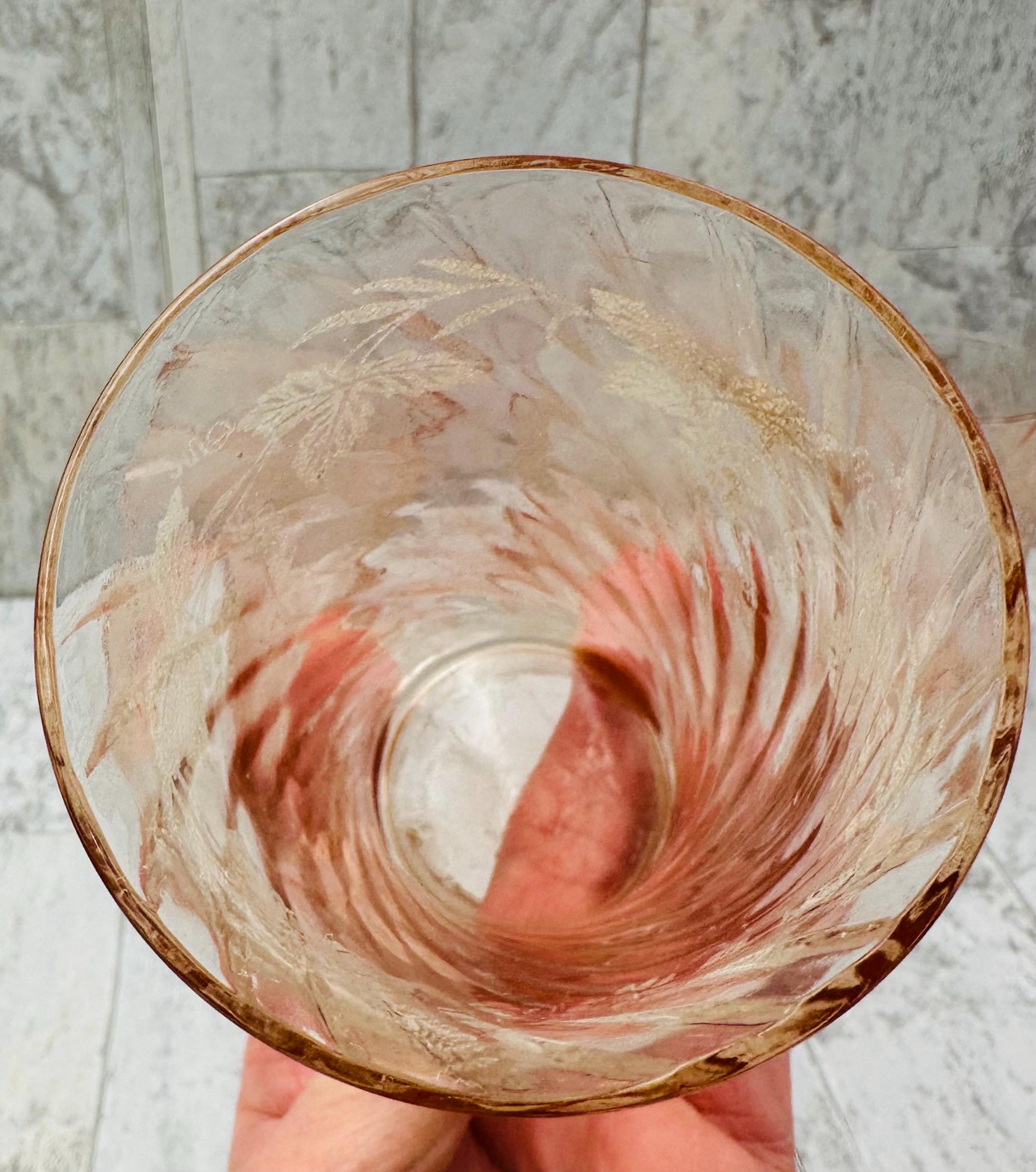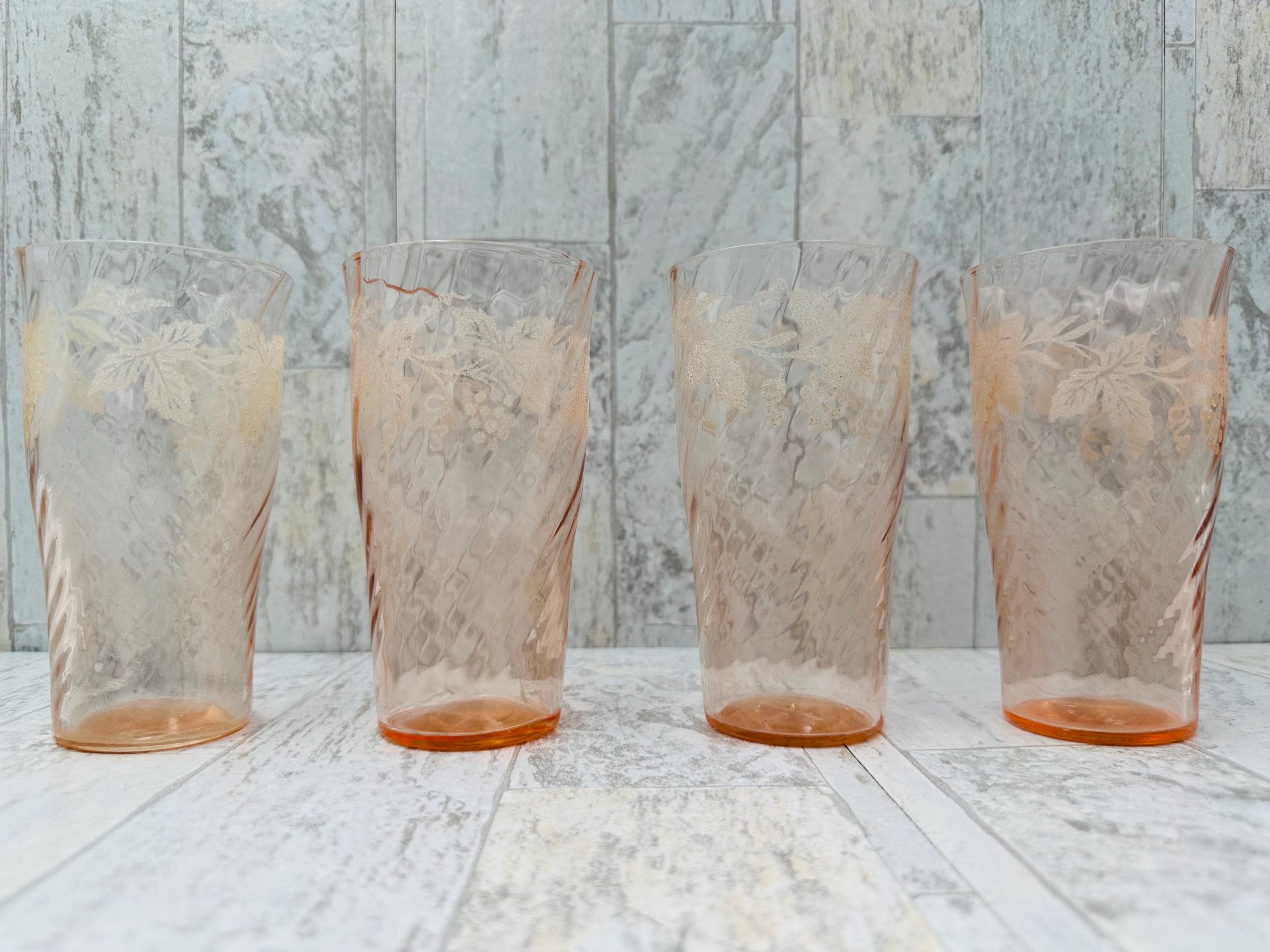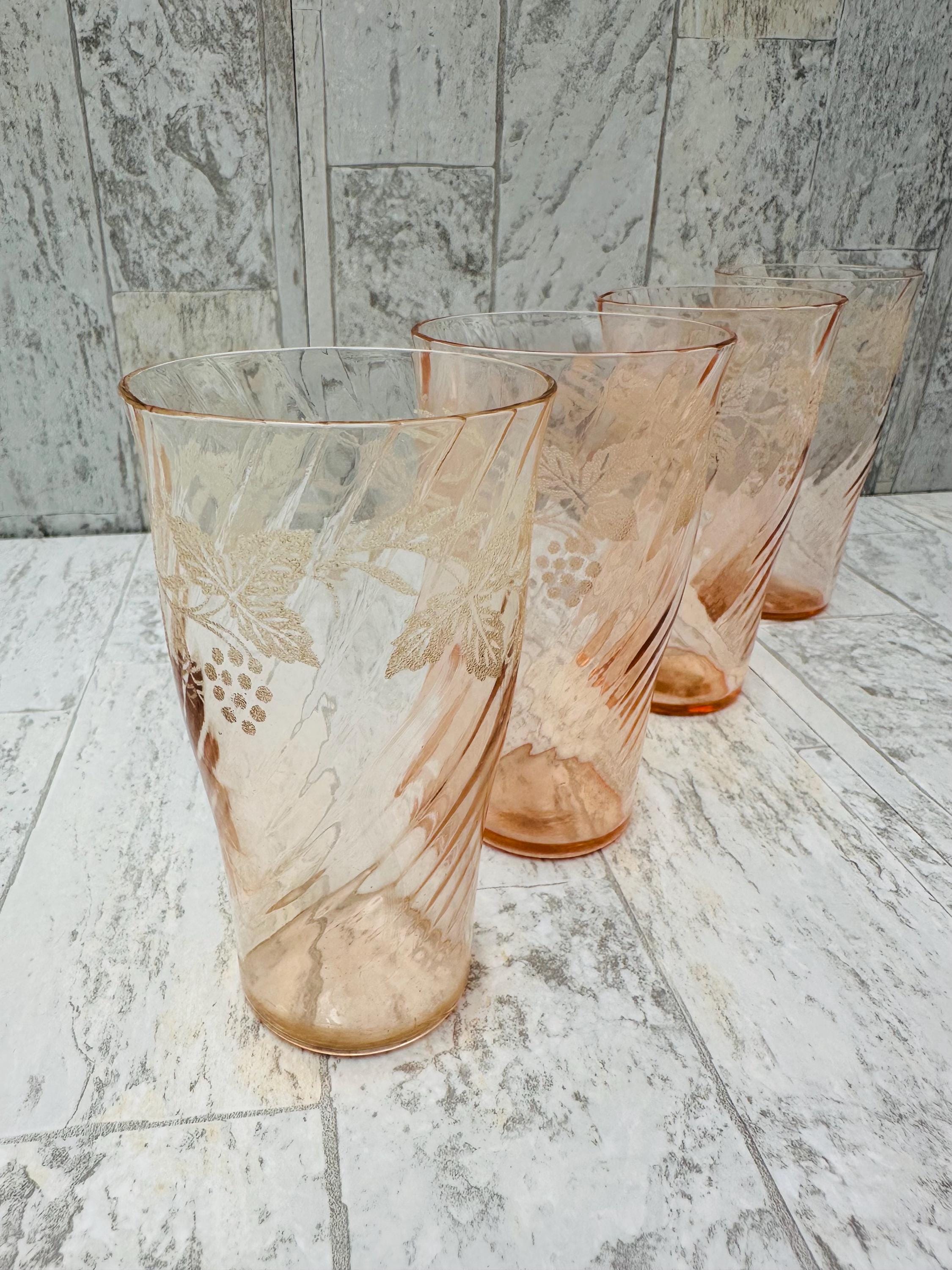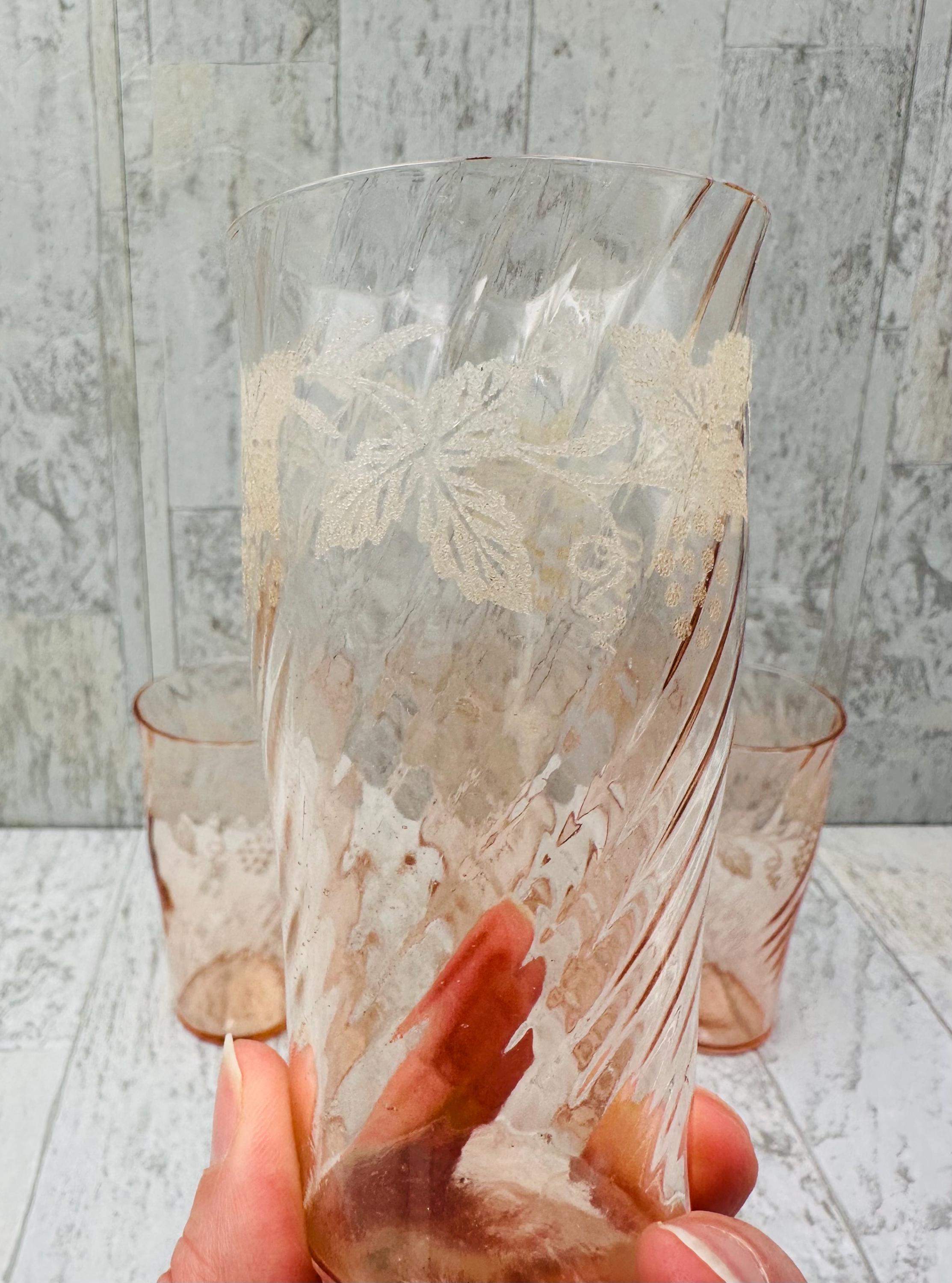 This is an elegant set of pink glasses. These glasses are very delicate, made of thin walled swirl glass, and are decorated with a lovely frosted grape and vine pattern.