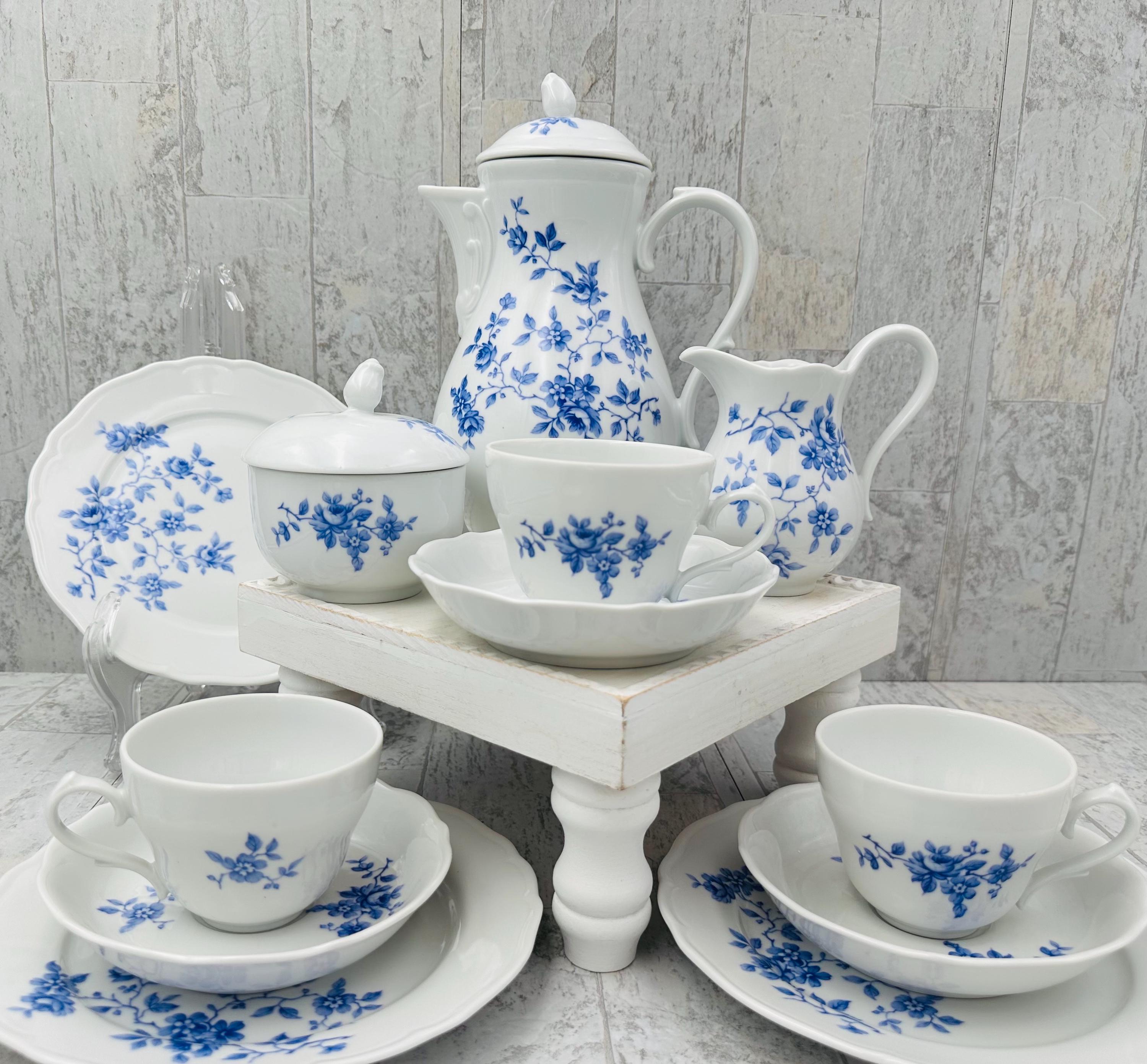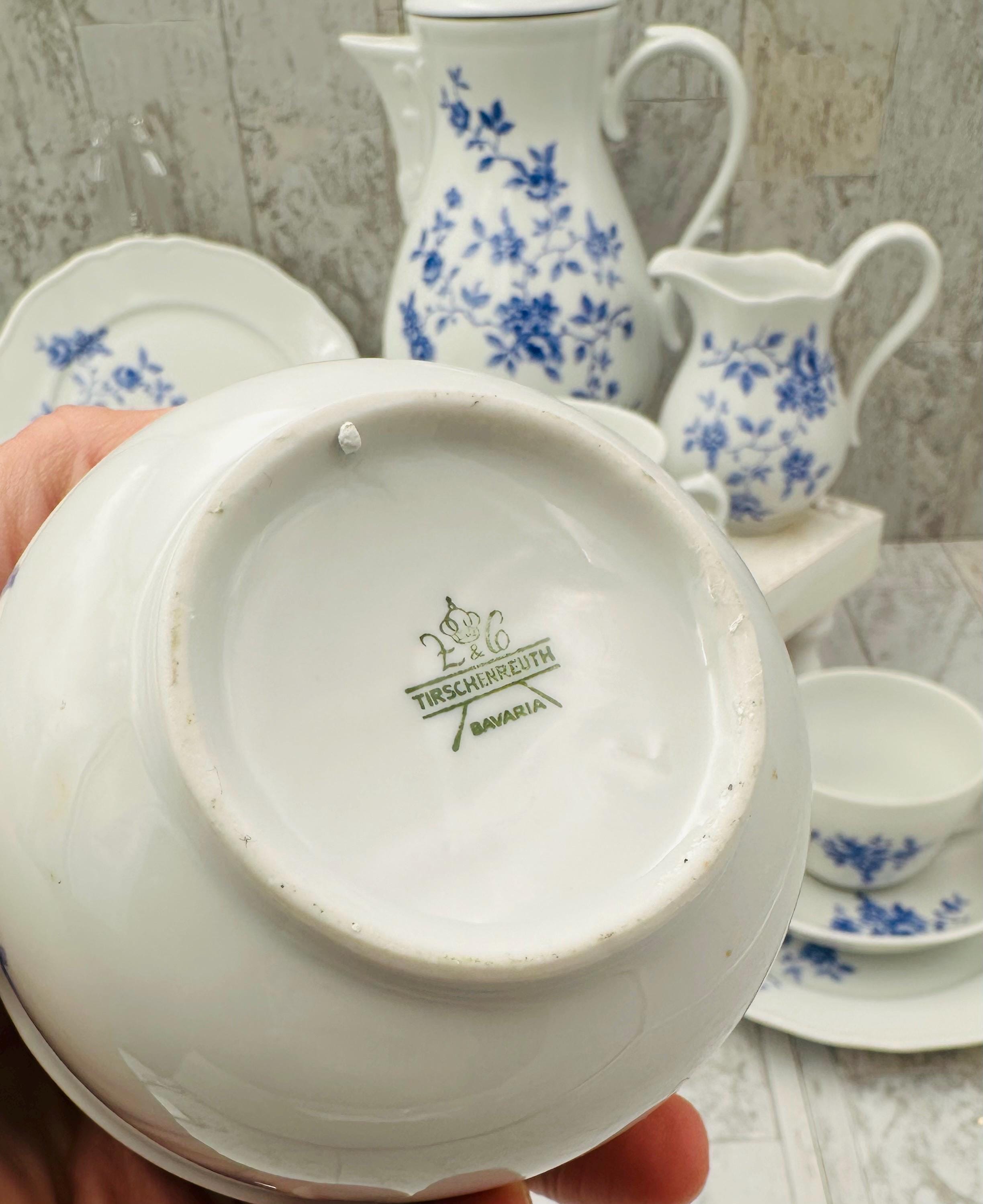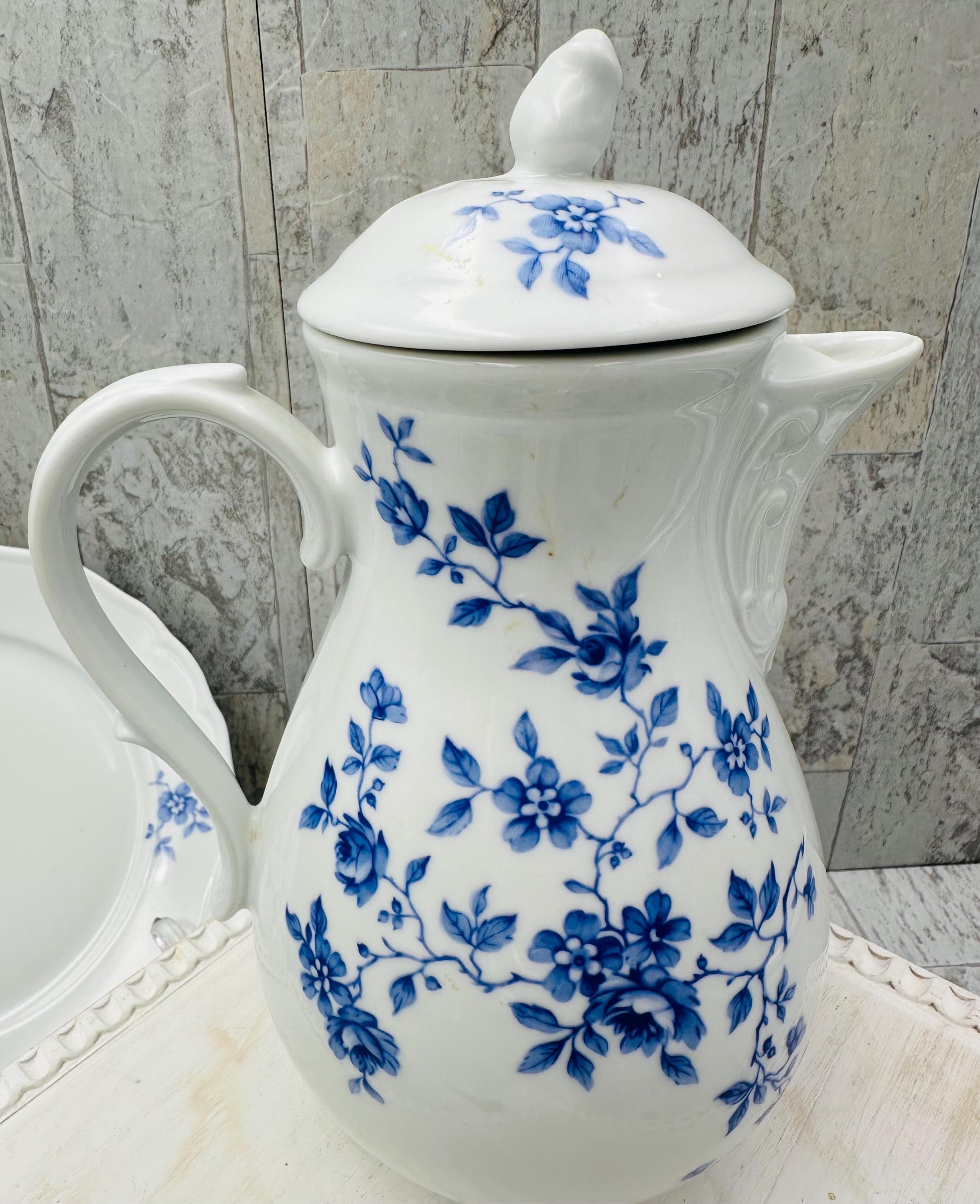 Rare Coffee Service by Tirschenreuth China in Bavaria. The timeless pattern of the lovely blue and white flowers is accented by embossed scrolls and scalloped edges. The Tirschenreuth mark on the bottom.