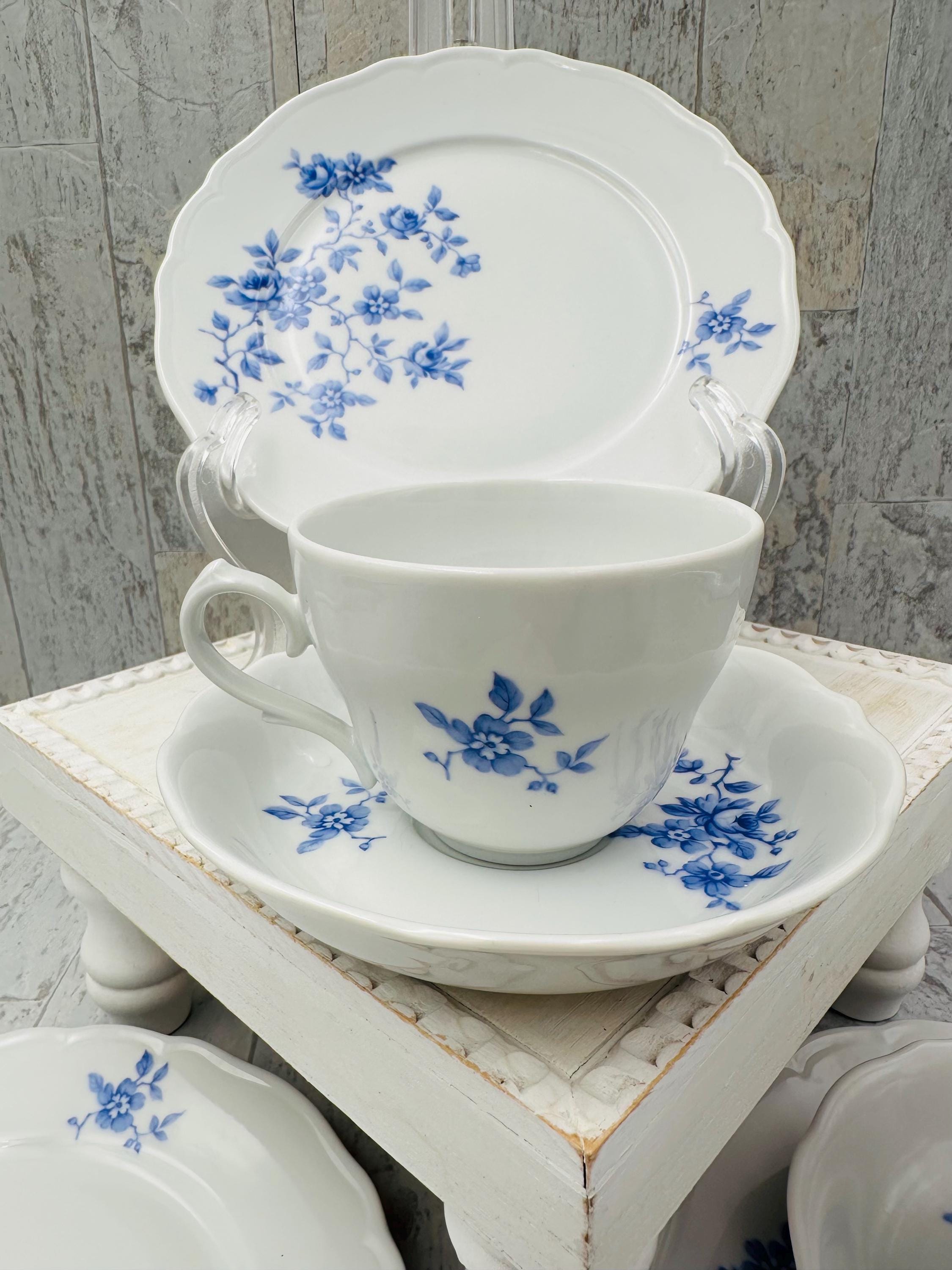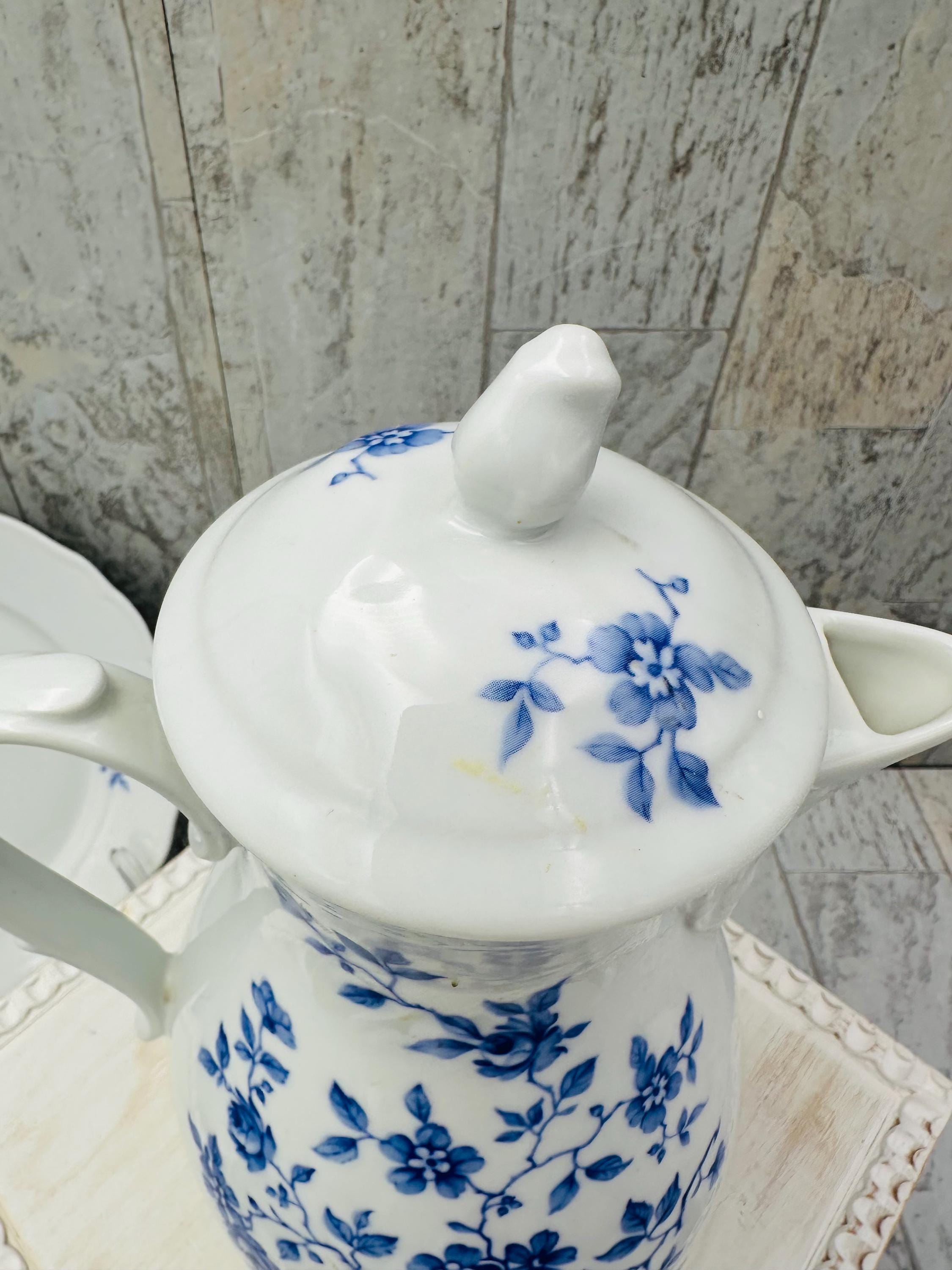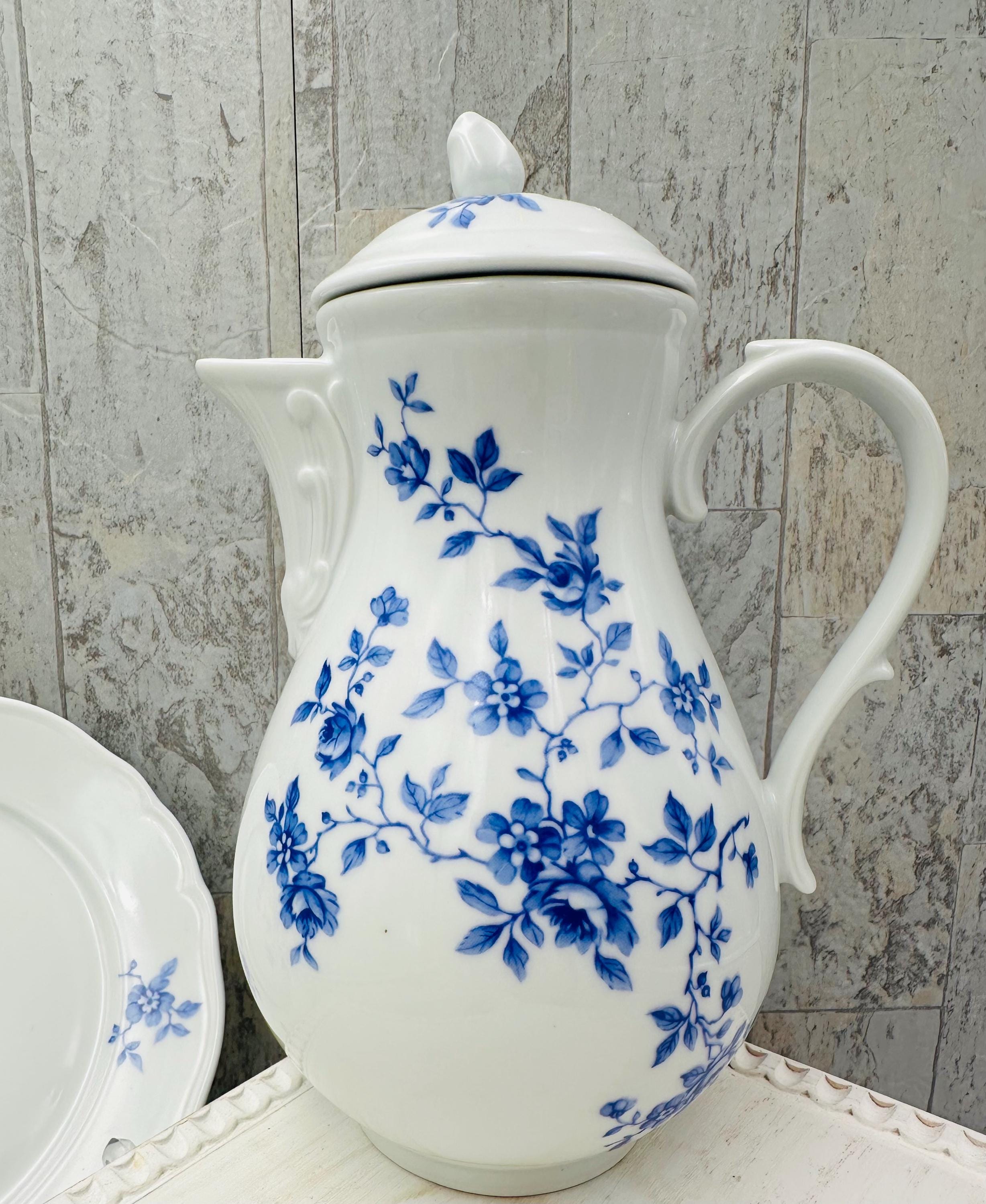 Rare Coffee Service by Tirschenreuth China in Bavaria. The timeless pattern of the lovely blue and white flowers is accented by embossed scrolls and scalloped edges. The Tirschenreuth mark on the bottom.