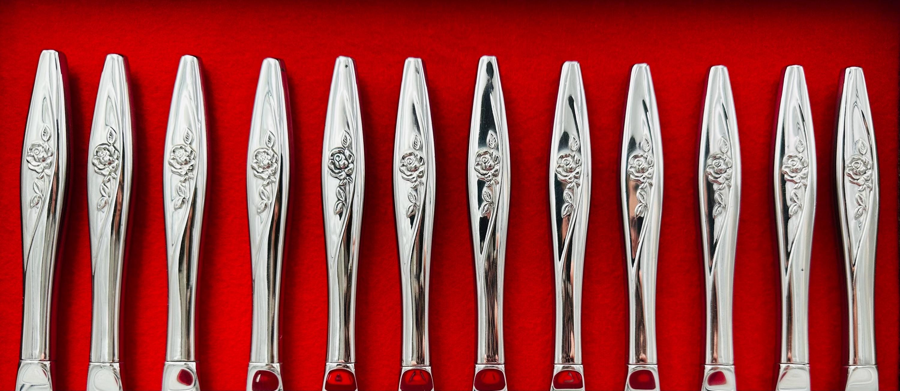 I love the pattern of this vintage set of Stainless steel Flatware by Oneida Deluxe stainless. An Embossed single Rose design graces the handle of each glossy piece. This pattern was introduced in 1968 and has since been discontinued. It is unusual to find a complete set in the original Chest, and in excellent condition!