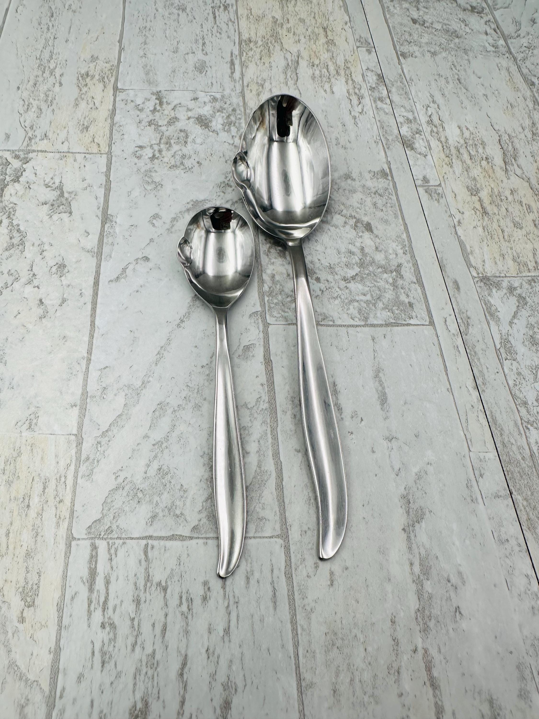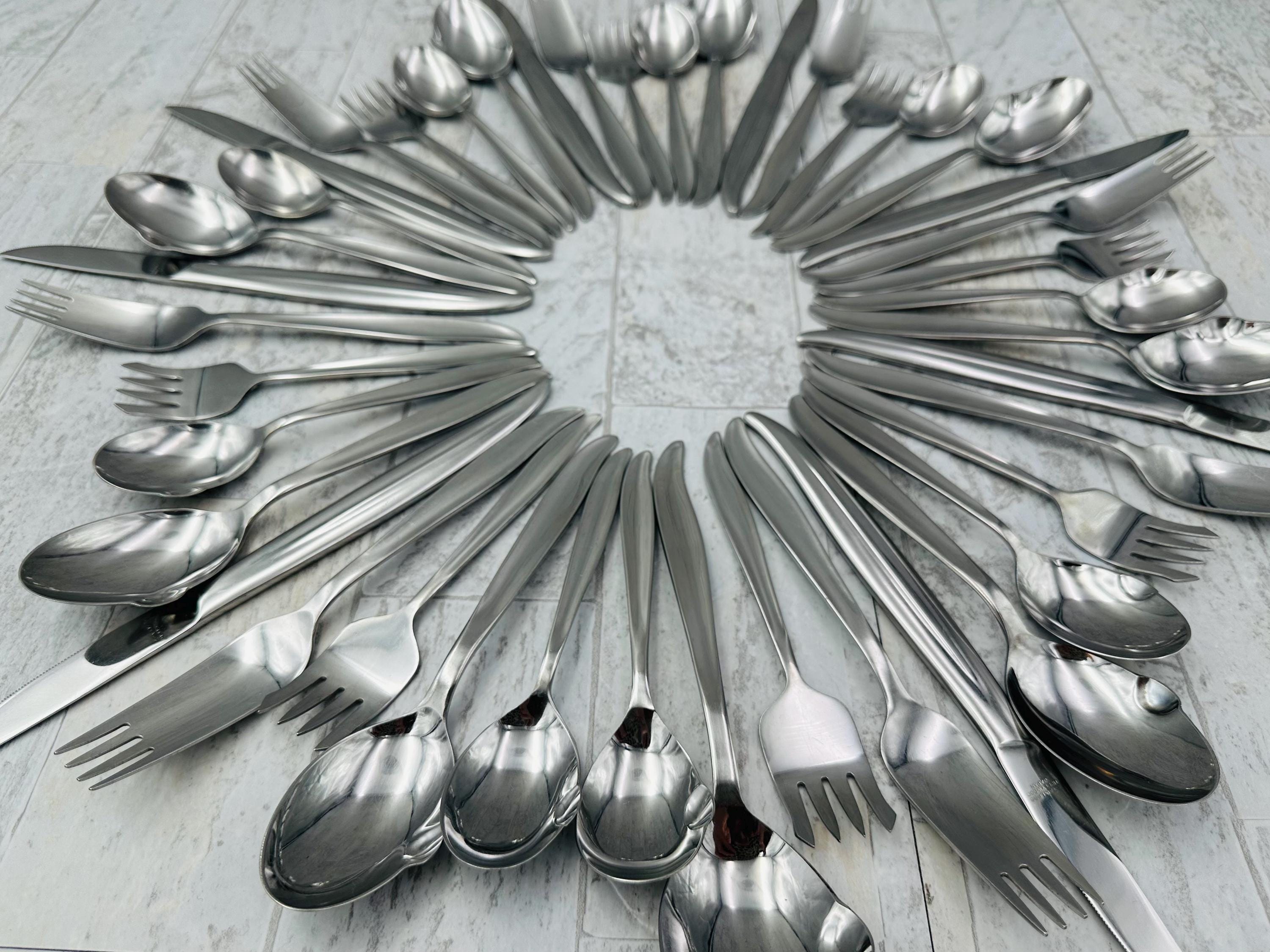 This set is a fabulous MOD Flatware Set in a Pattern Called Hollywood. I love the unique design of the forks. They have a mod bowl ending in tines. The salad forks also have a unique shape. All of the spoons have a small lip like a ladle on the side. So unique. This is the Rare Vintage set made in Japan!