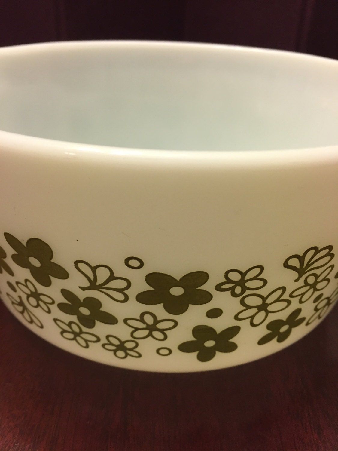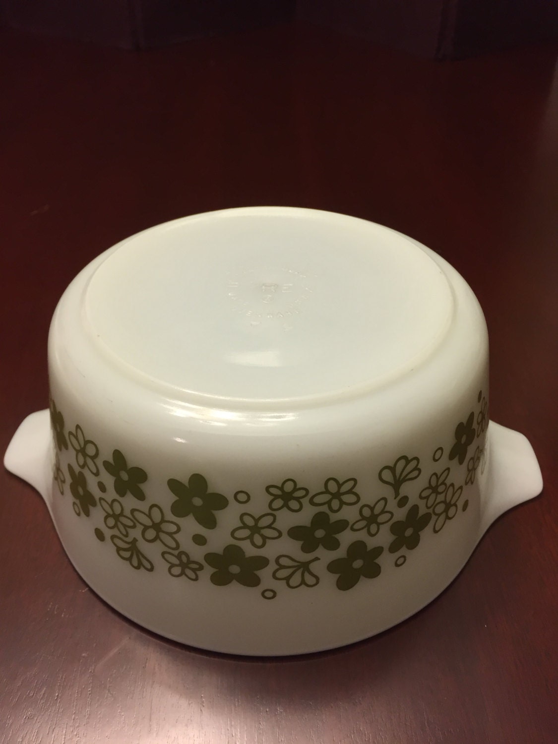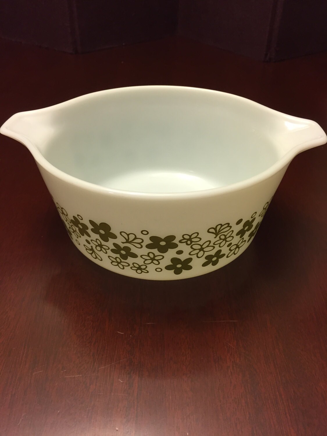 VIntage Pyrex Spring blossom green - Crazy Daisy casserole/spacesaver Bowl with Cinderella spouts and handles. In the retro avocado green from the 1970s.