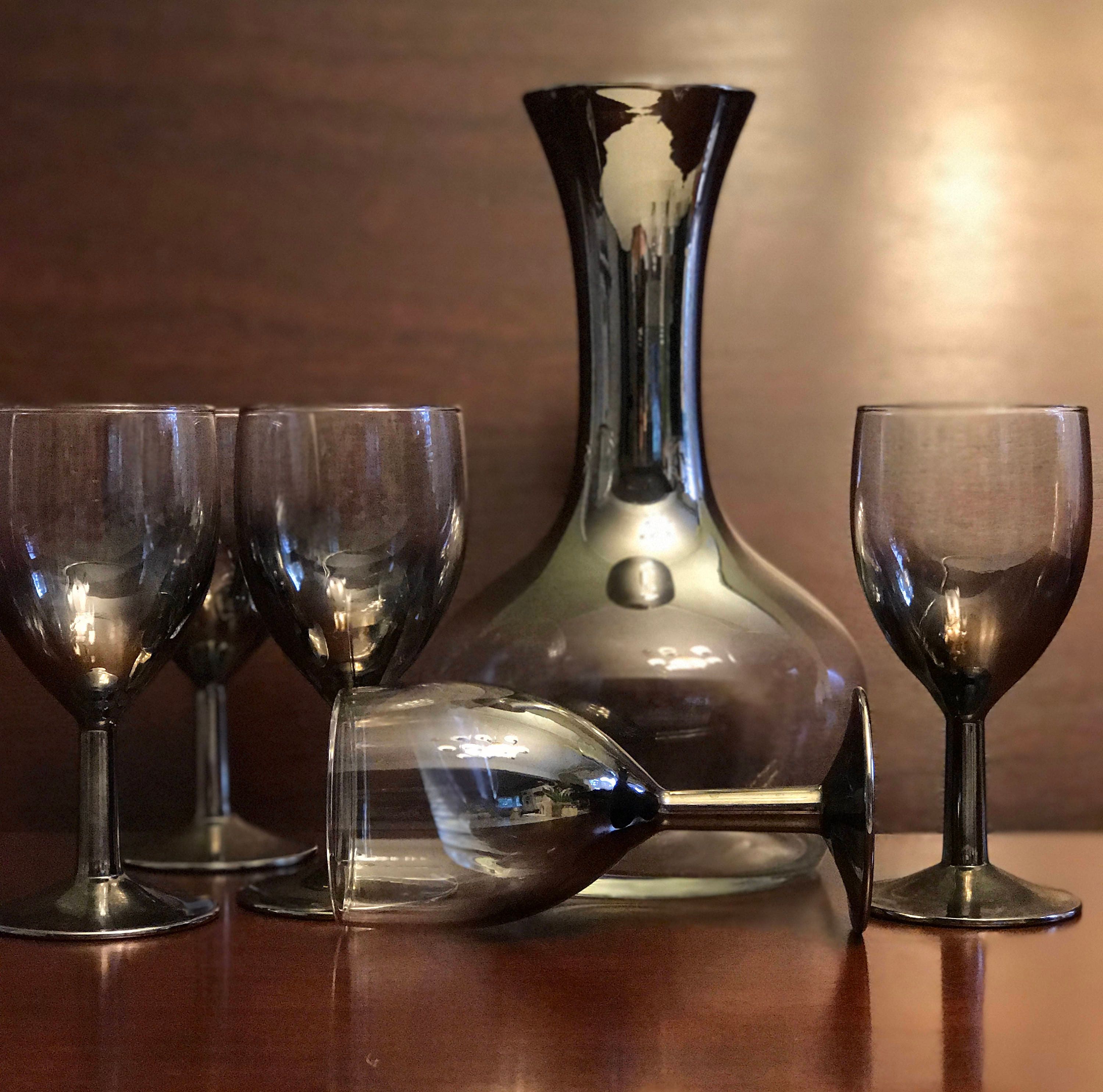 Mid Century Ombre Silver Fade Carafe Decanter and Wine glass set. This is a beautiful Mid Century Carafe and Glass set in the style made popular by Designer Dorothy Thorpe. This lovely set no longer has any identifying stickers, and it is not possible to identify the maker.