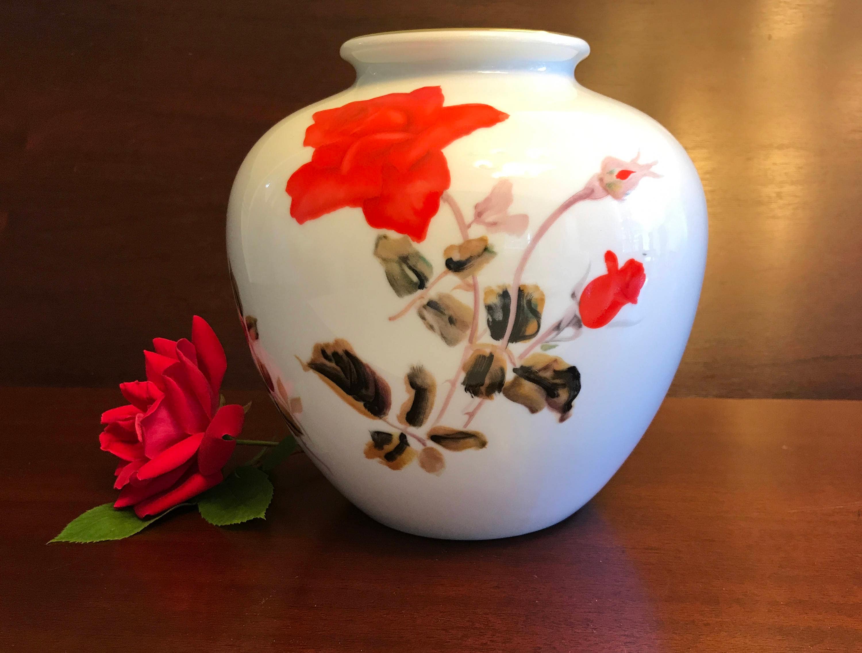 This lovely white vase is decorated with large red roses and leaves and branches.