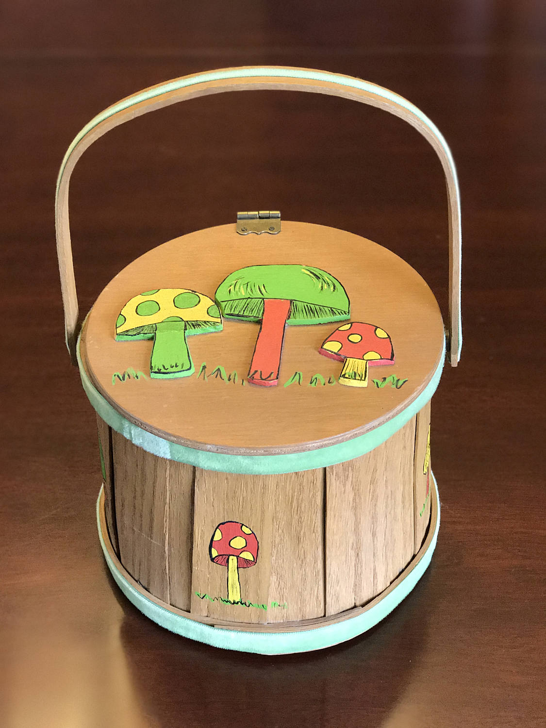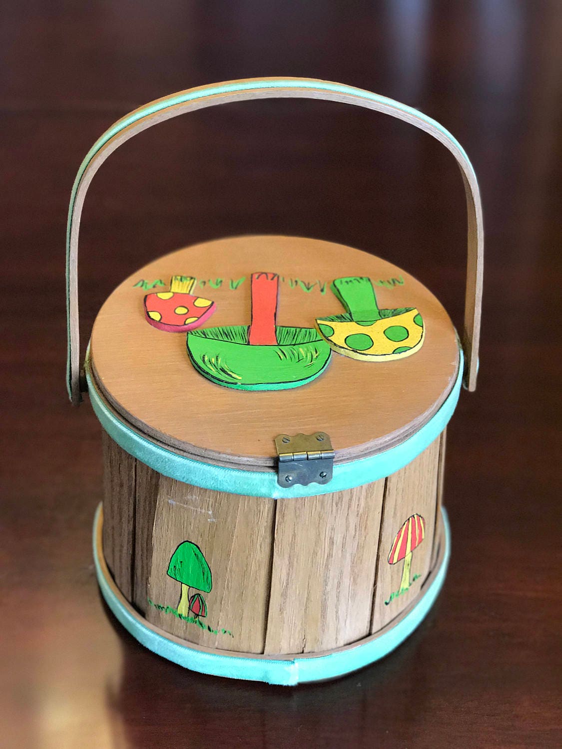 Original Vintage Basketville Pitney, Vermont Box Purse. Very retro! Painted Mushroom cut outs adorn this purse. This purse is Marked Basketville Putney Vermont on the bottom