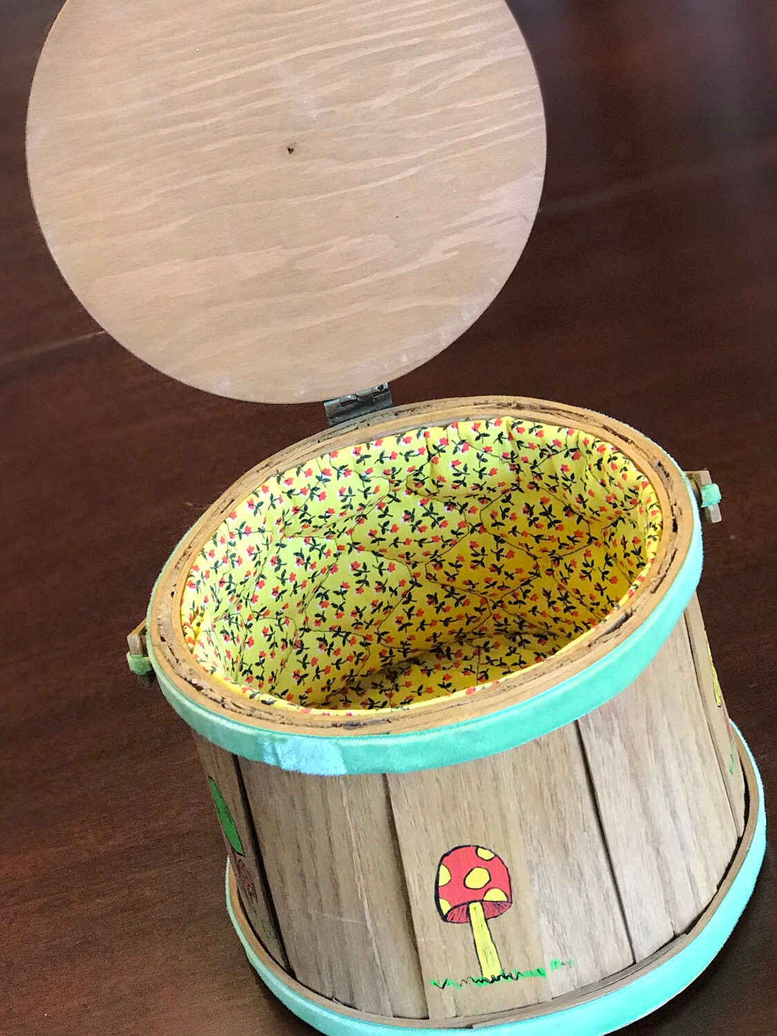 When you open the little hinged lid to peer in yellow quilted fabric with tiny orange flower lines the inside.