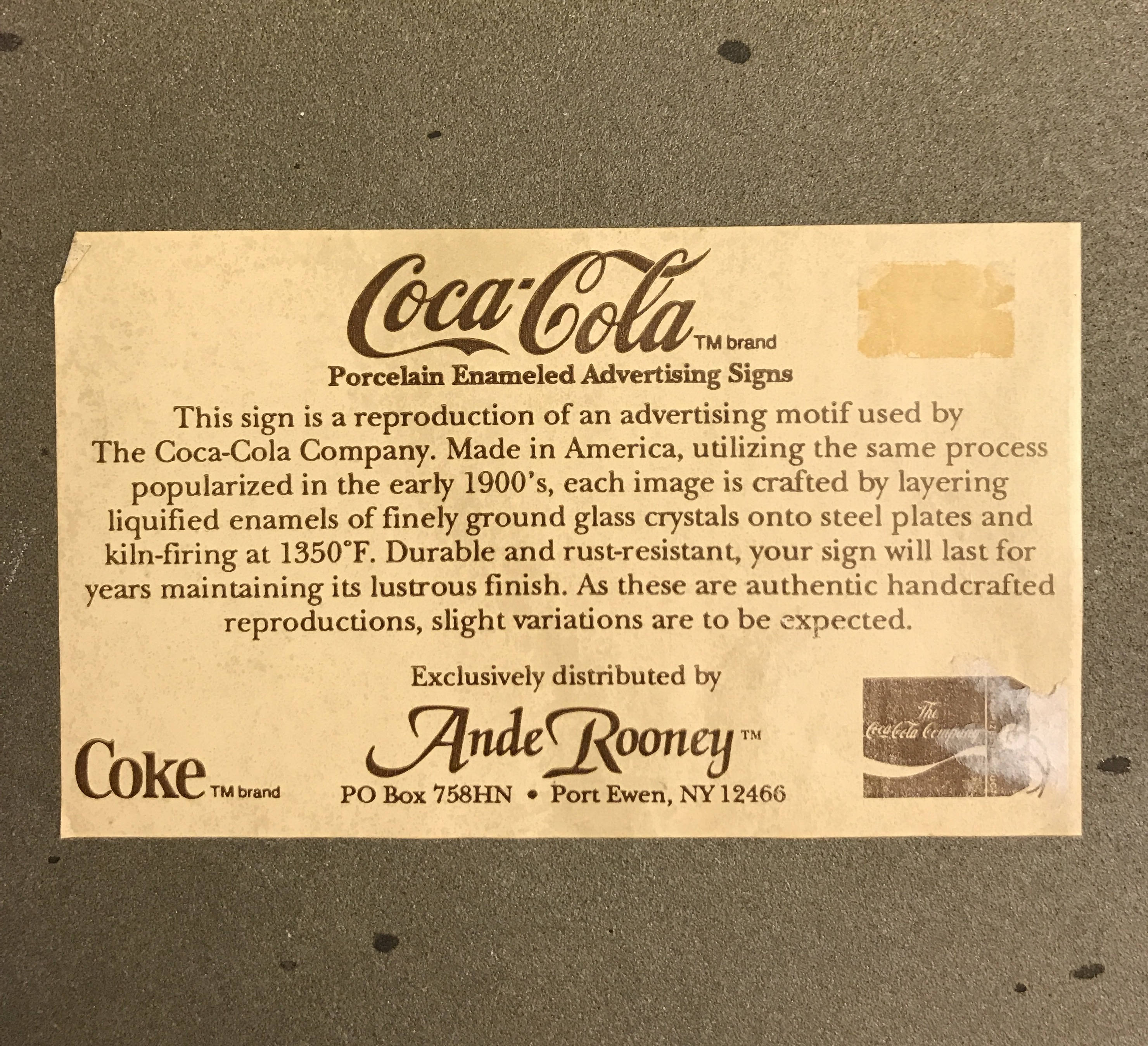 This is a highly collectible Ande Rooney Co. Sign. This sign is reproduced using the same technique of fusing porcelain to steel that was used in the early 1900s. This collectible Reproduction advertisement to "Drink Coca-Cola" would make a great addition to any room decor.
