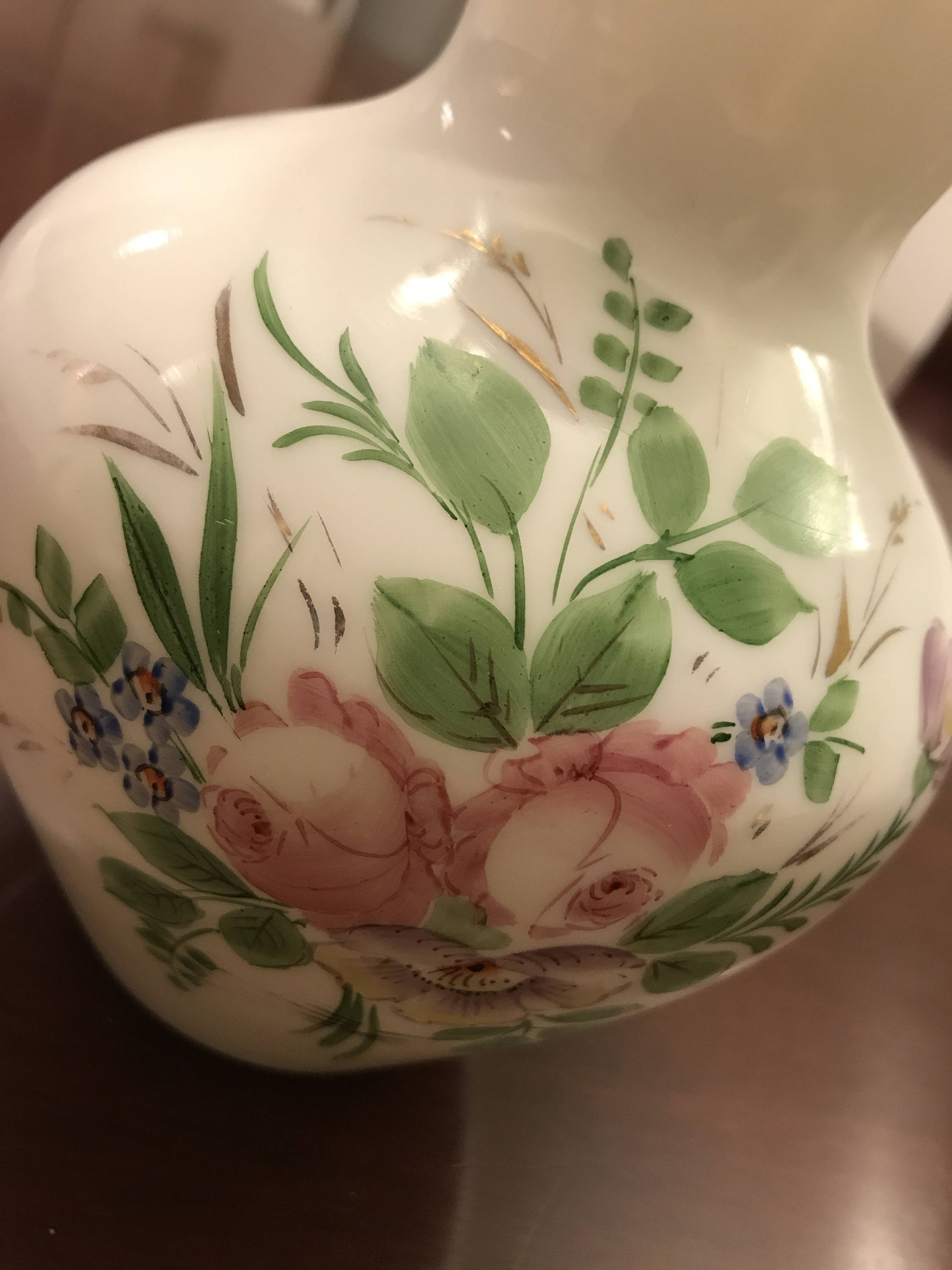 Beautiful Westmoreland Glass Vase. Lovely milk opal glass with Handpainted floral bouquet in pinks, purple, blue, yellow and soft leaf green.