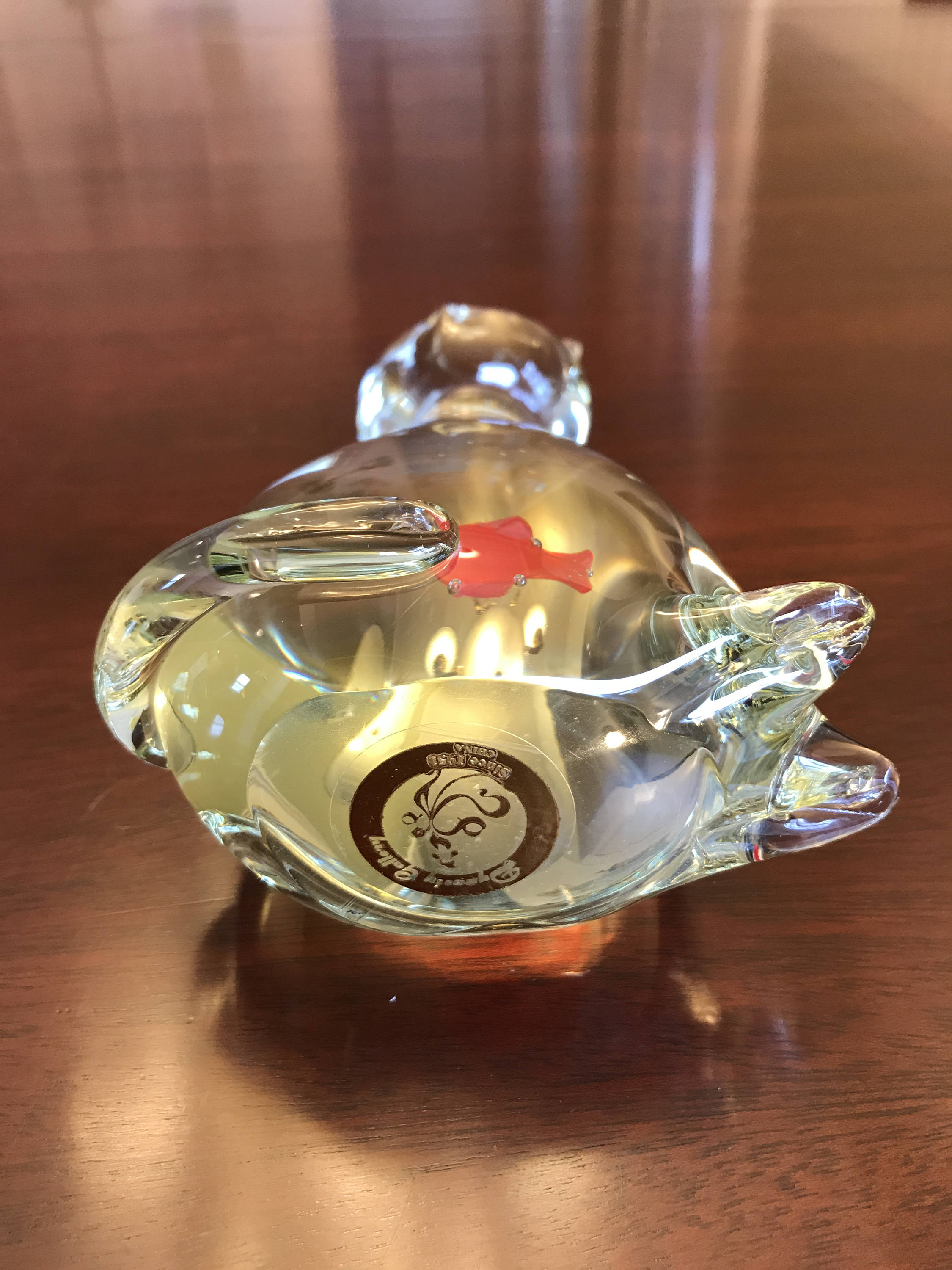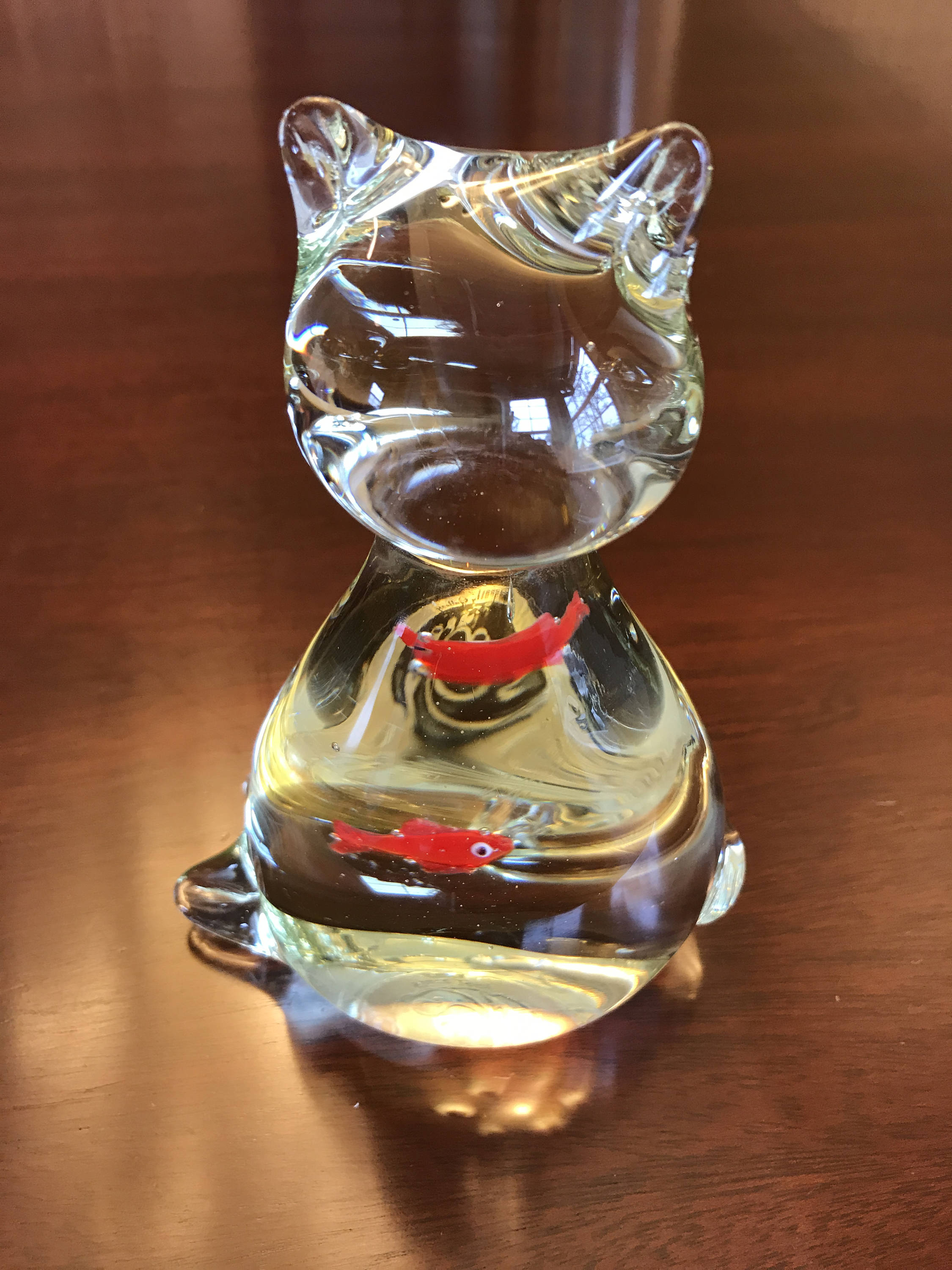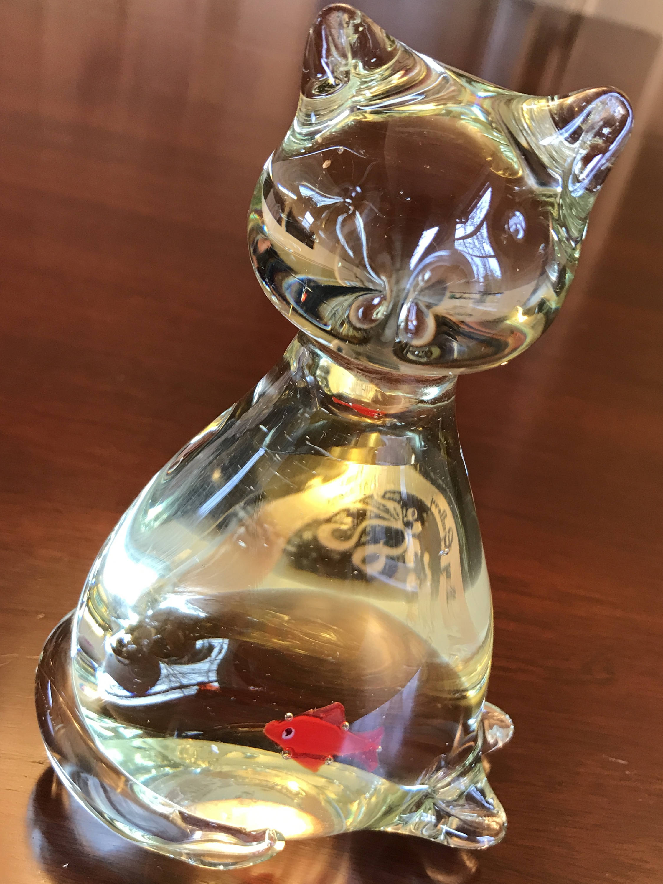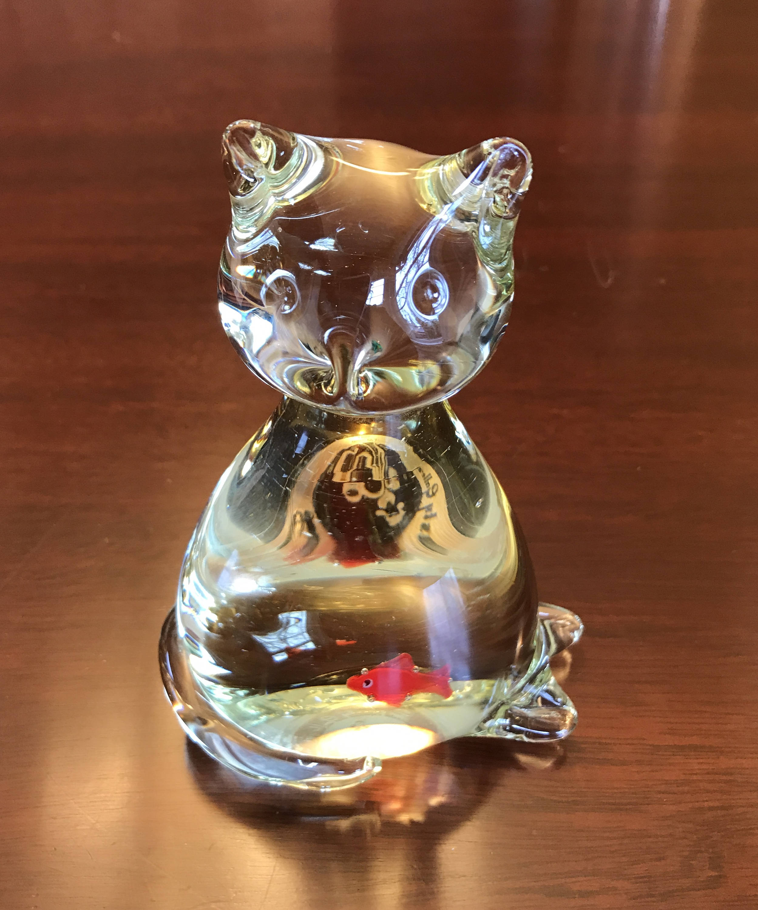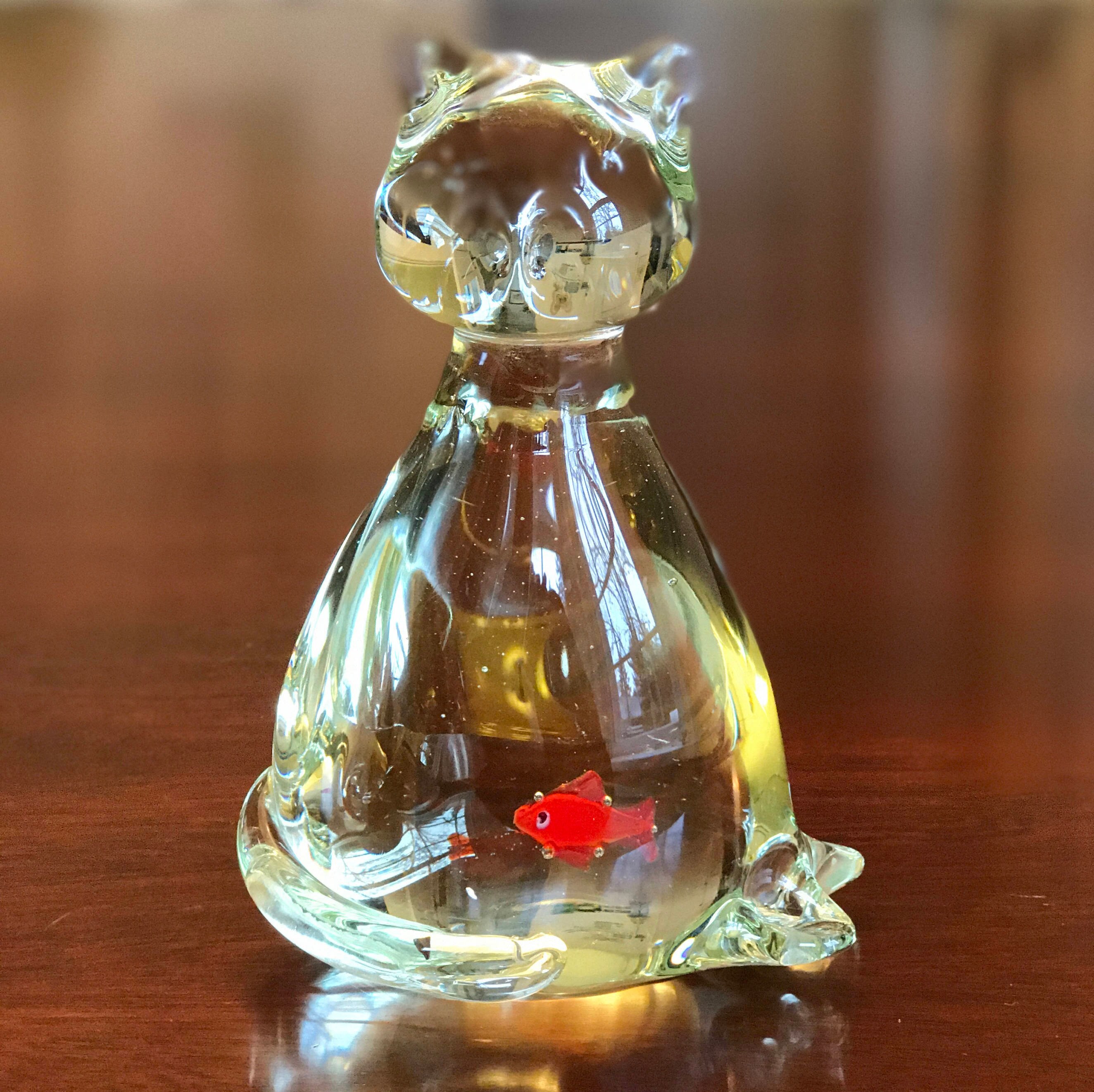 Vintage crystal Cat with orange Goldfish inside. Its transparency give this kitty away! He did eat the Goldfish. So cute!