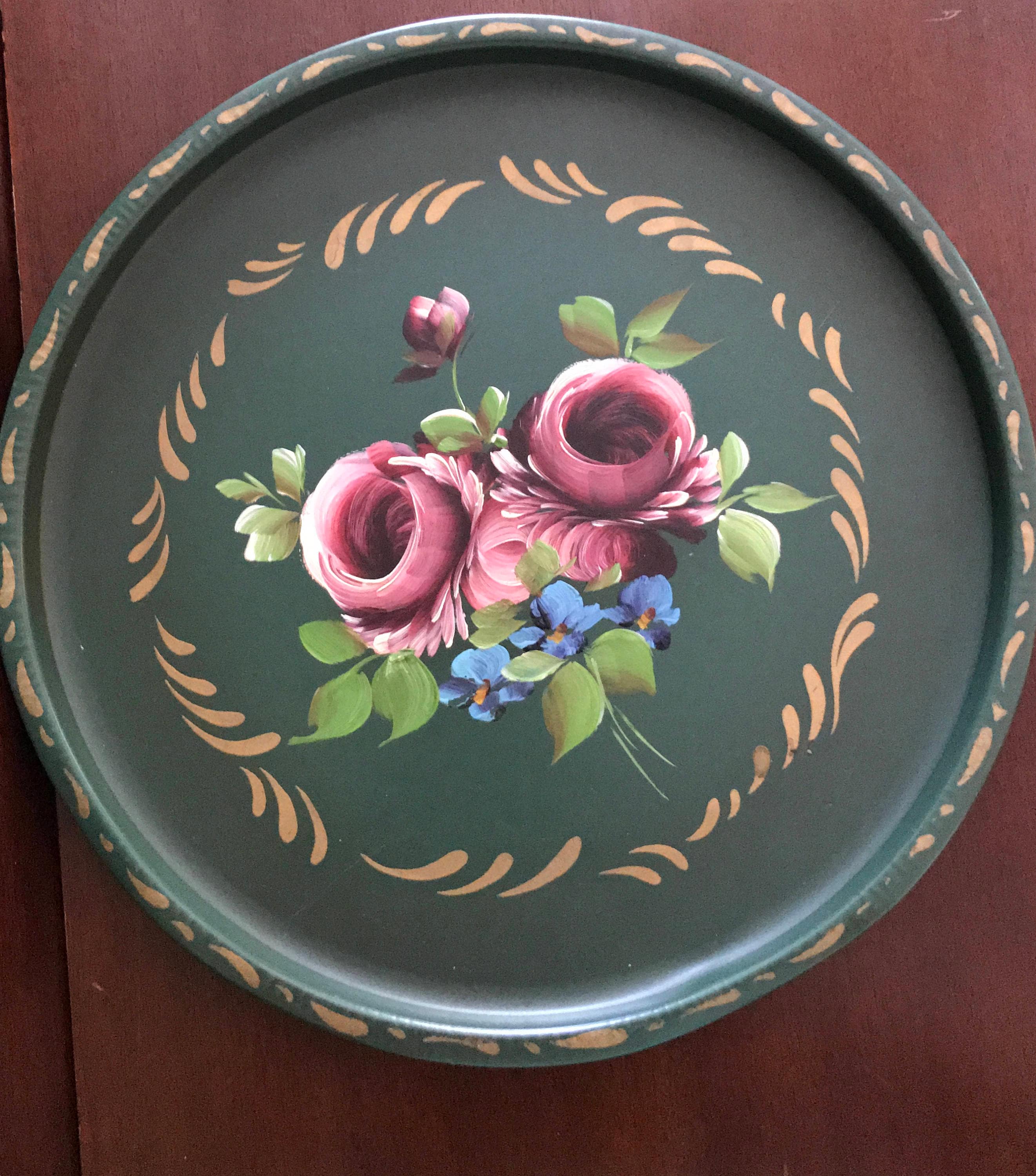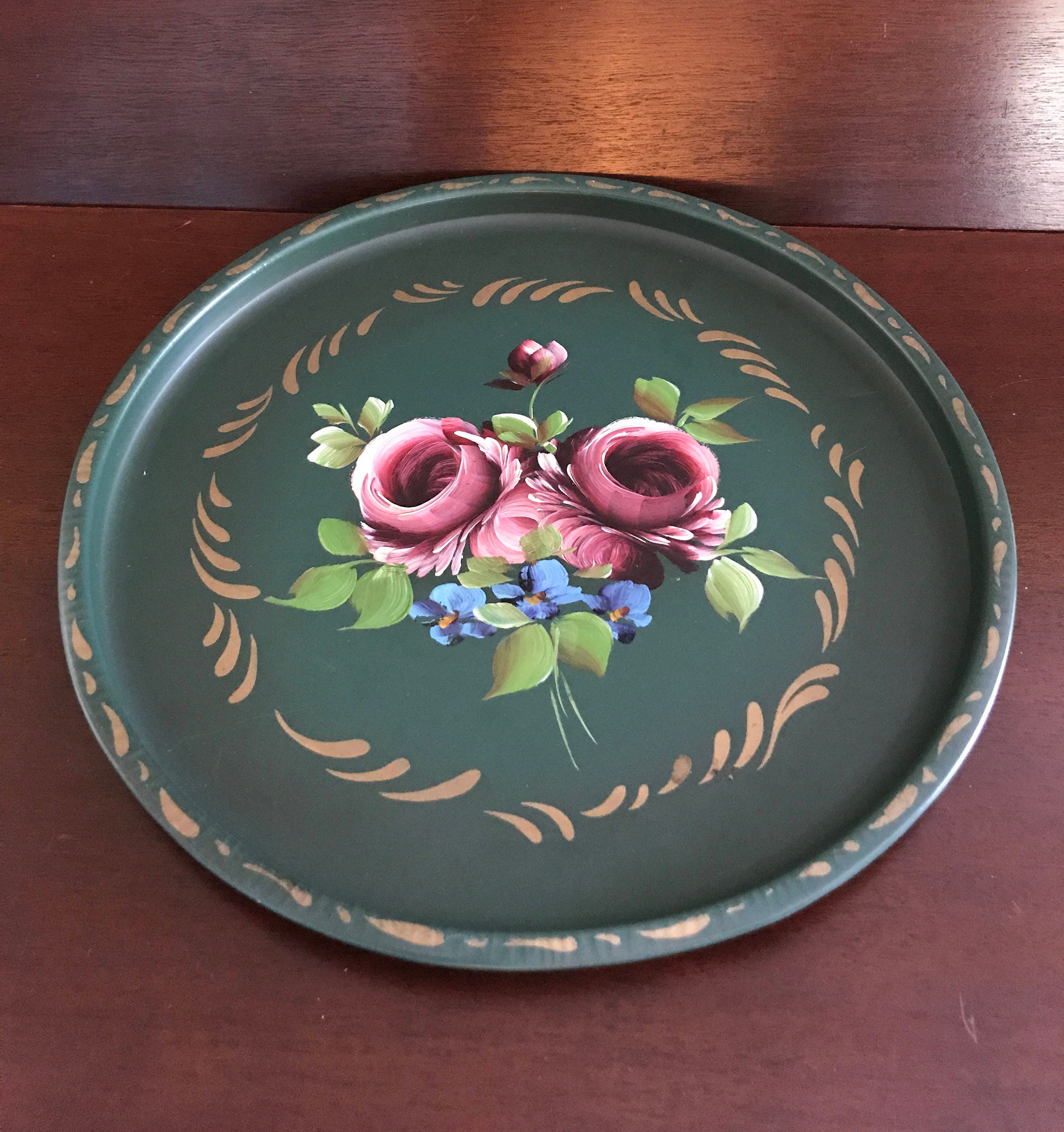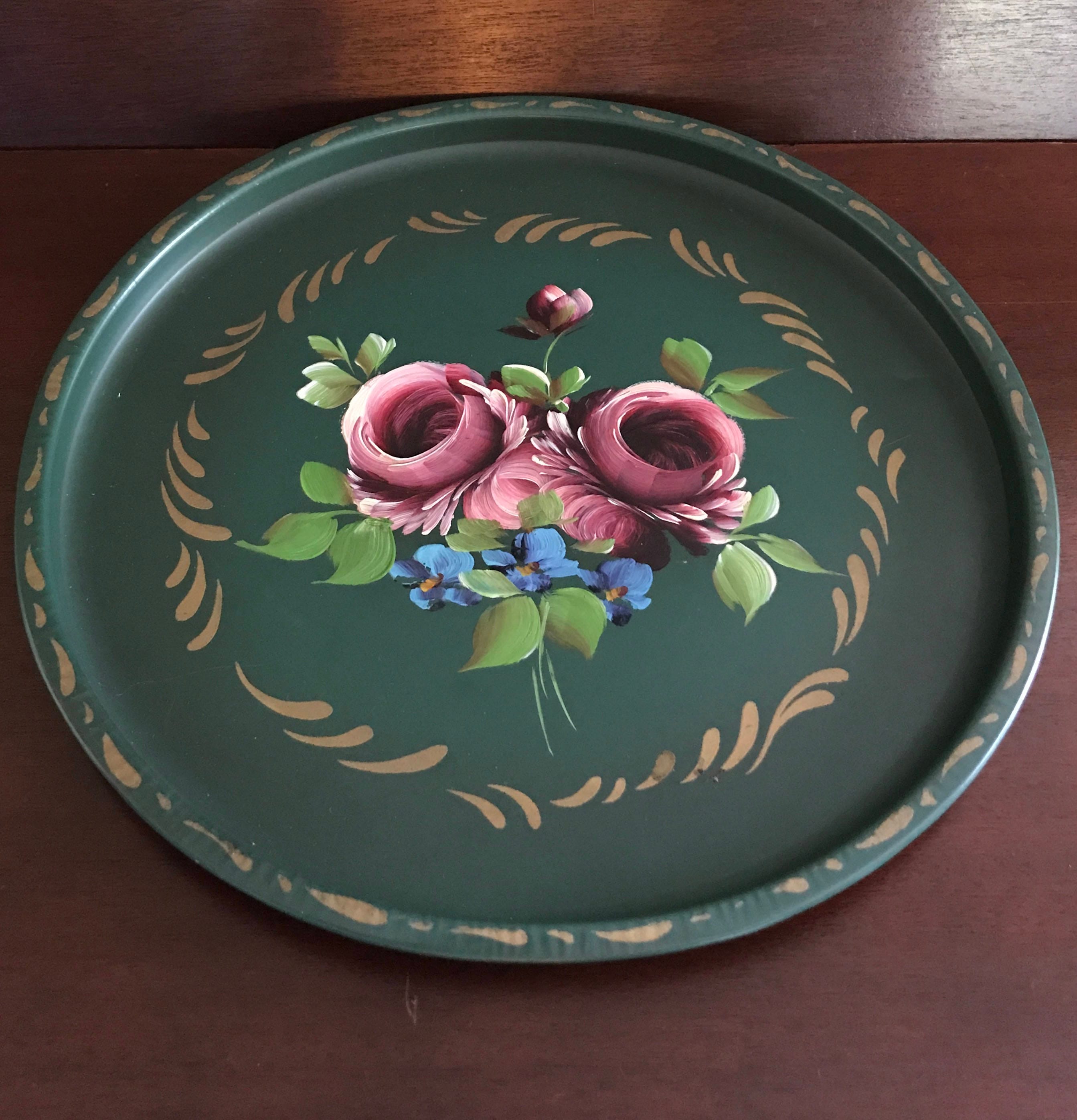 This is a lovely hand painted Tole Tray. A deep hunter green with gold accents, it has a lovely Posey of pink roses with little blue forget-me-nots in the center. Elegant!