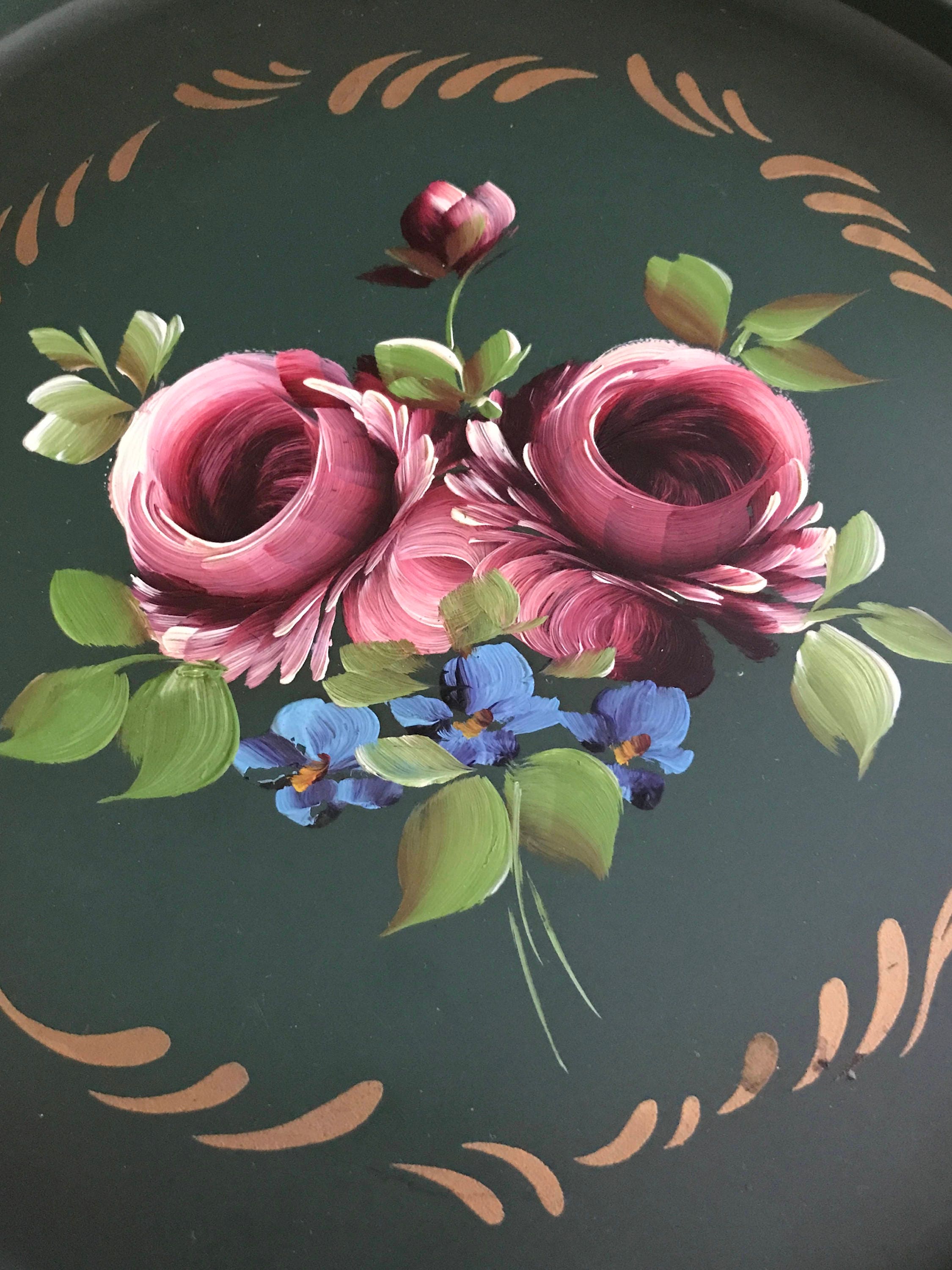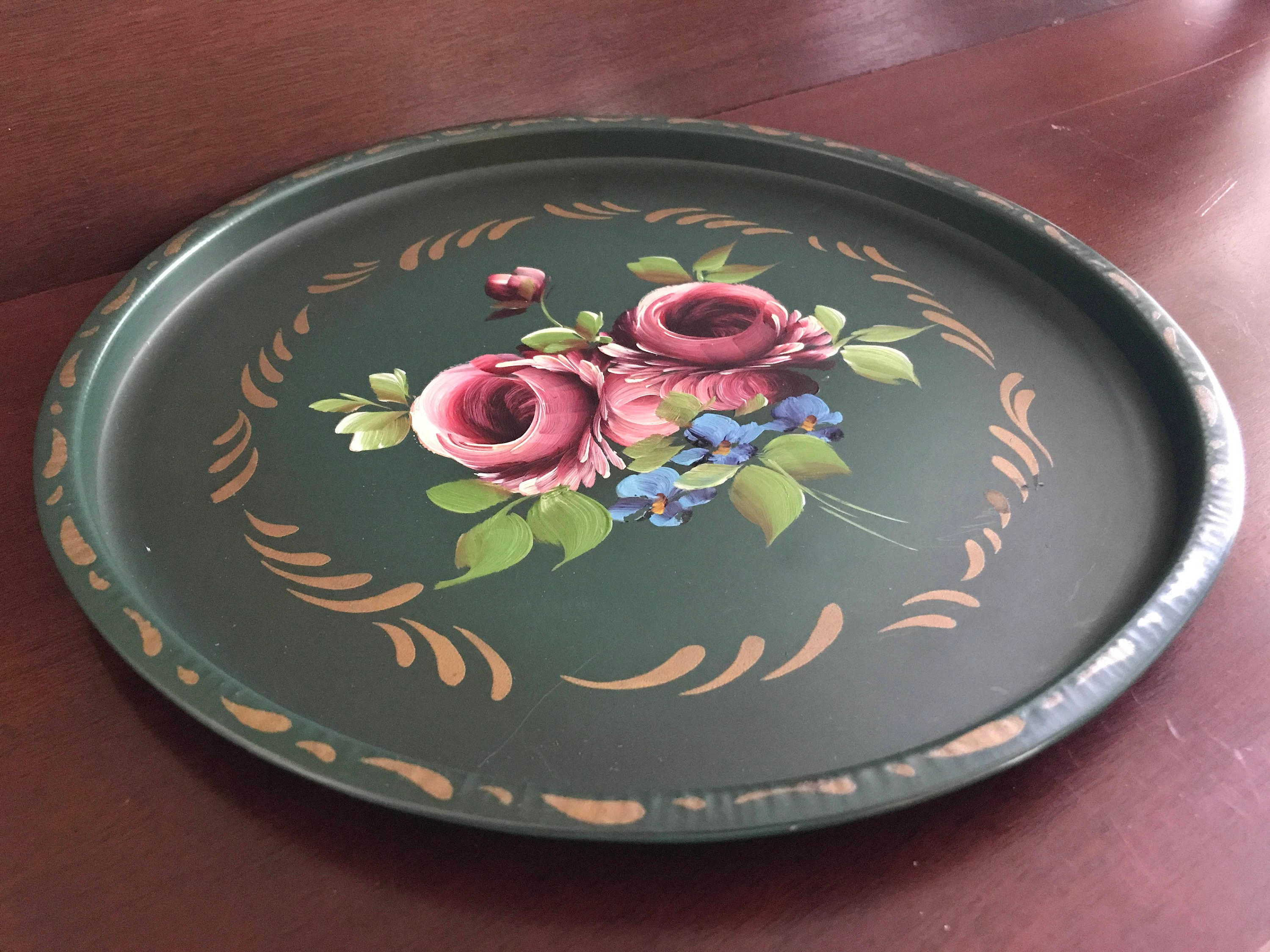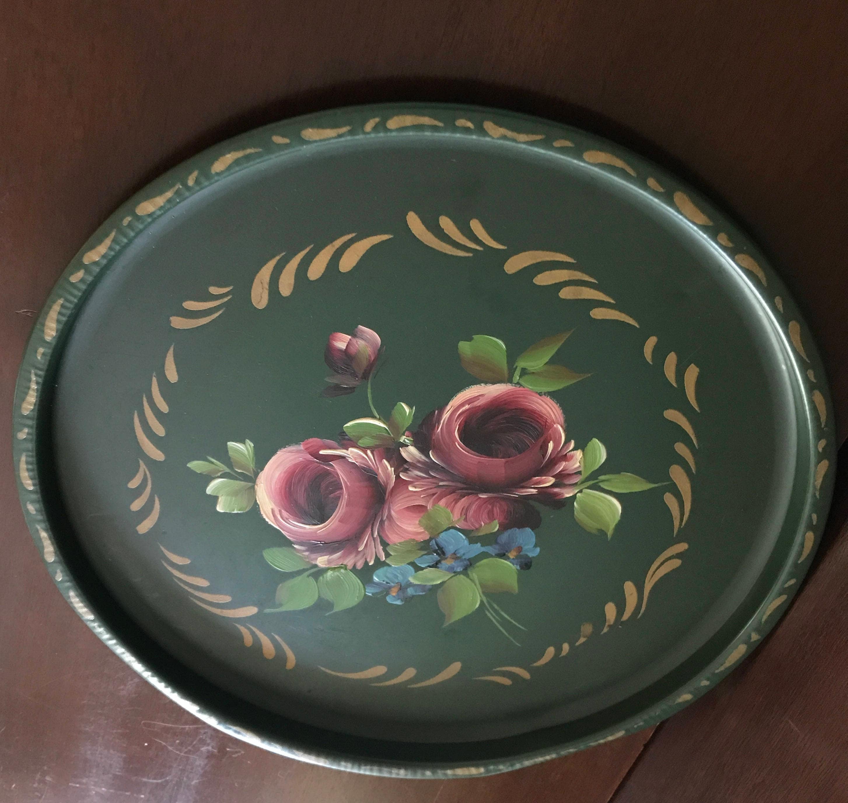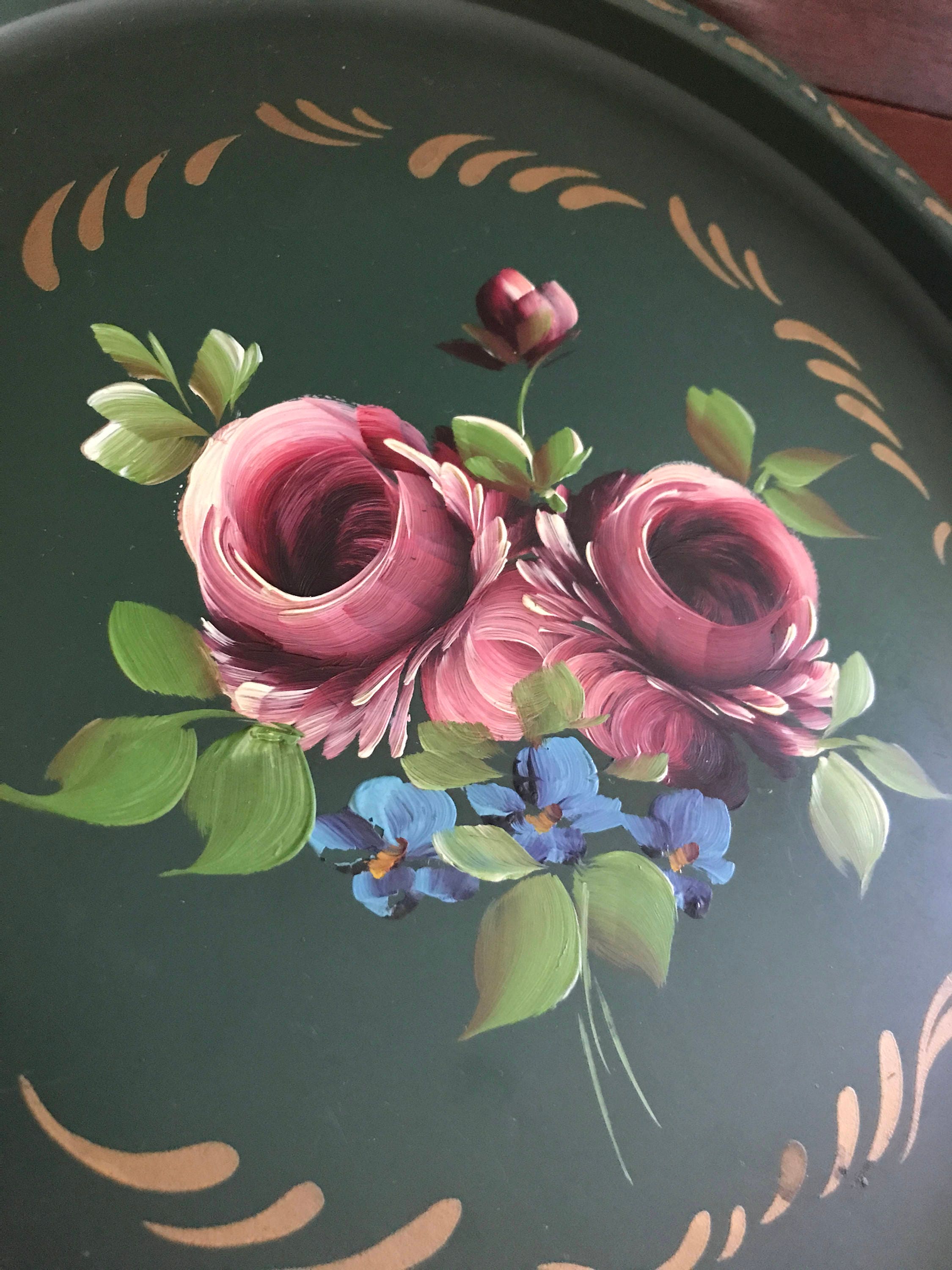 This is a lovely hand painted Tole Tray. A deep hunter green with gold accents, it has a lovely Posey of pink roses with little blue forget-me-nots in the center. Elegant!
