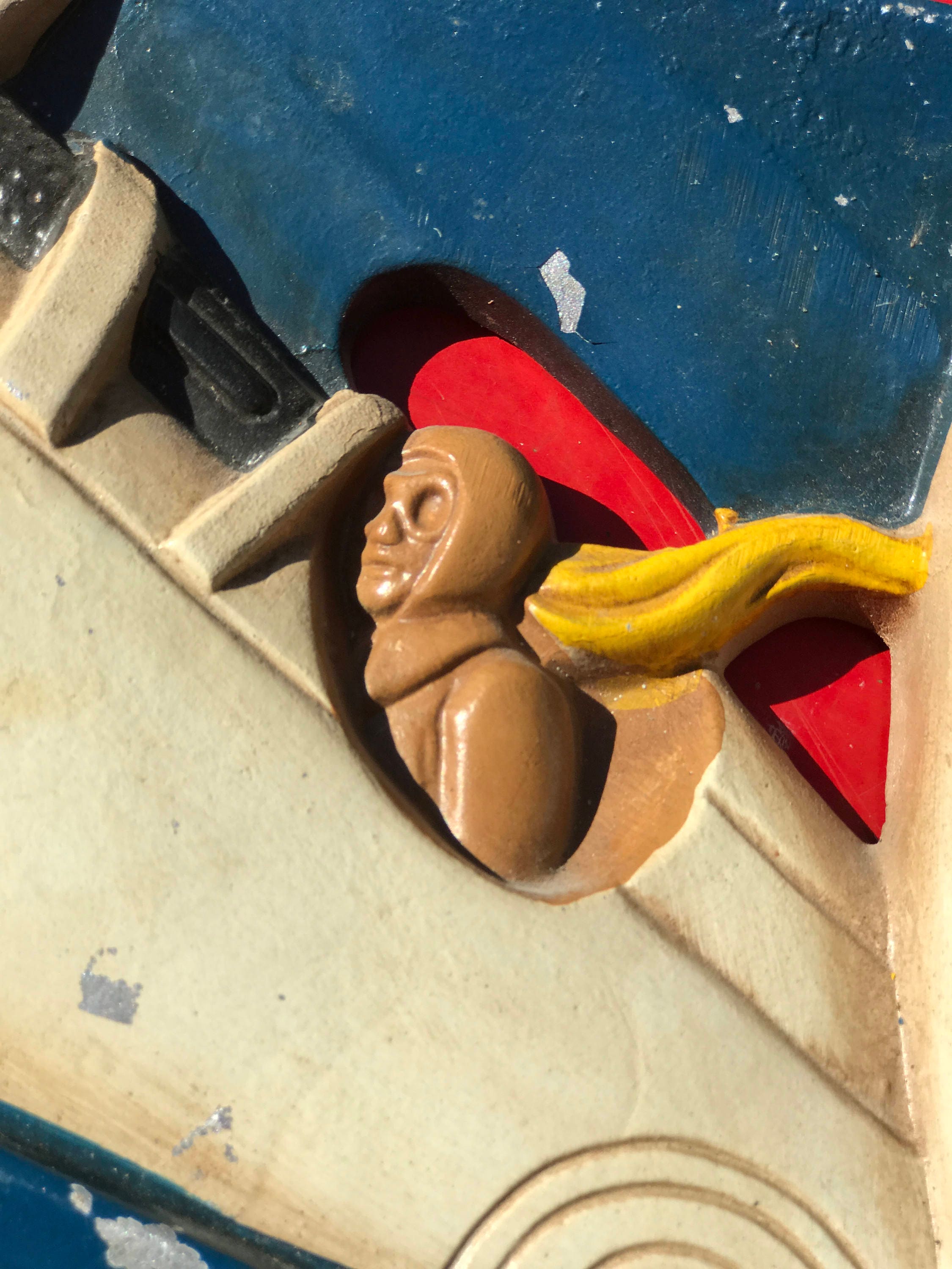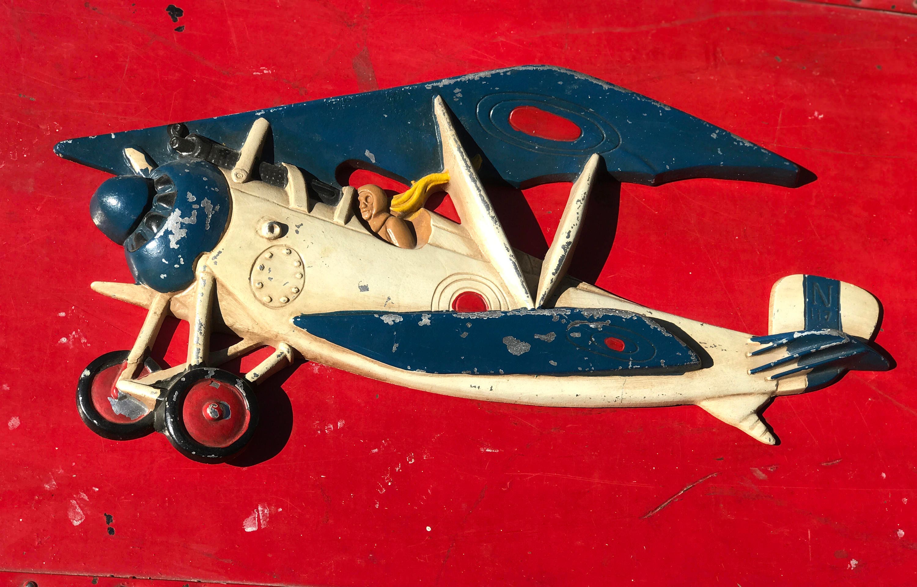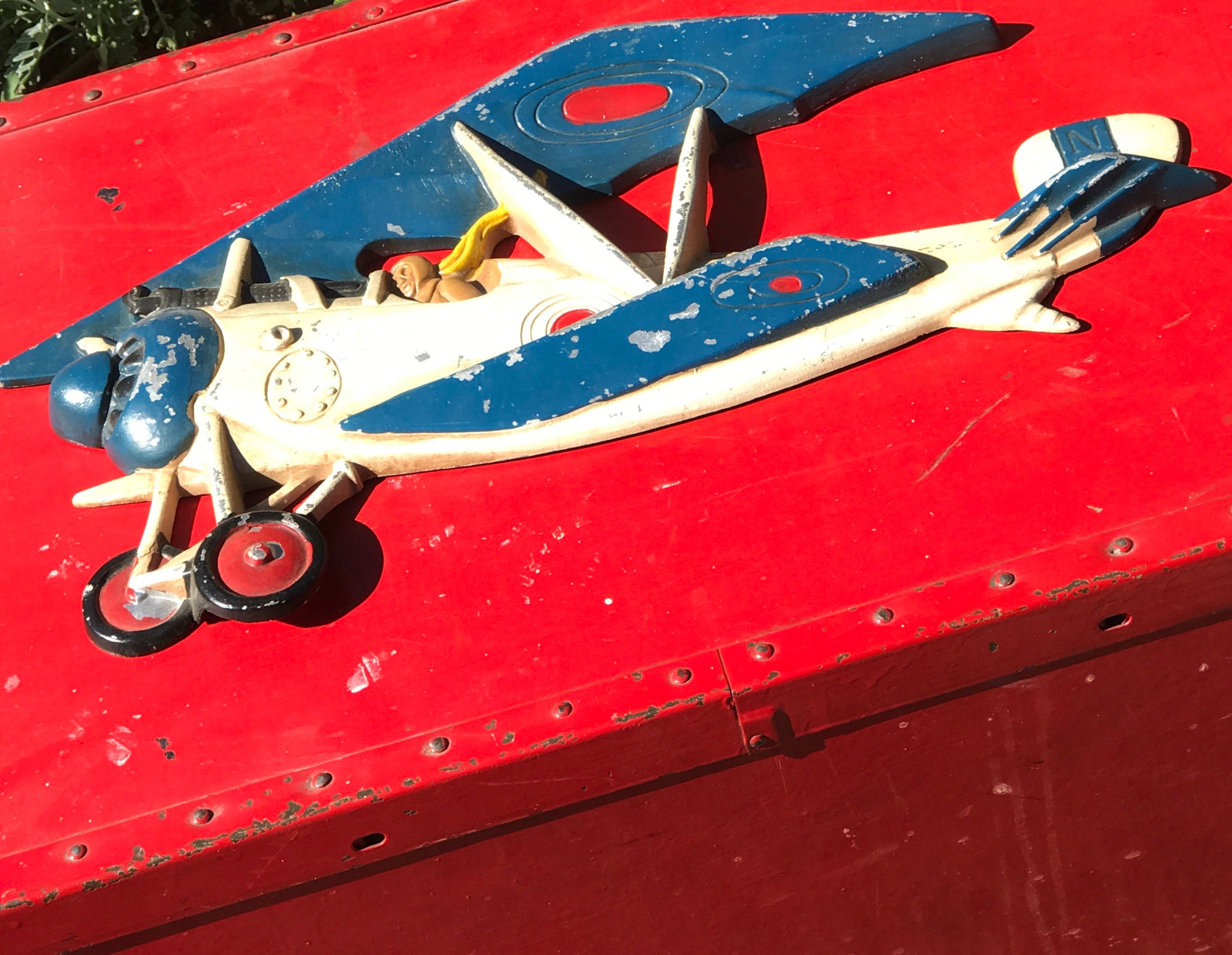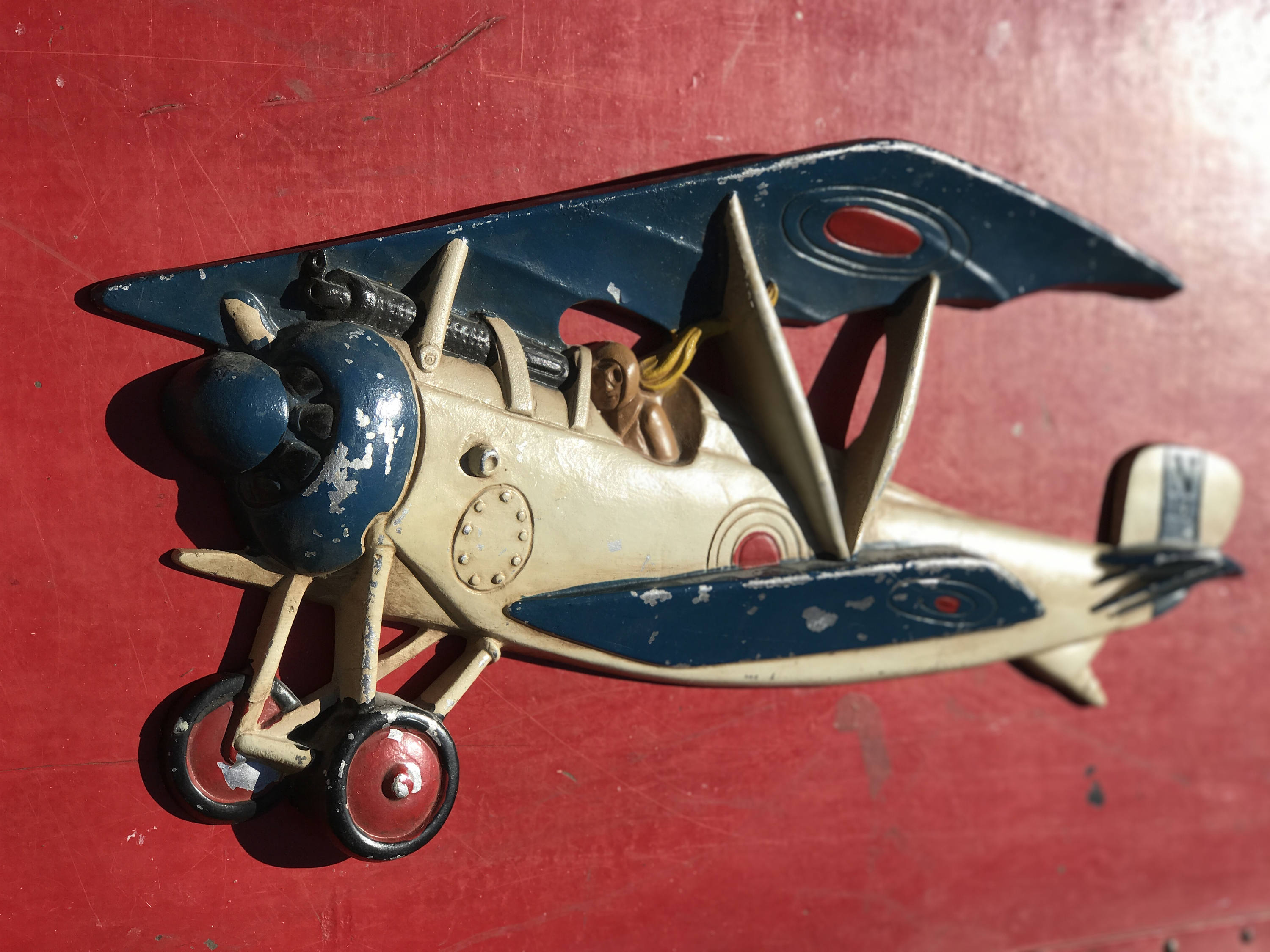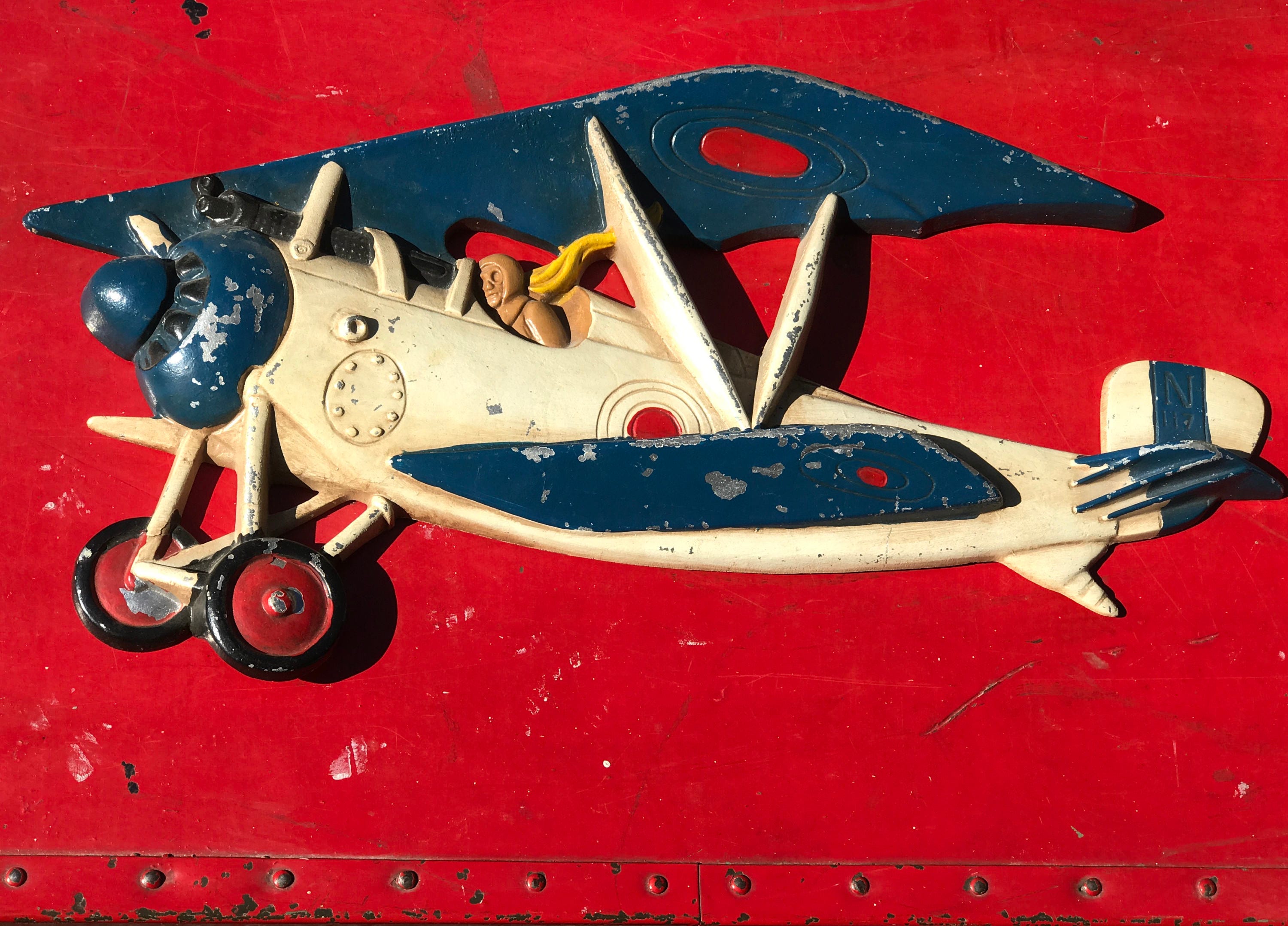 Vintage British WW1 Biplane Wall Hanging. Handpainted in Red, White, and Blue. The RAF pilot is wearing goggles and a yellow scarf. He is peering down the barrel of the synchronized machine gun, while flying his plane.