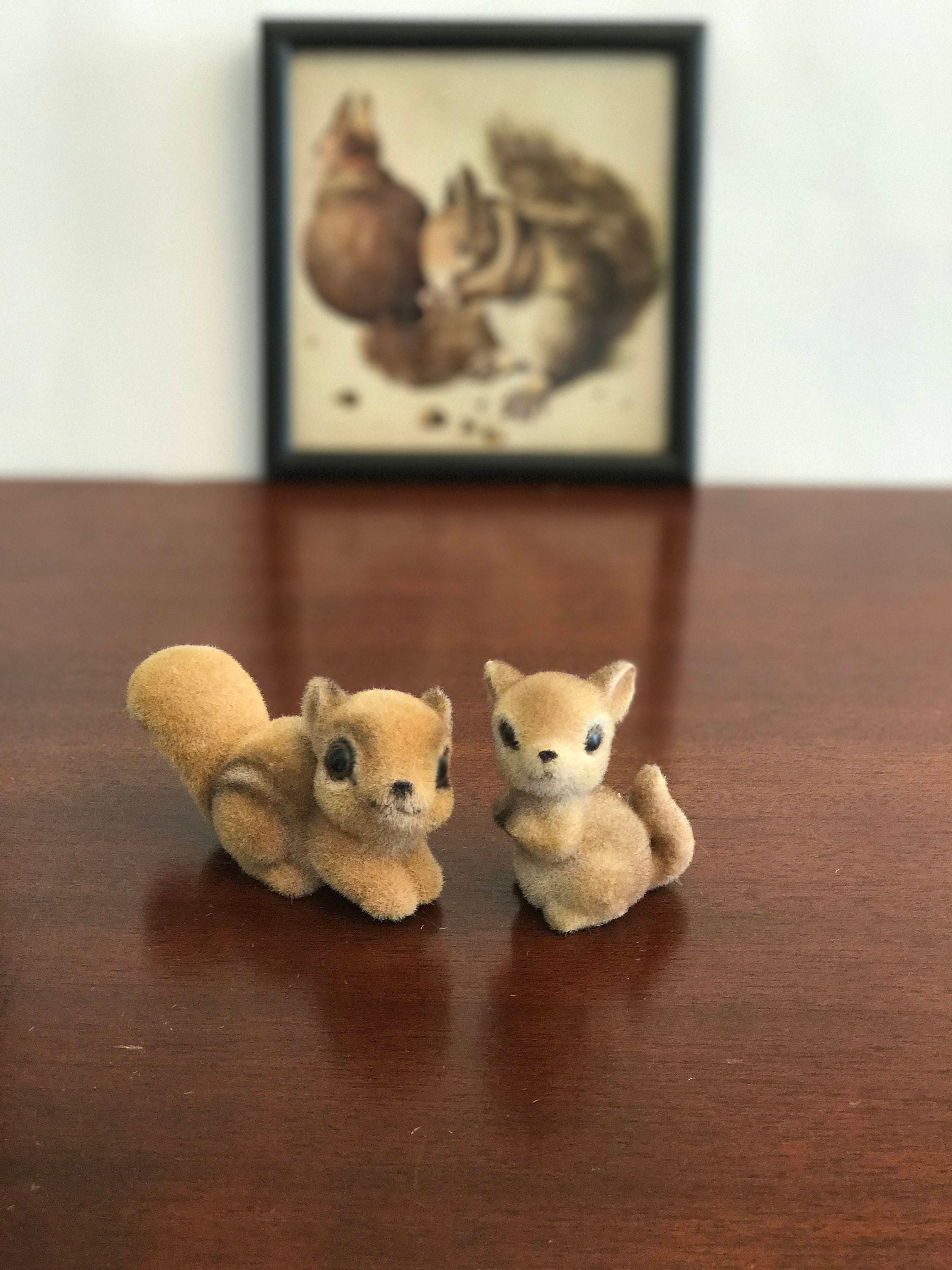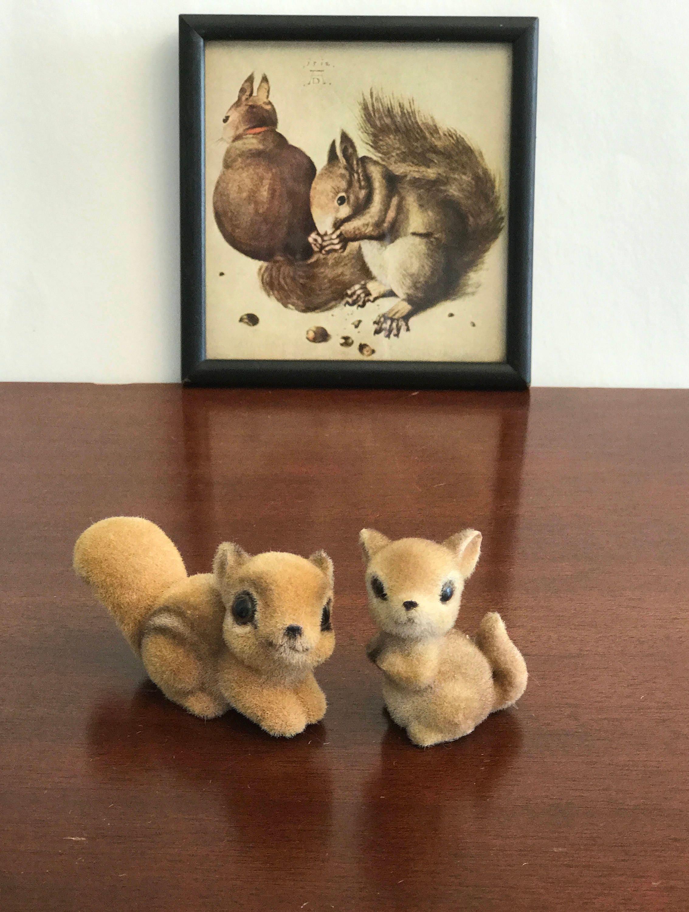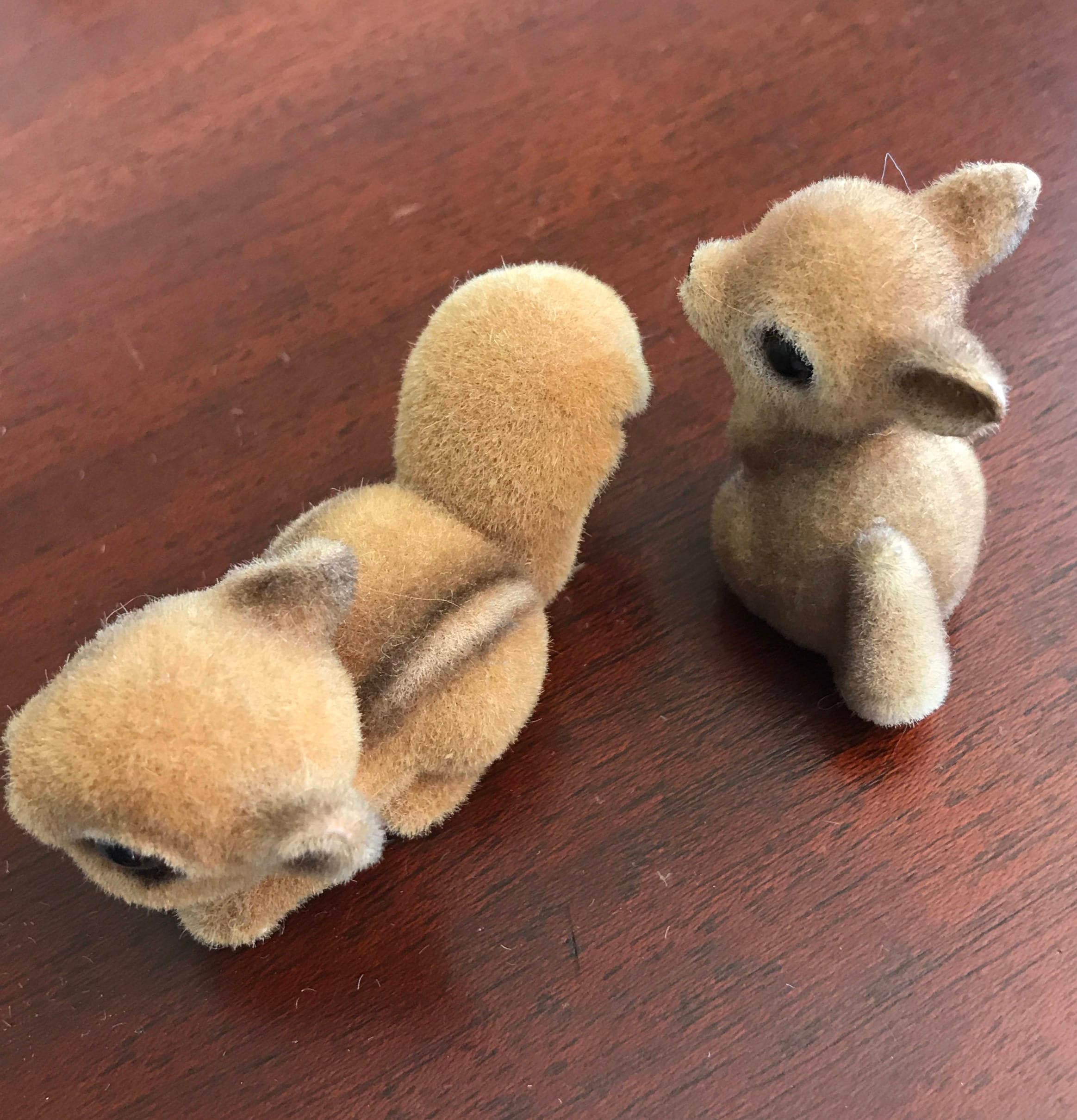These are sweet little flocked woodland animals. They have handpainted features, and little amber glass eyes. The chipmunk has the Josef original label on the underside which Reads "Josef Originals GG Japan".