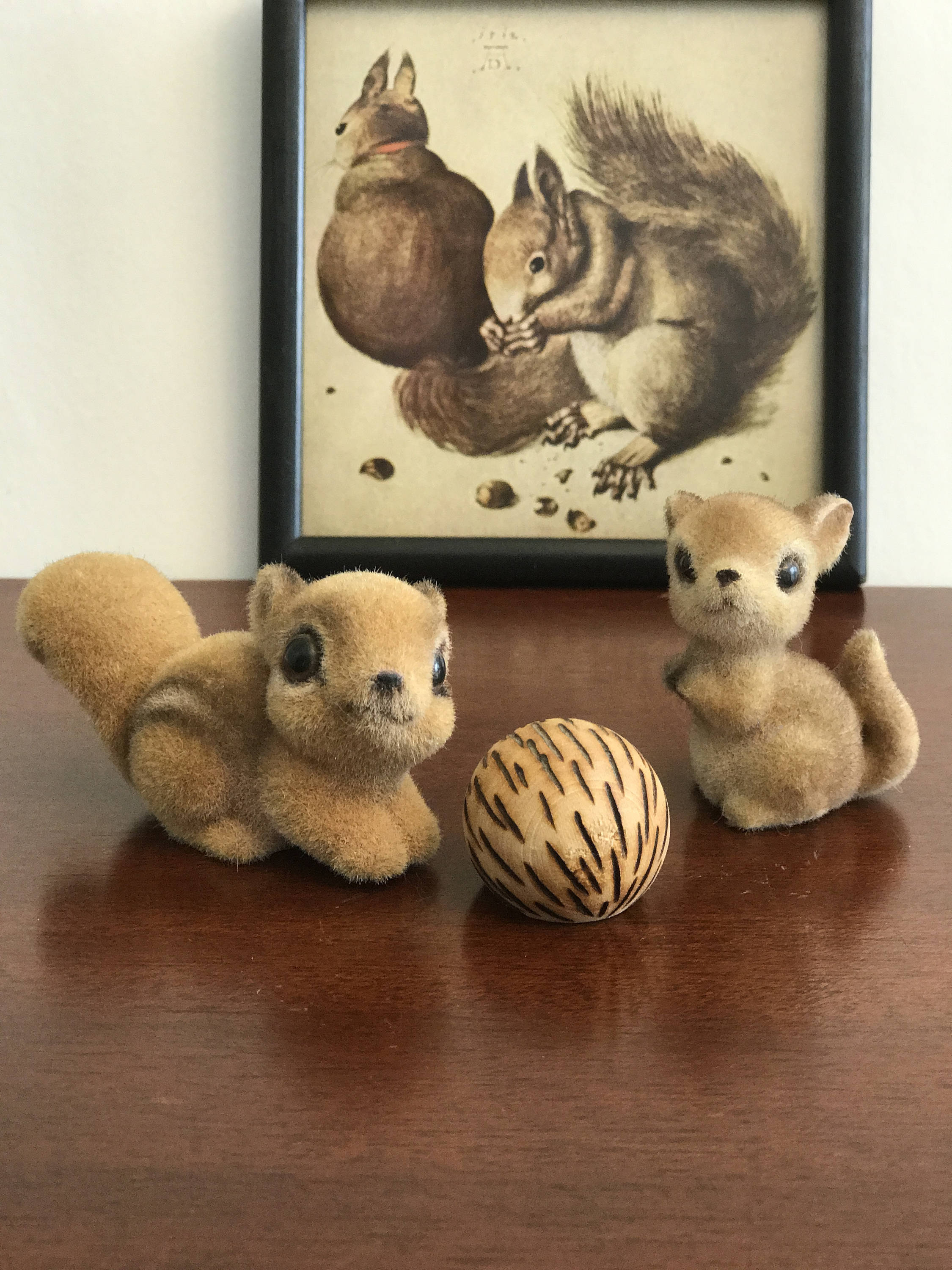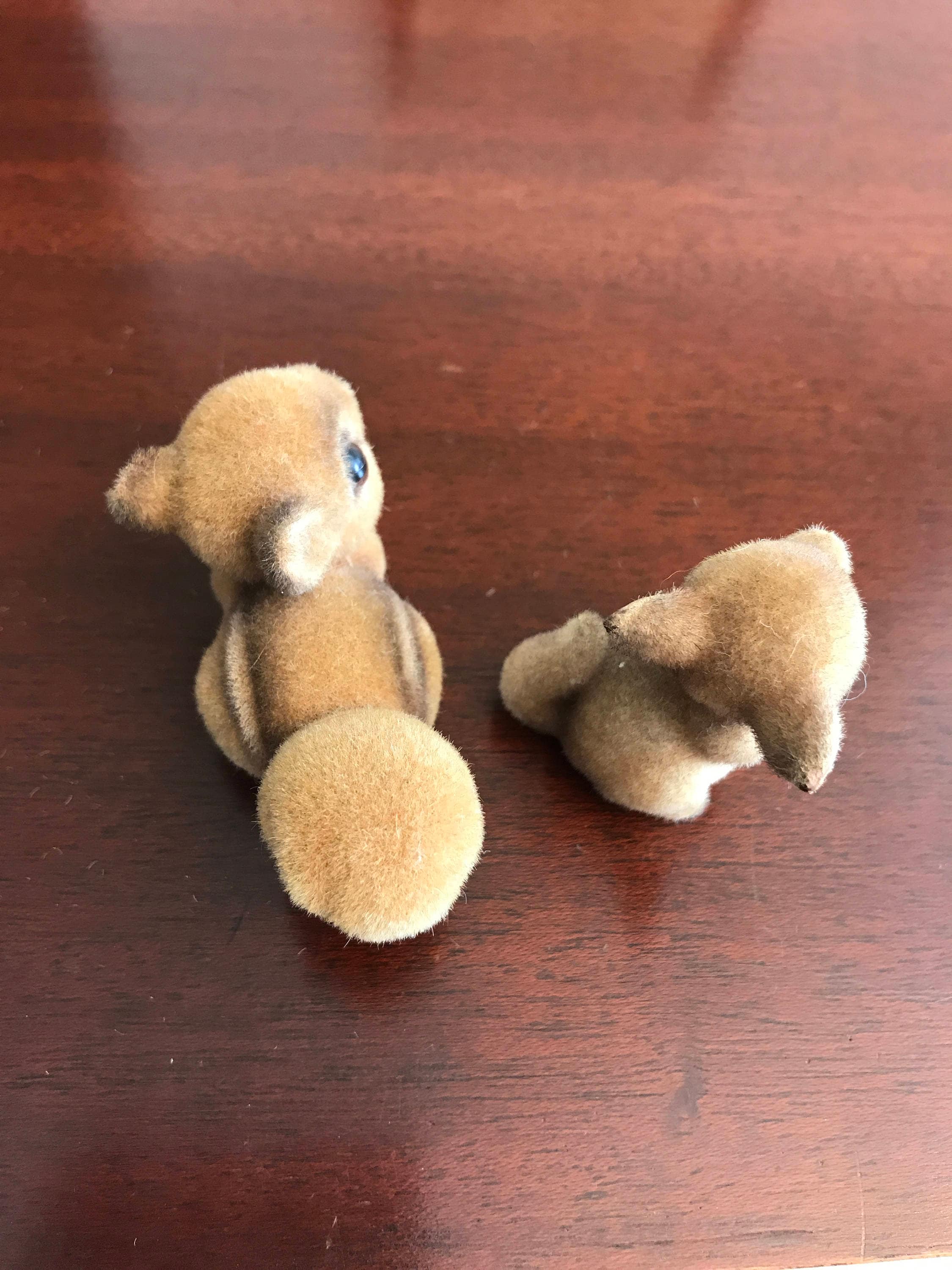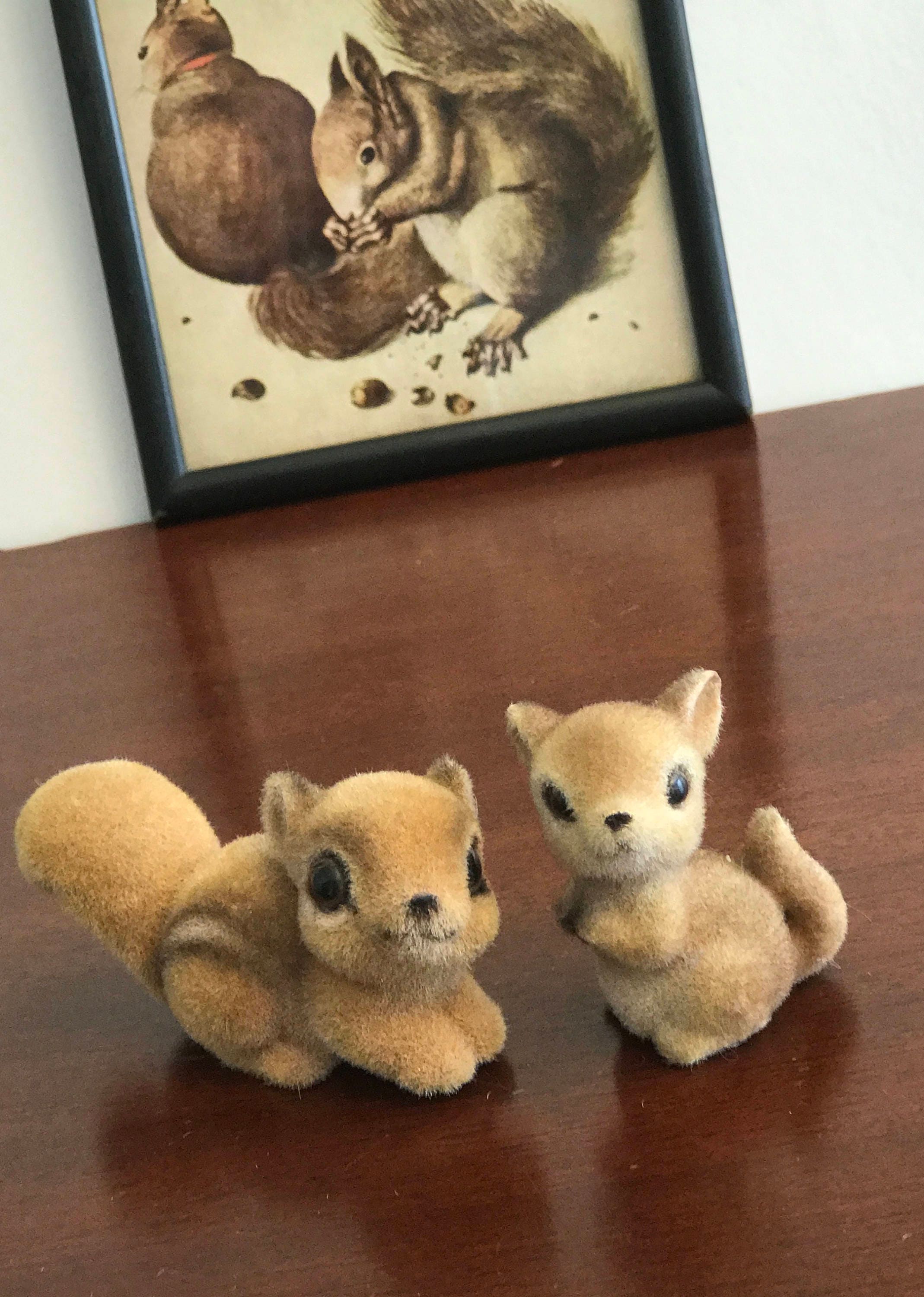 These are sweet little flocked woodland animals. They have handpainted features, and little amber glass eyes. The chipmunk has the Josef original label on the underside which Reads "Josef Originals GG Japan".