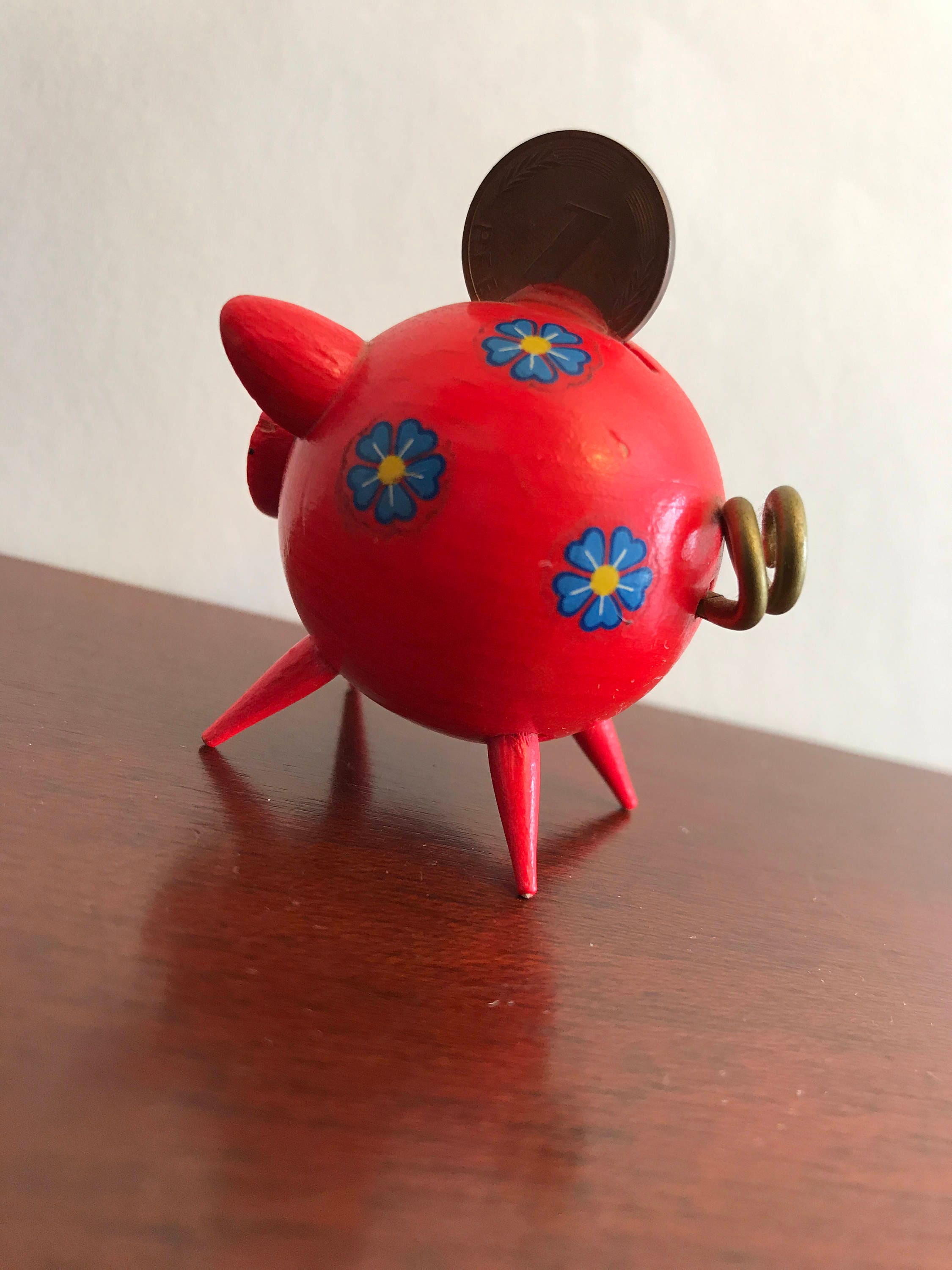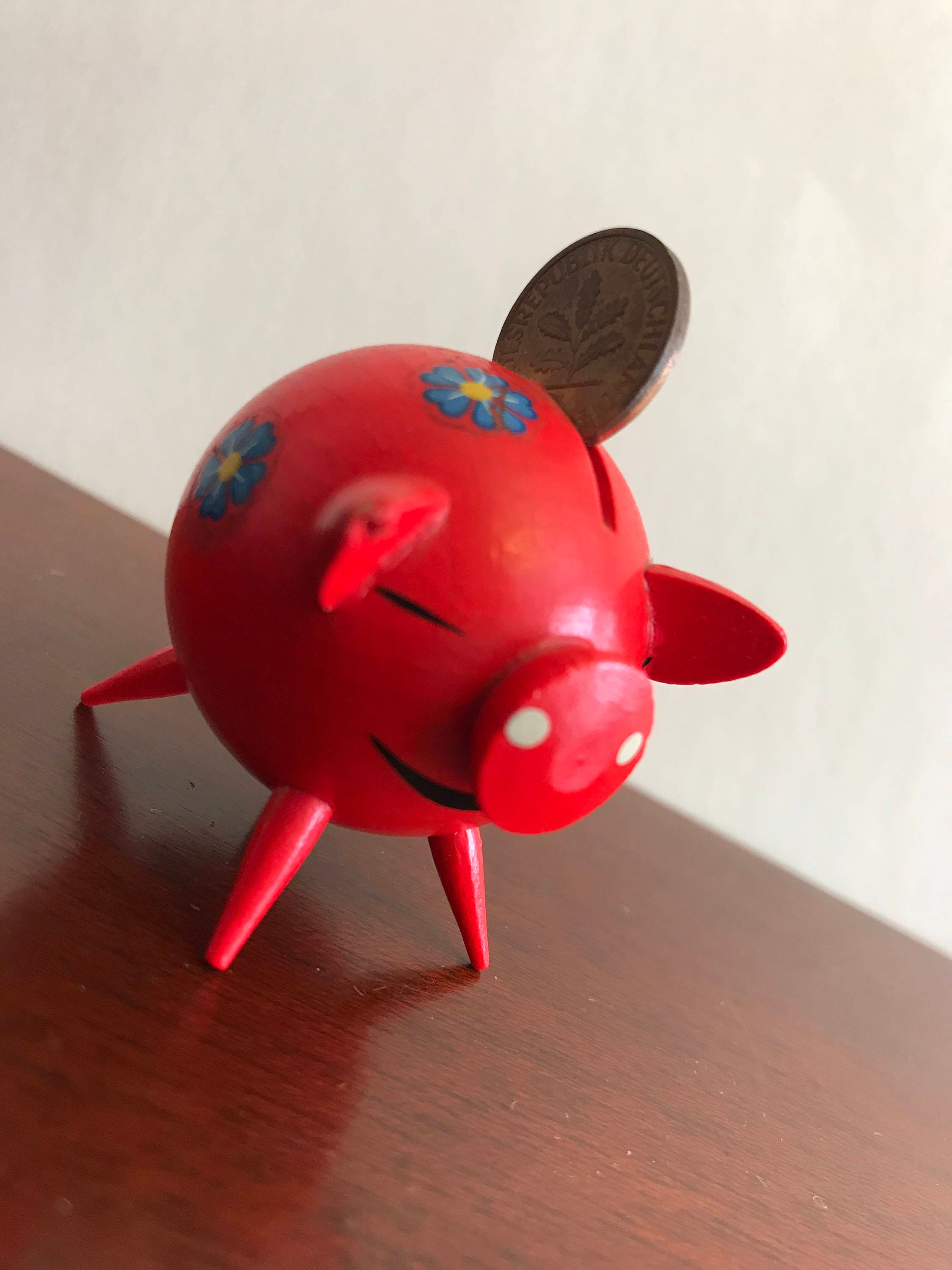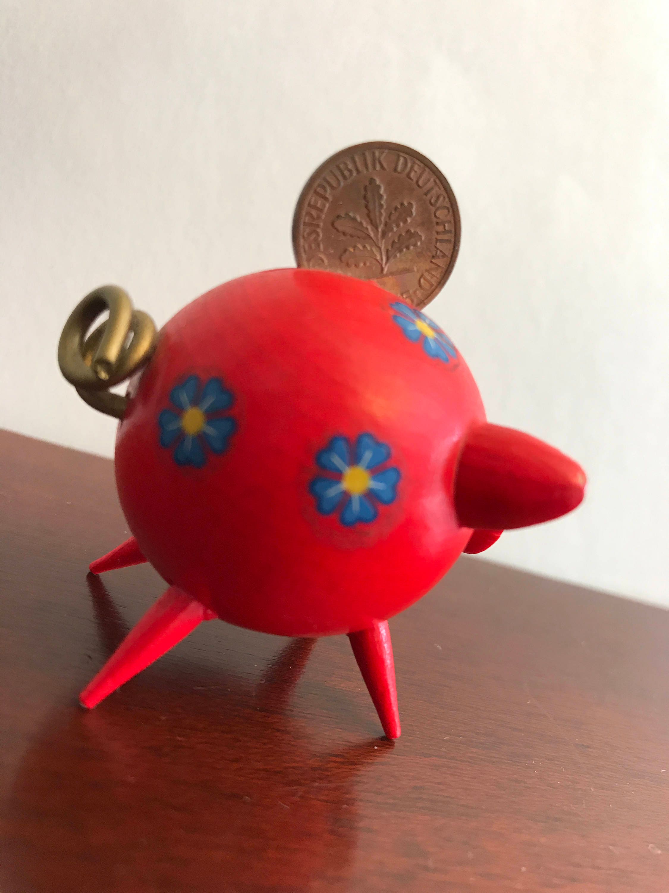 This is a darling kitschy hot pink piggy bank. Made in Germany it has a one cent piece from the Republic of Germany in the top. A little metal corkscrew tail and a smiling face make this little pig irresistible. This little knickknack is handmade and hand-painted in Germany. Although it's not a real bank it's a great gift for a collector.
