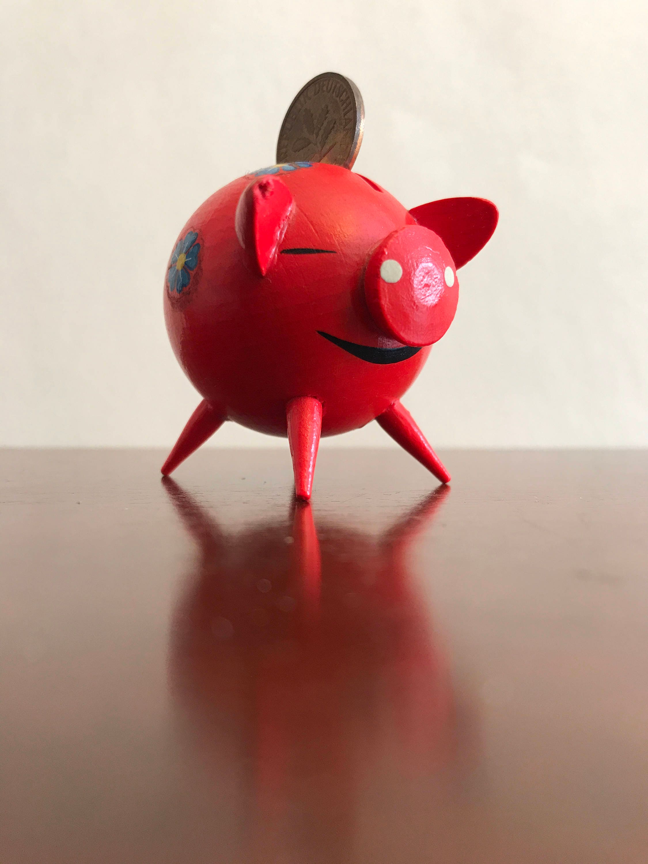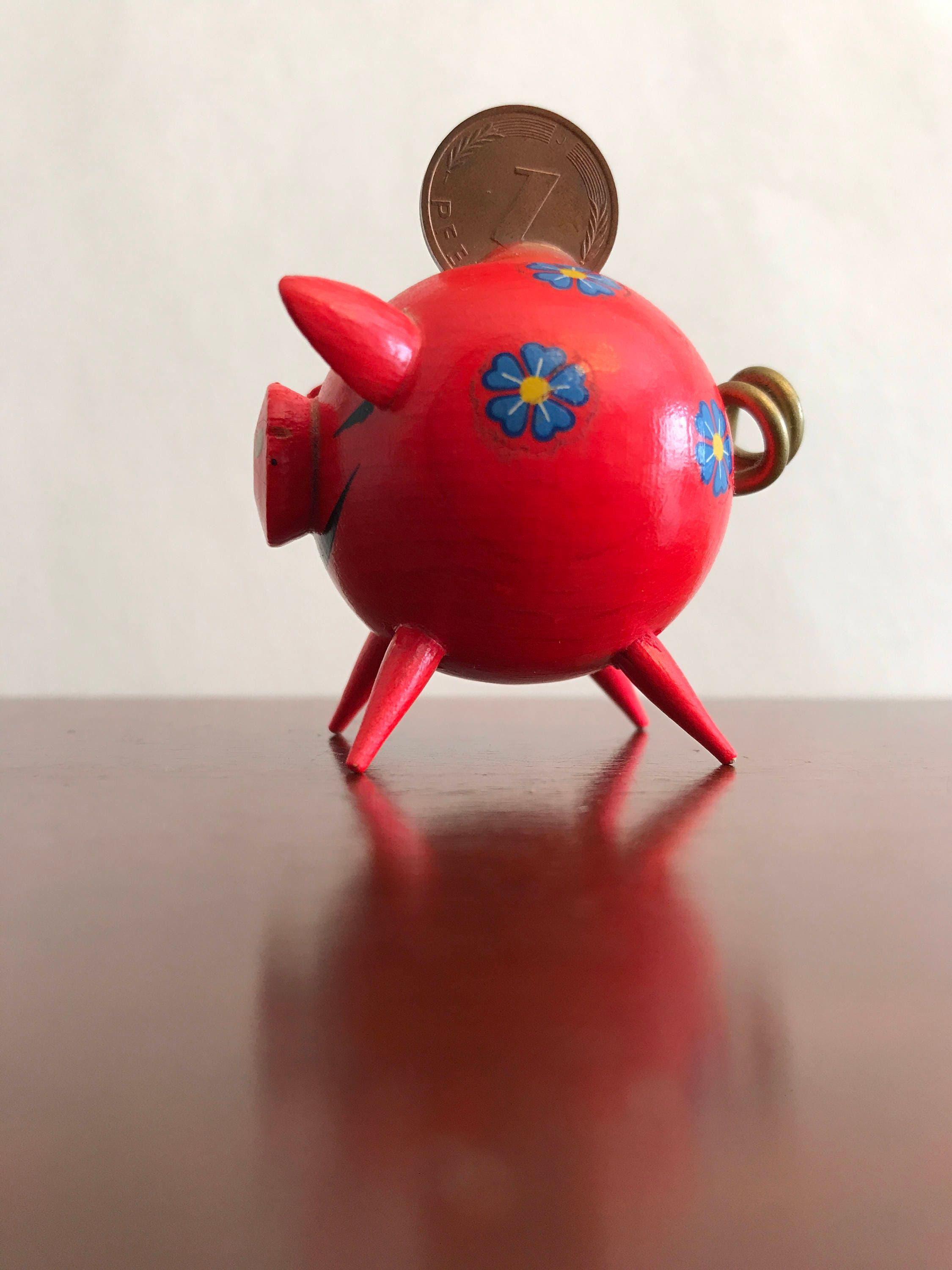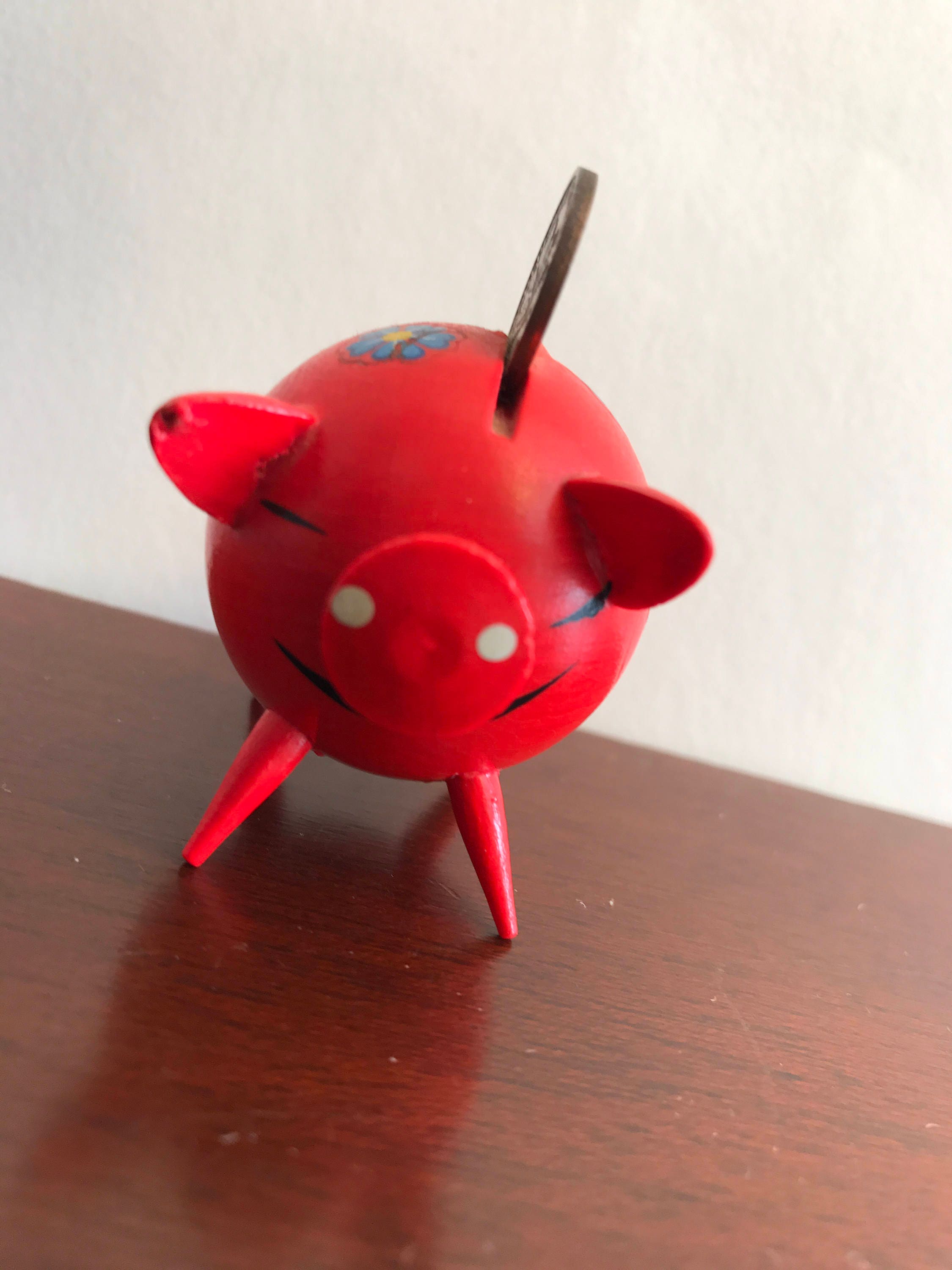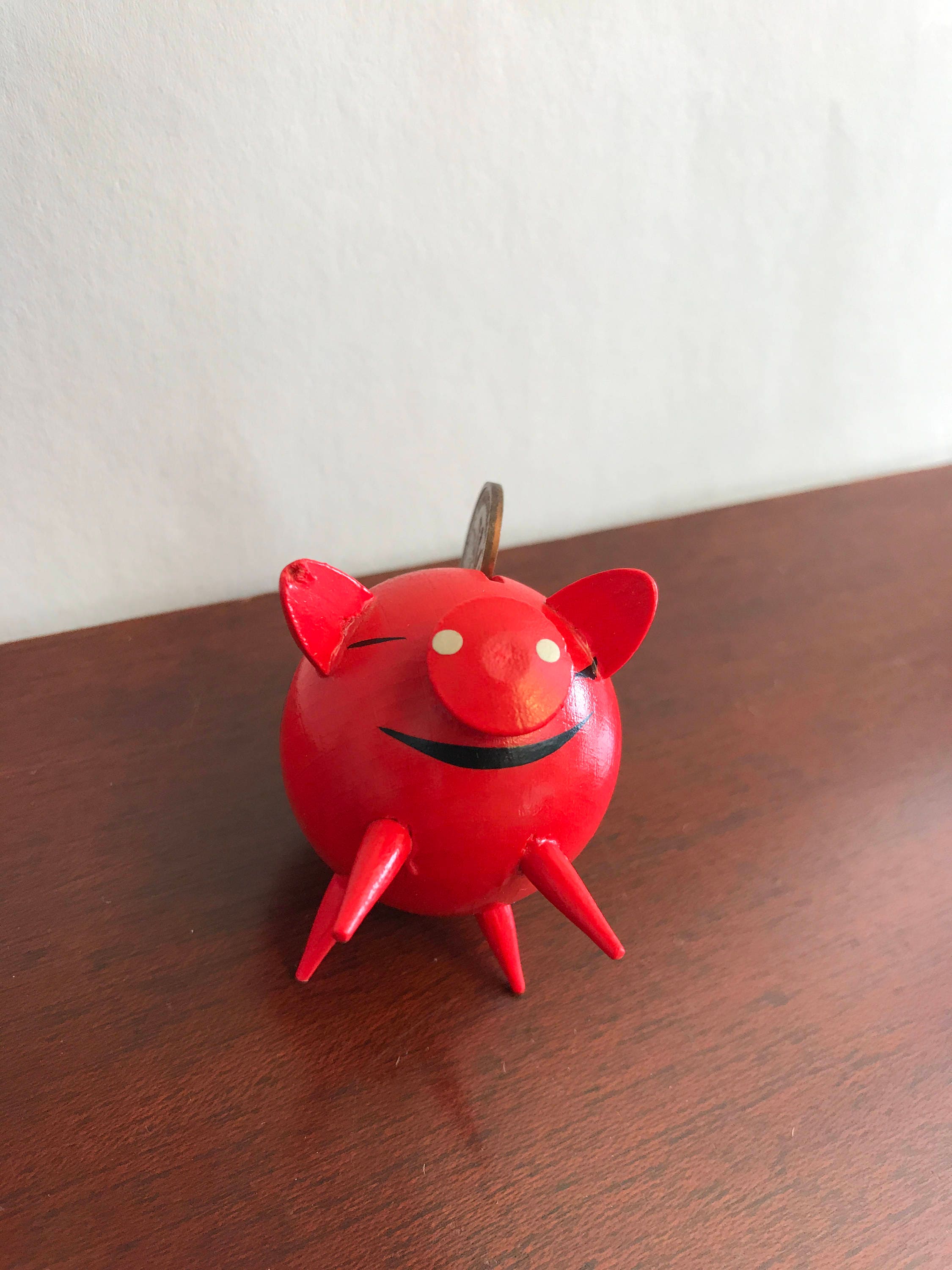 This is a darling kitschy hot pink piggy bank. Made in Germany it has a one cent piece from the Republic of Germany in the top. A little metal corkscrew tail and a smiling face make this little pig irresistible. This little knickknack is handmade and hand-painted in Germany. Although it's not a real bank it's a great gift for a collector.