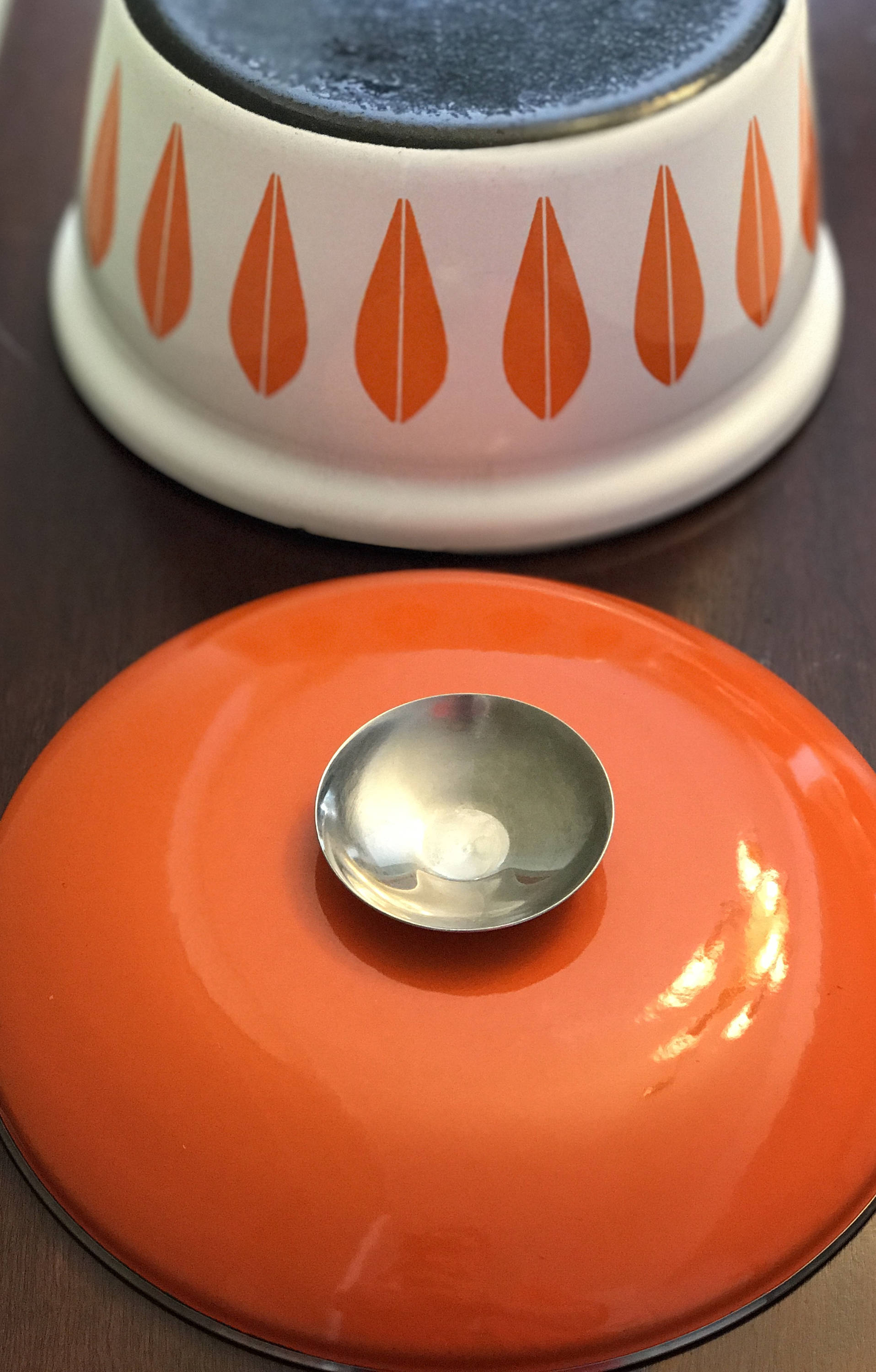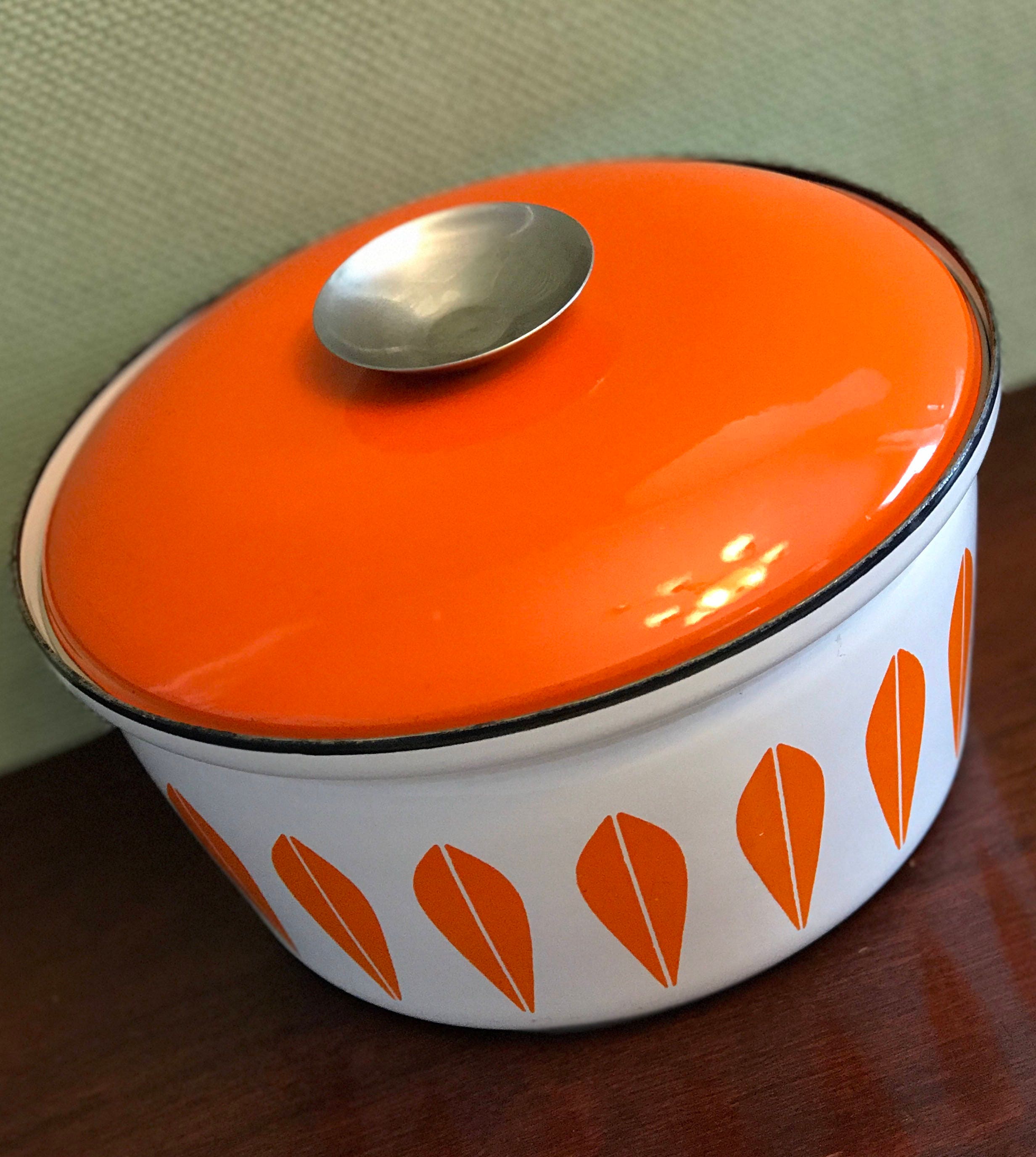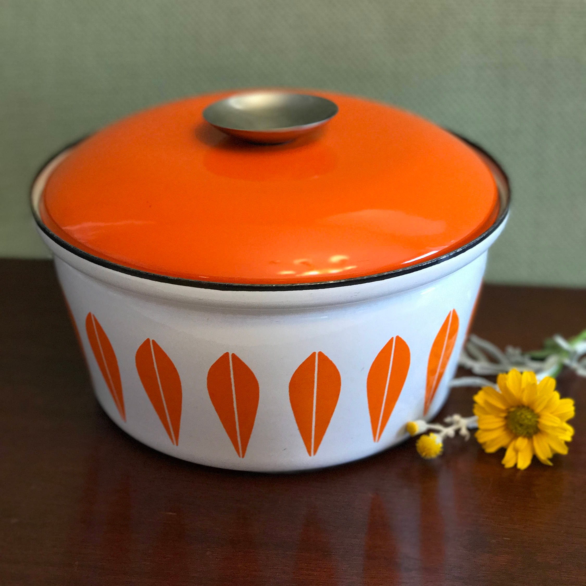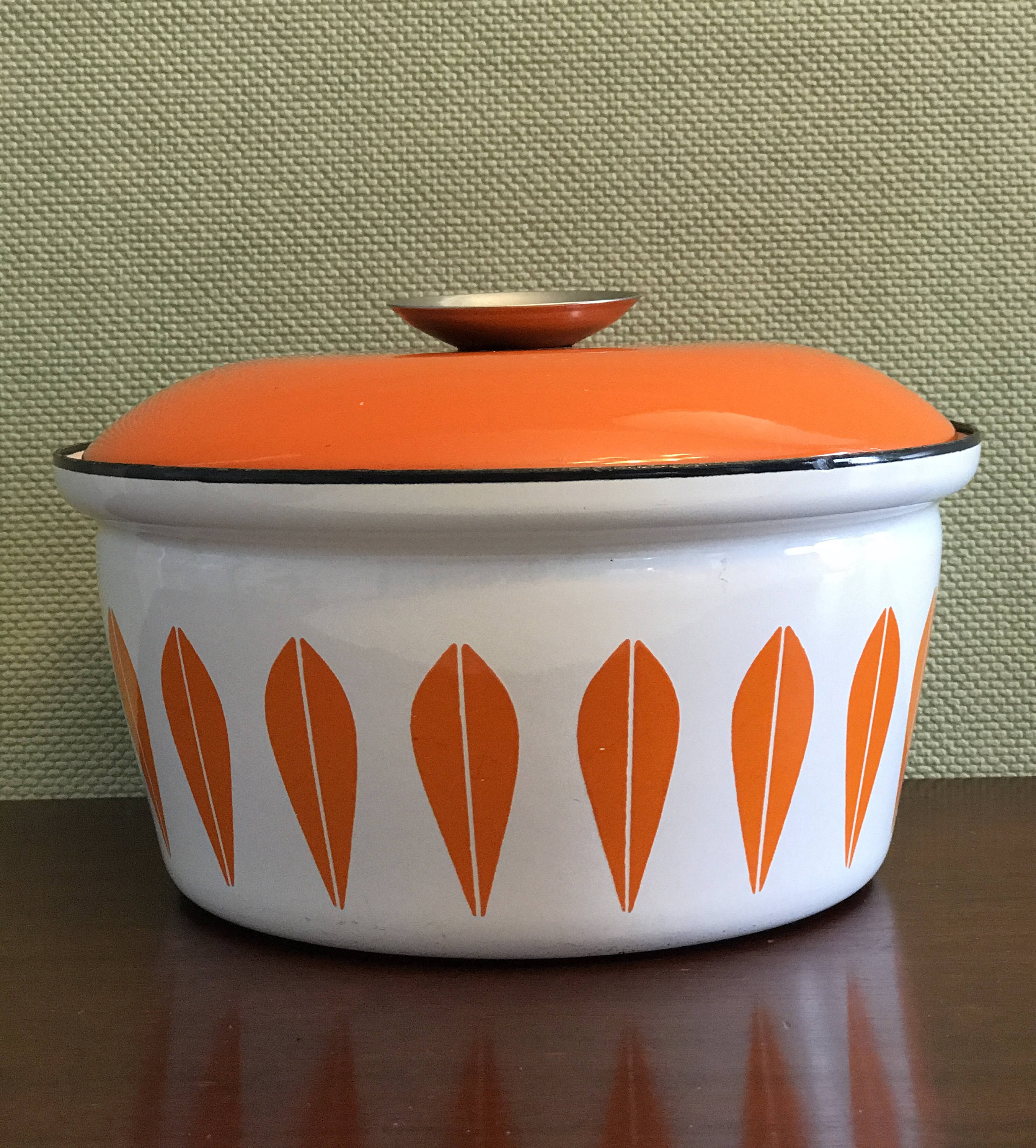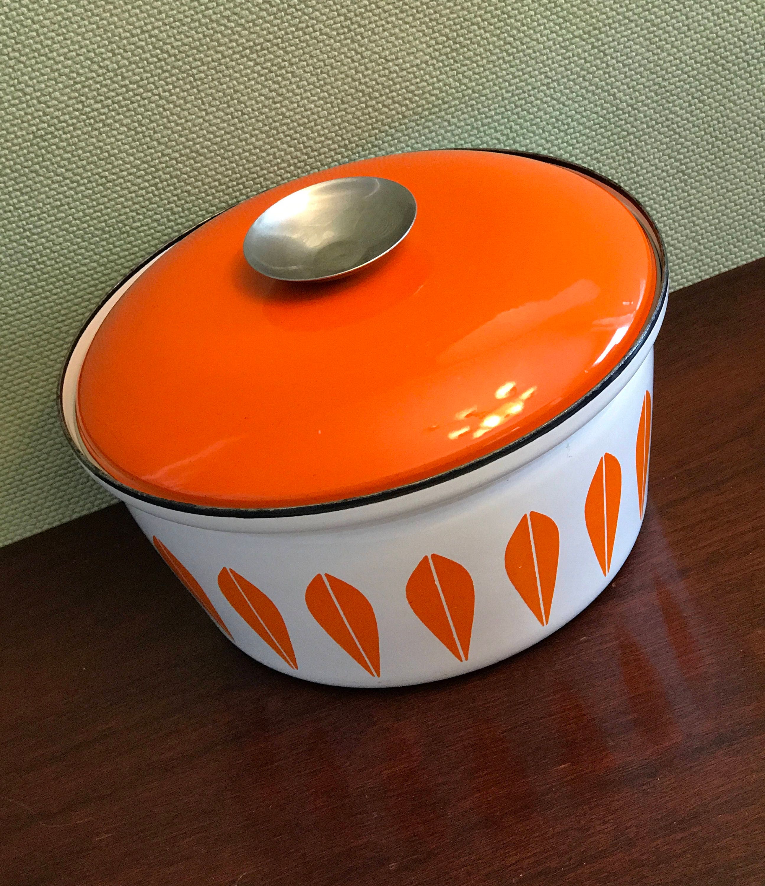 Fabulous Mid Century Catherine Holm enameled Dutch Oven in retro orange lotus on white. This pattern was designed by Greta Prytz Kittlesen in the 1960s, it is the iconic mid century design of Catherineholm Norway. These pieces are highly collectible and make a statement in design, while still being useful.