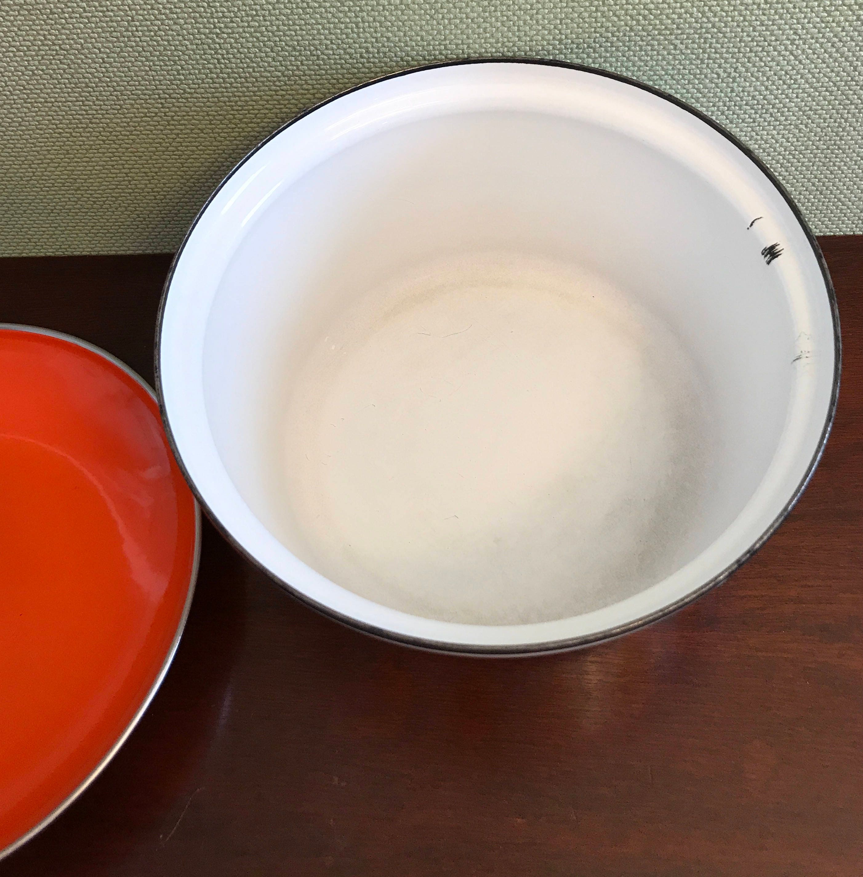 This pan is in very good vintage condition with some signs of use including discoloration on the inside bottom of the pan. Also on the inside there are a couple of scrapes in the enamel. The edges of the pot show some signs of wear on the very top. It is overall an incredible and well preserved for its age. This pot did not have the metal handles/when I purchased it.