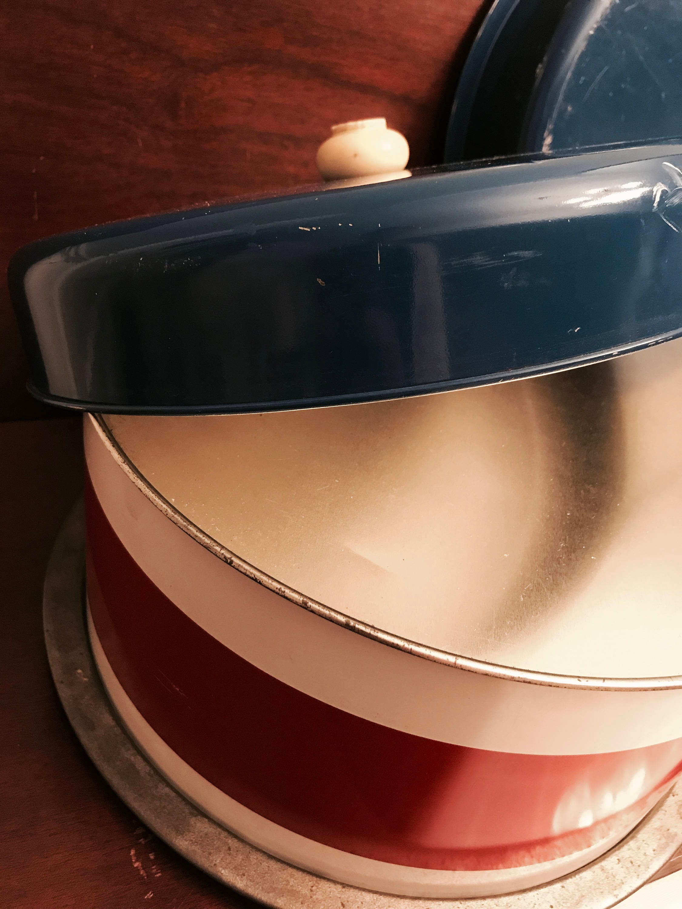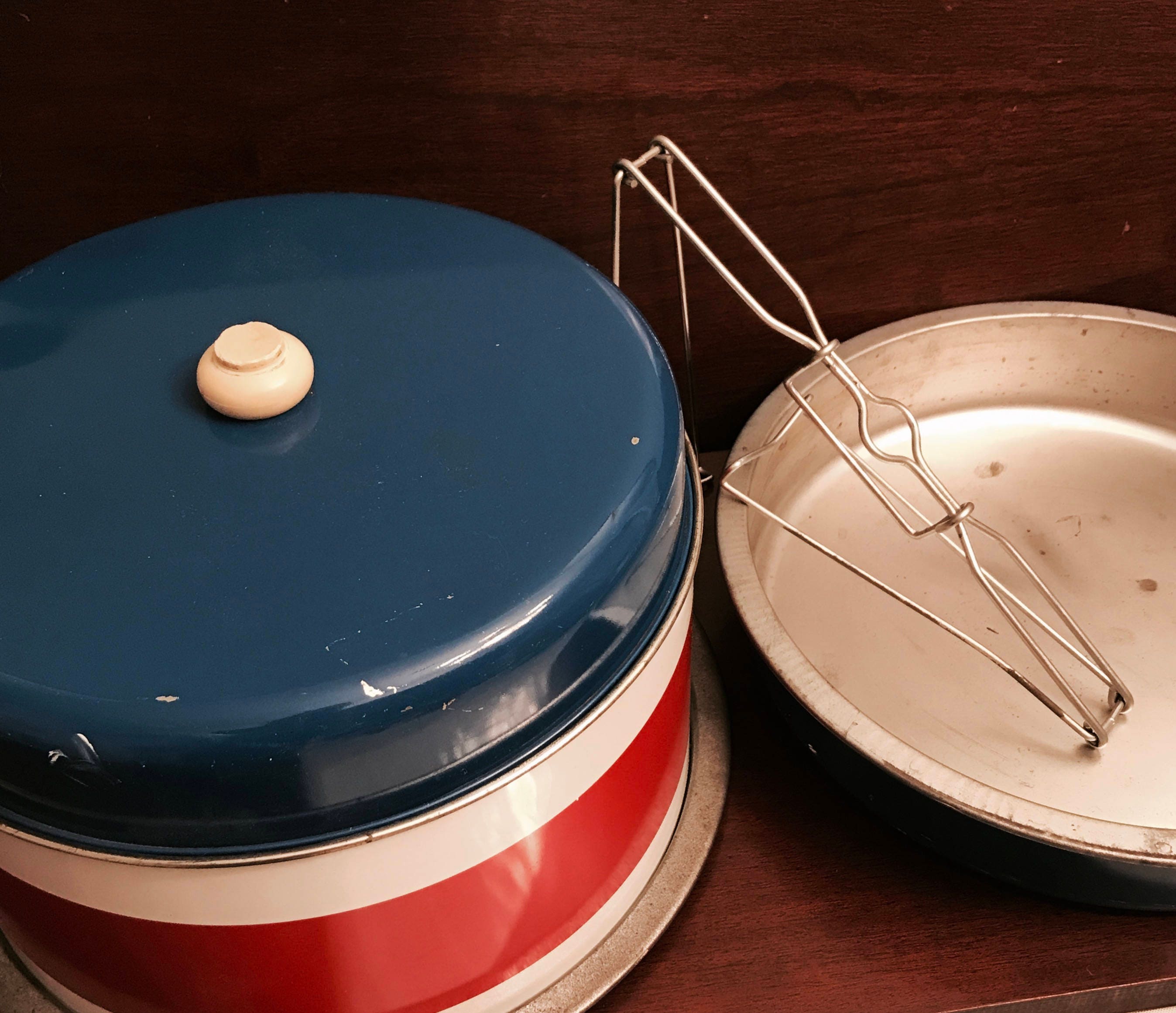 This is a fabulous vintage patriotic dessert carrier, so versatile! This is a stackable carrier. It can be used to carry a 9 inch layer cake in one compartment and a pie in the other compartment, the third compartment can be used for storage of paper plates forks napkins etc. perfect for your picnic party on the go! The metal clamp holds it all neatly together and has a handle for carrying. This carrier will protect your lovely desserts the next time you have to transport them to a party or your church suppers.