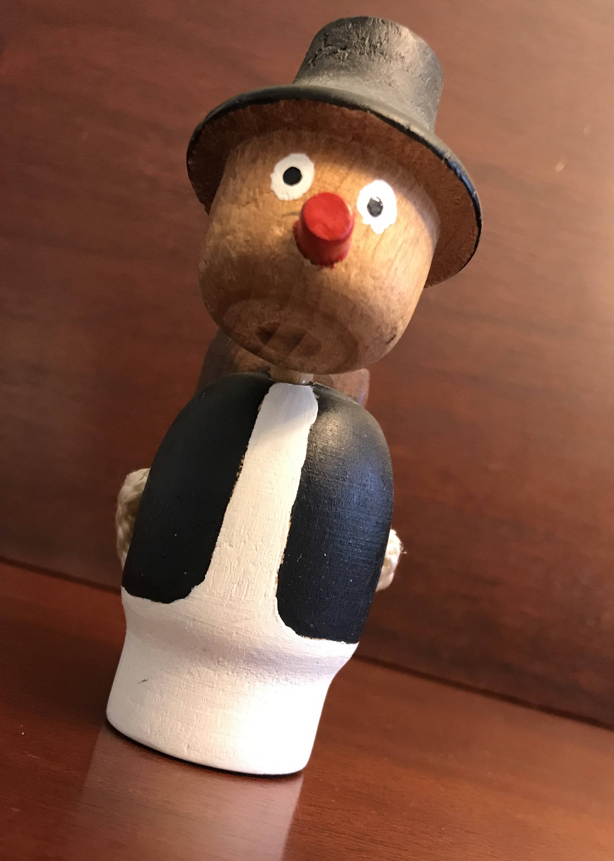 This is a German style little man toothpick holder. Made of carved wood and hand painted. The little man is carrying a wooden basket on his back. The basket has just enough room to securely hold toothpicks. The mans painting is simple and the carving of the wood is well done. This would be so cute at the dinner table. It would also be perfect in a man cave setting.