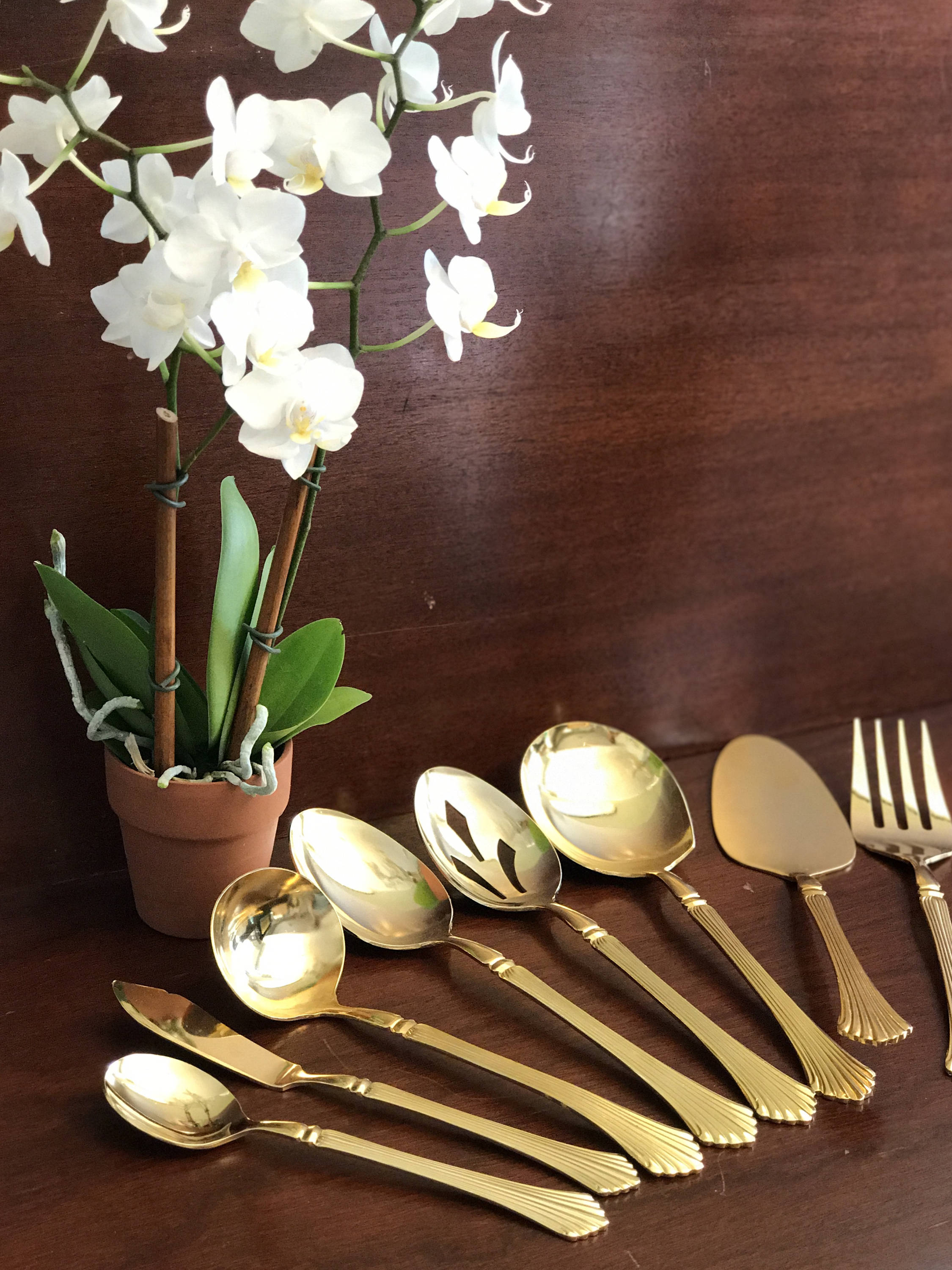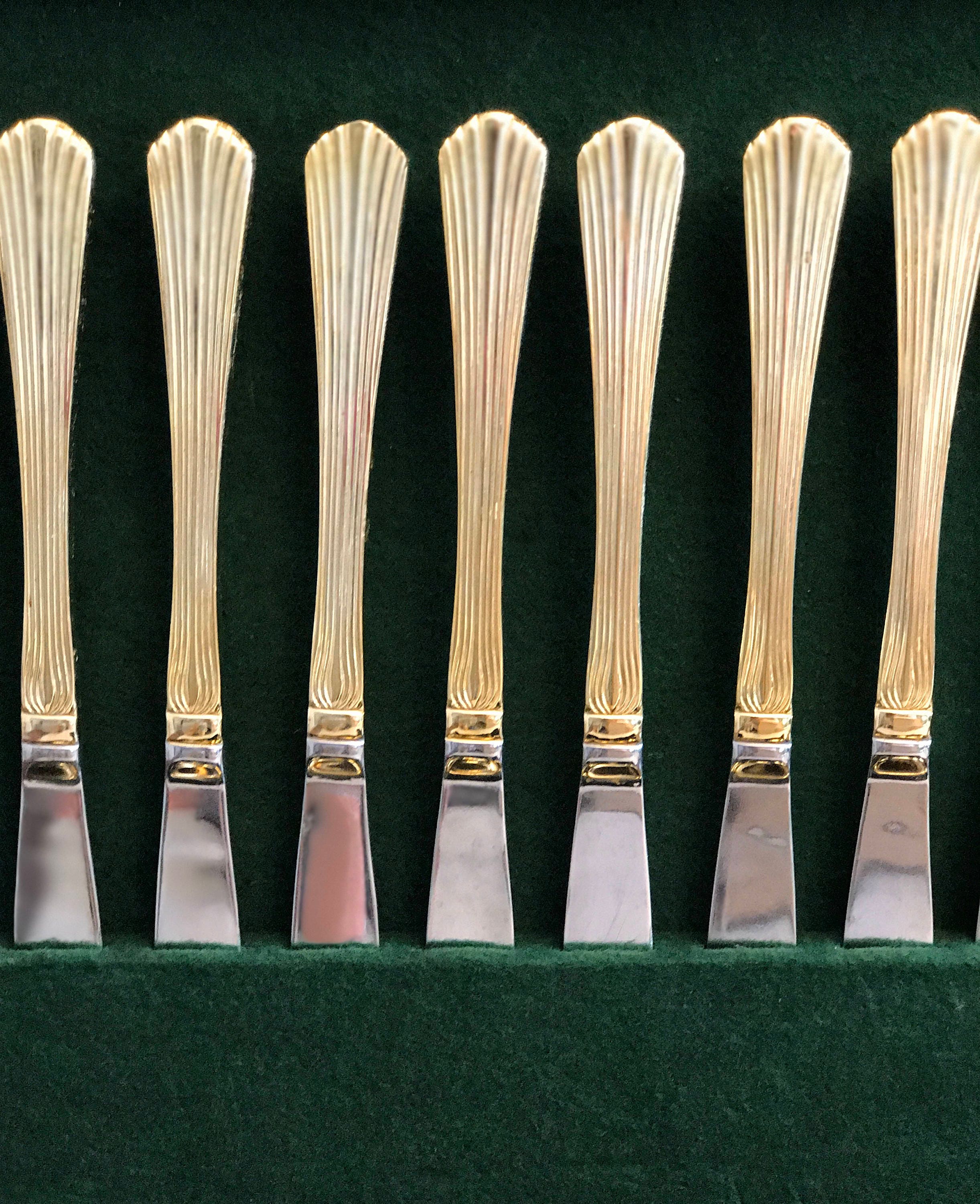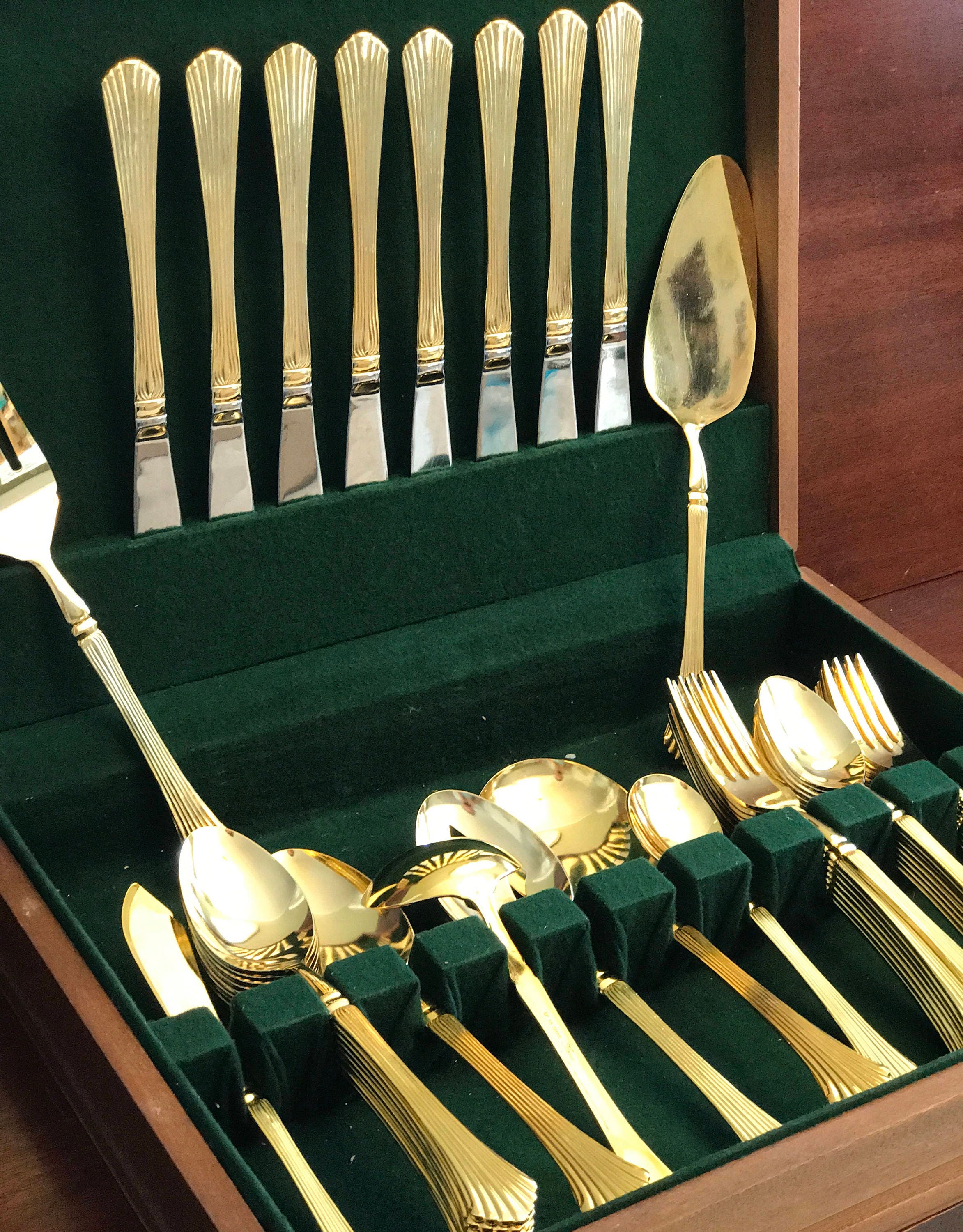Gold Stainless Flatware by Kanu. Gorgeous Stainless flatware electroplated with Gold on an elegant fan pattern. This is a complete set of flatware.
