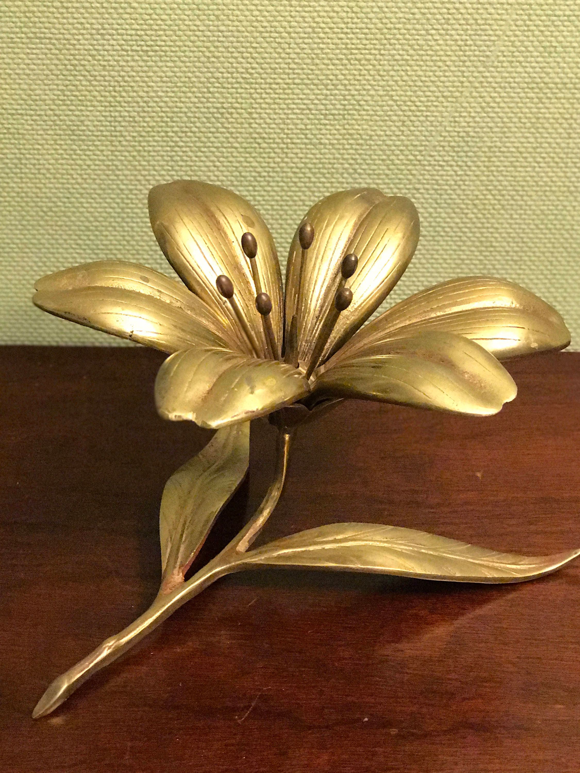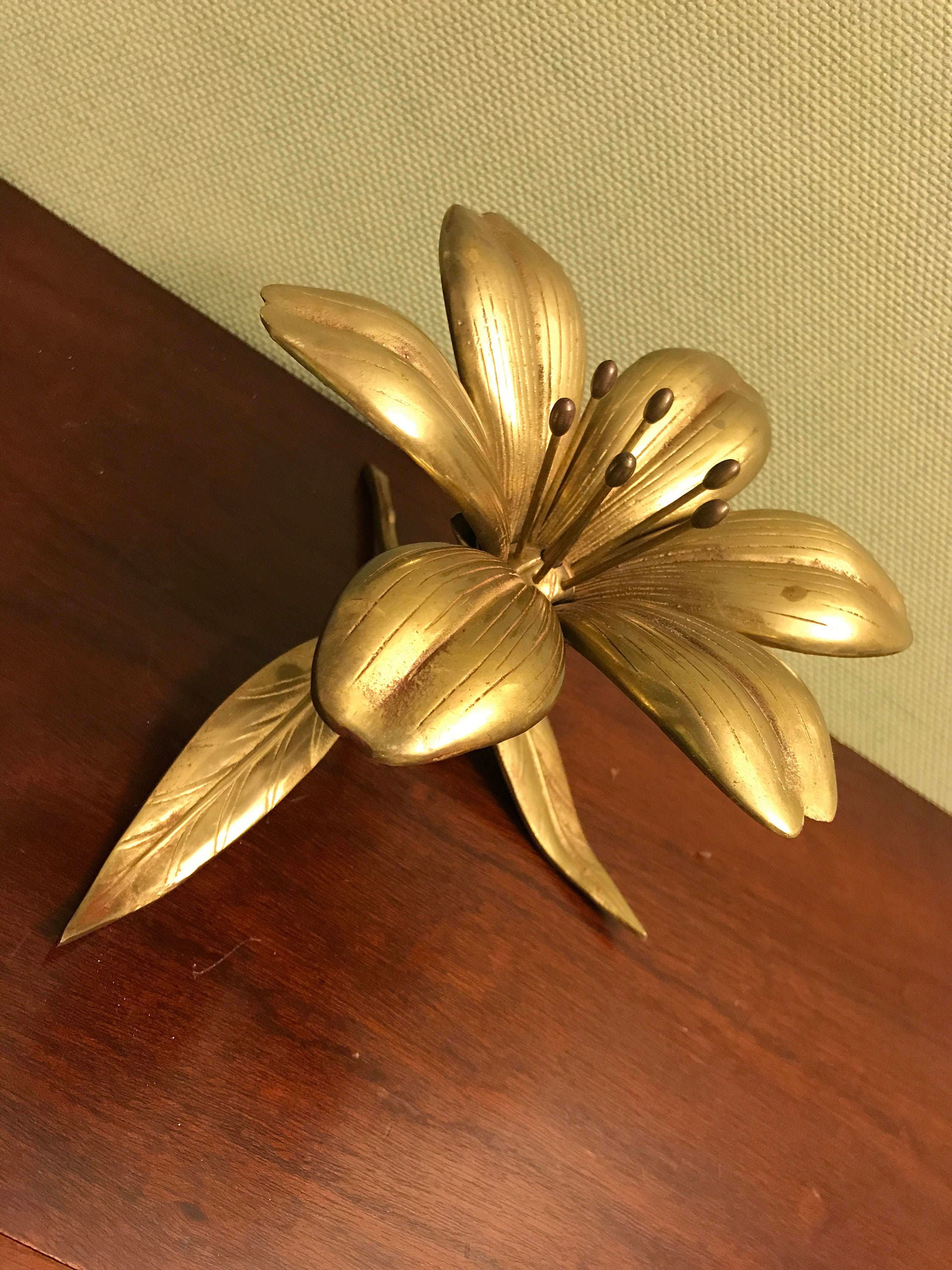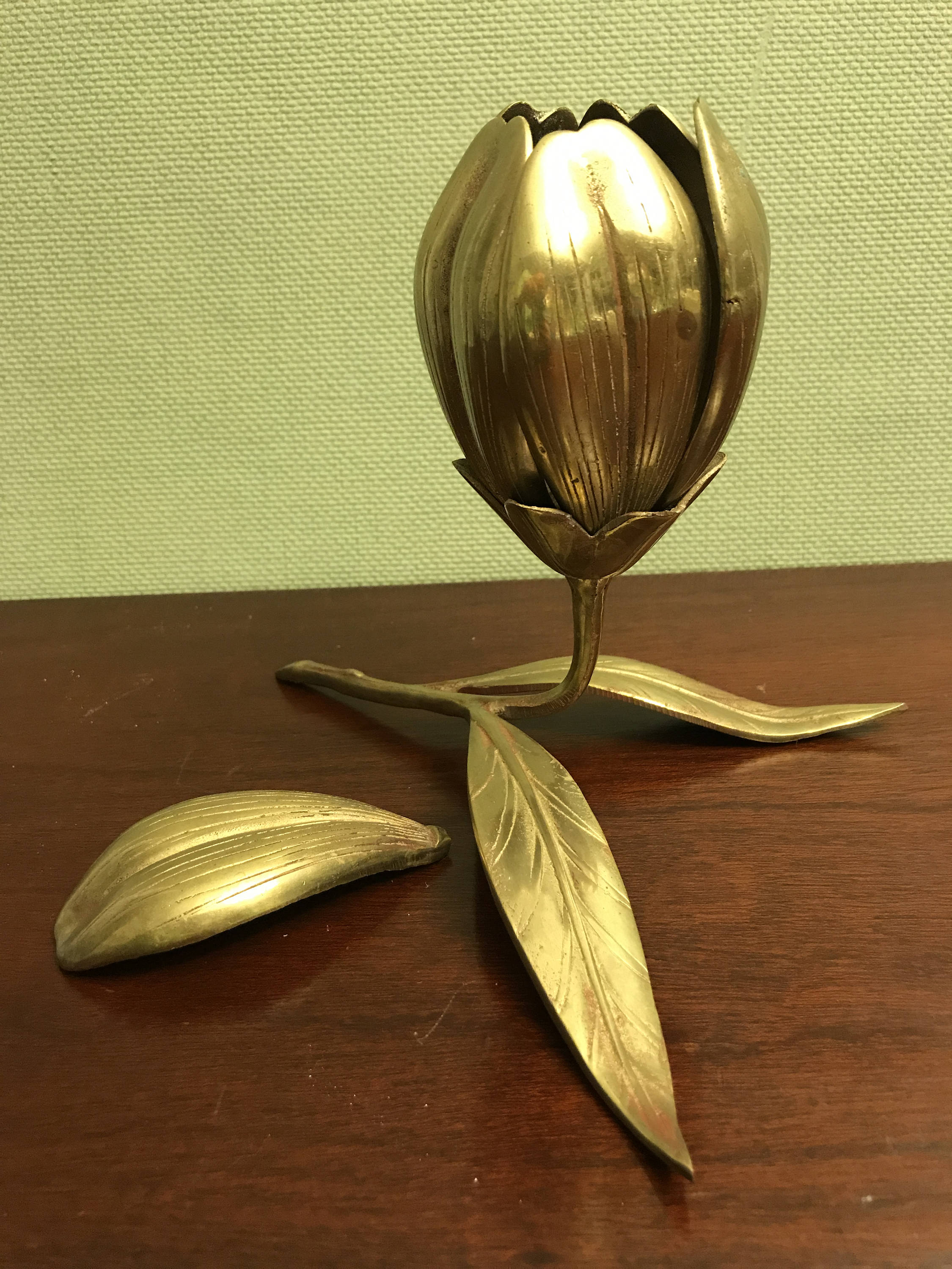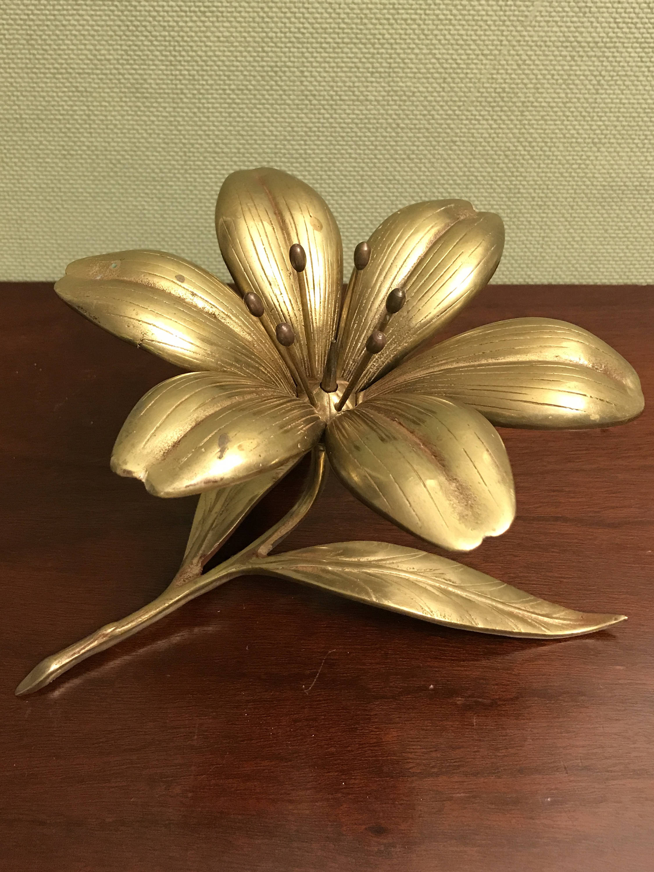 Mid Century Modern brass Lily Sculpture with two leaves and stem as the base and six removable petals. The beautiful petals can be removed and reversed to form a closed lily design. Very Unique