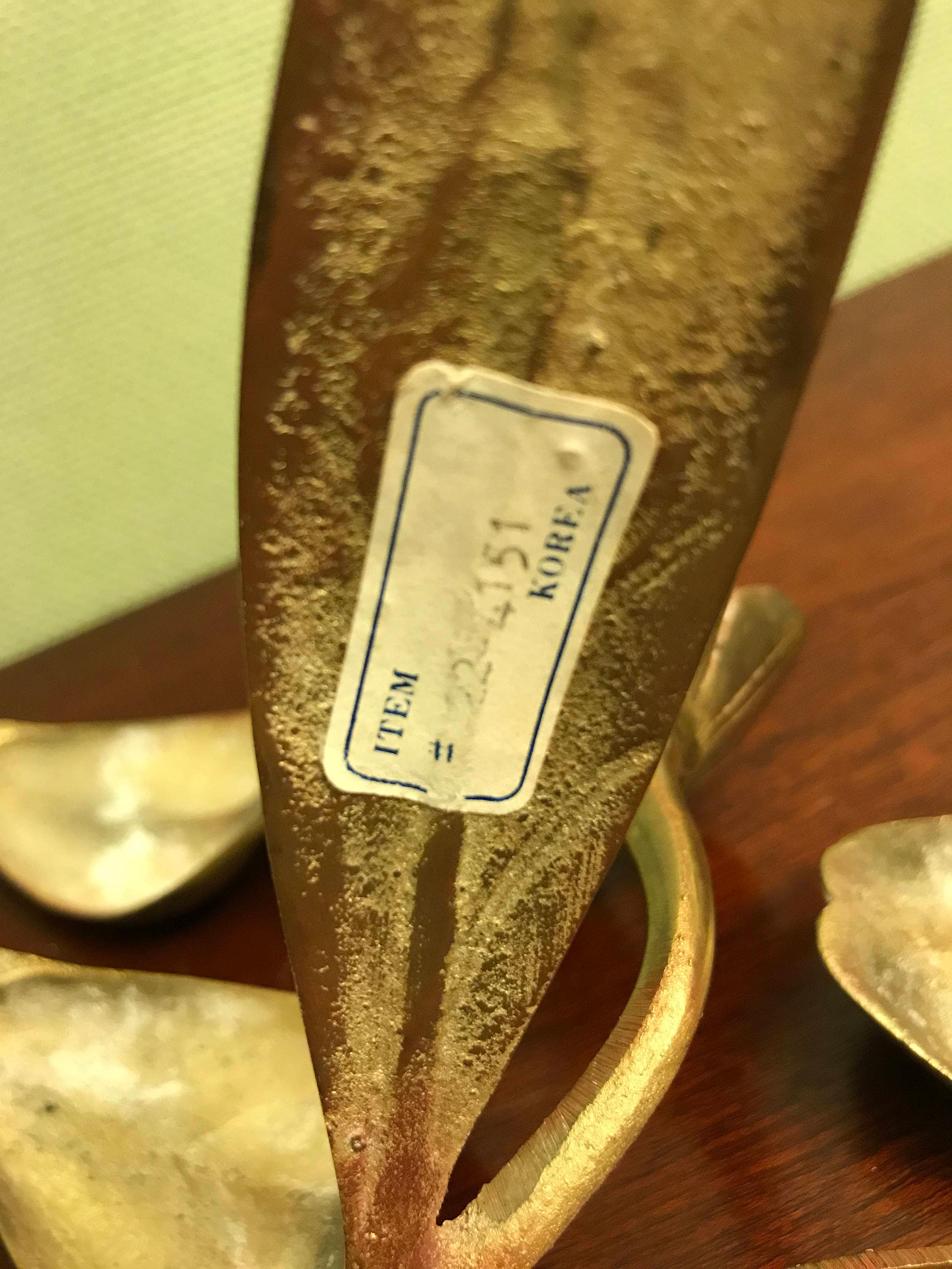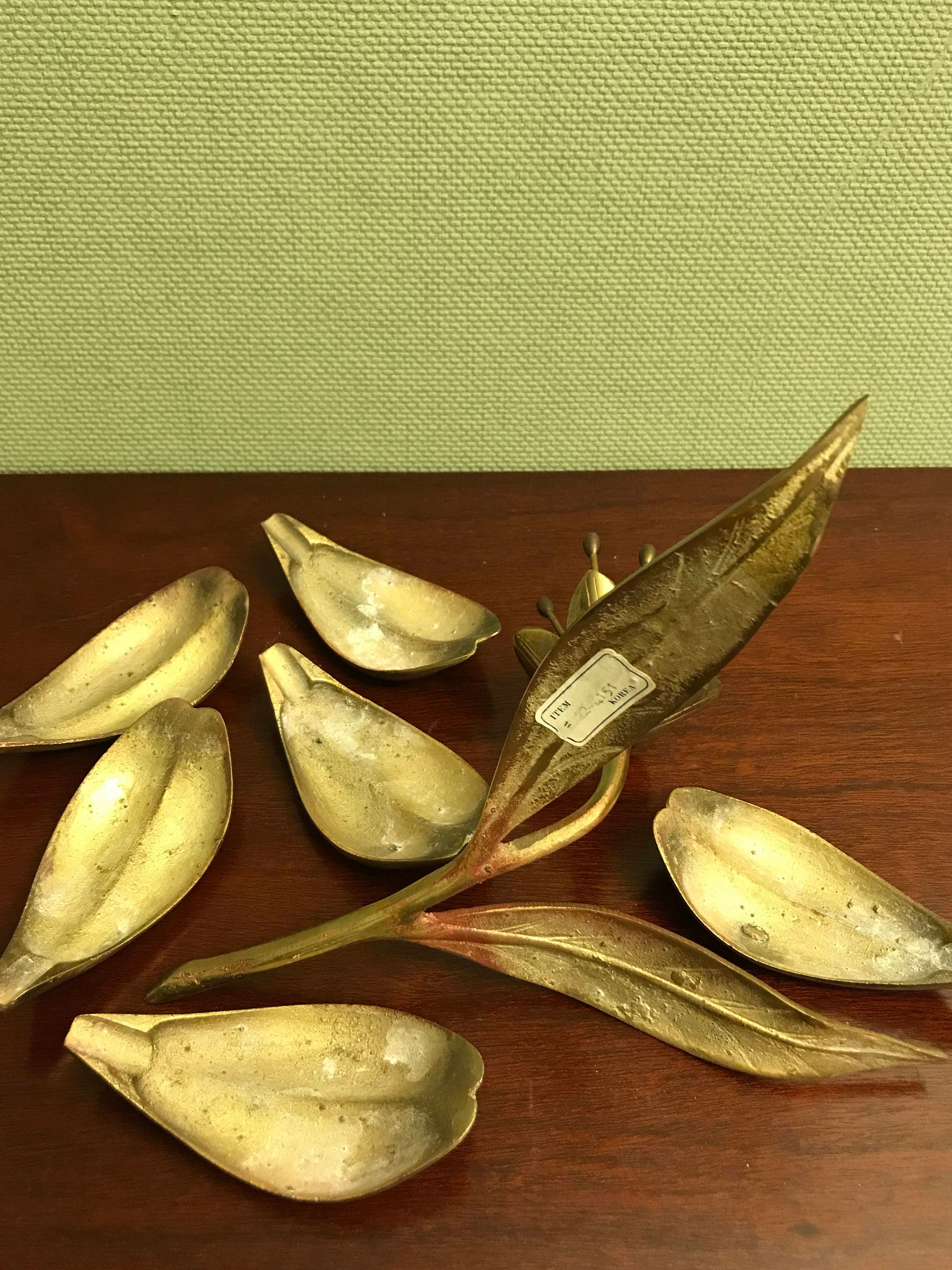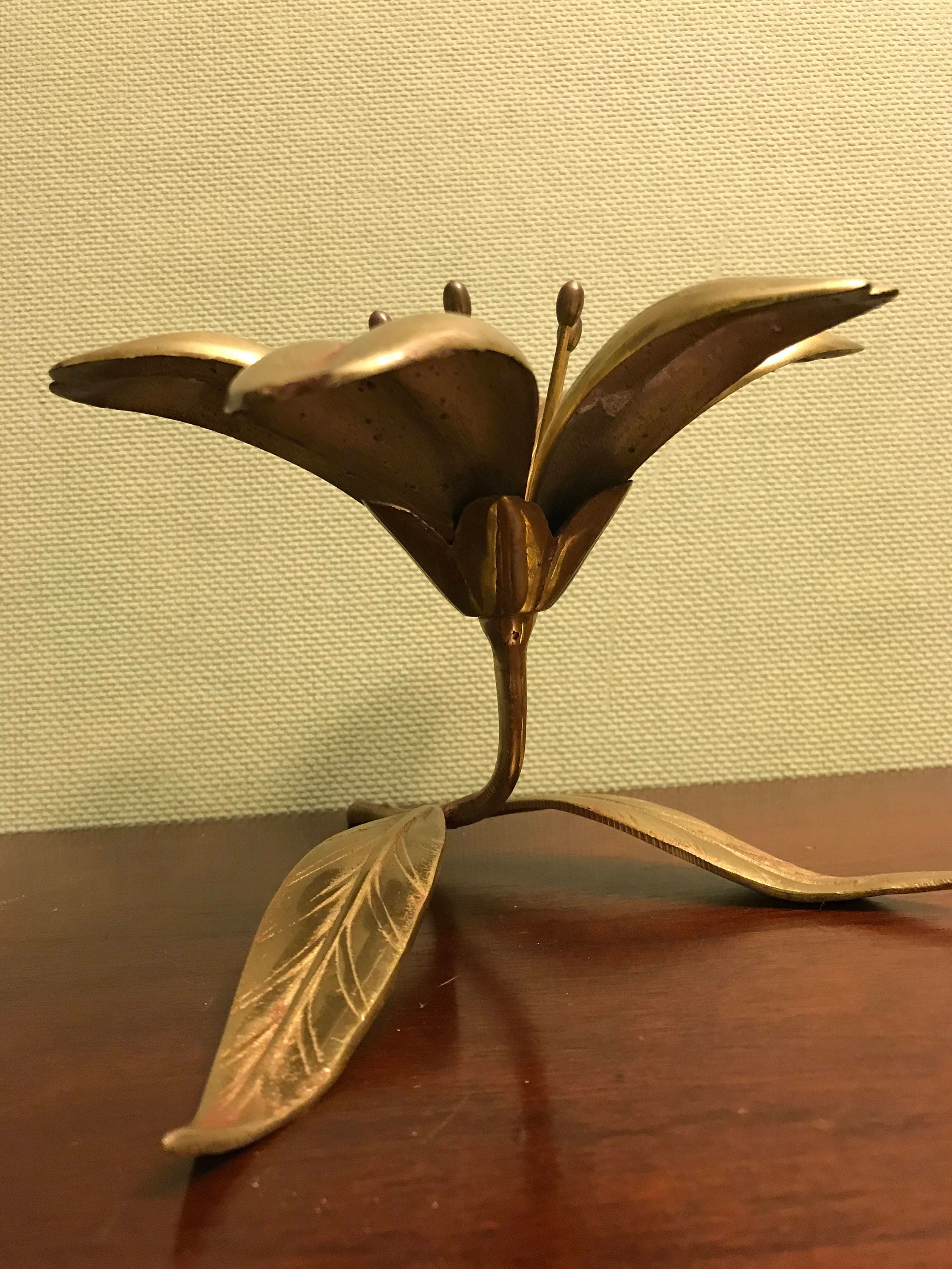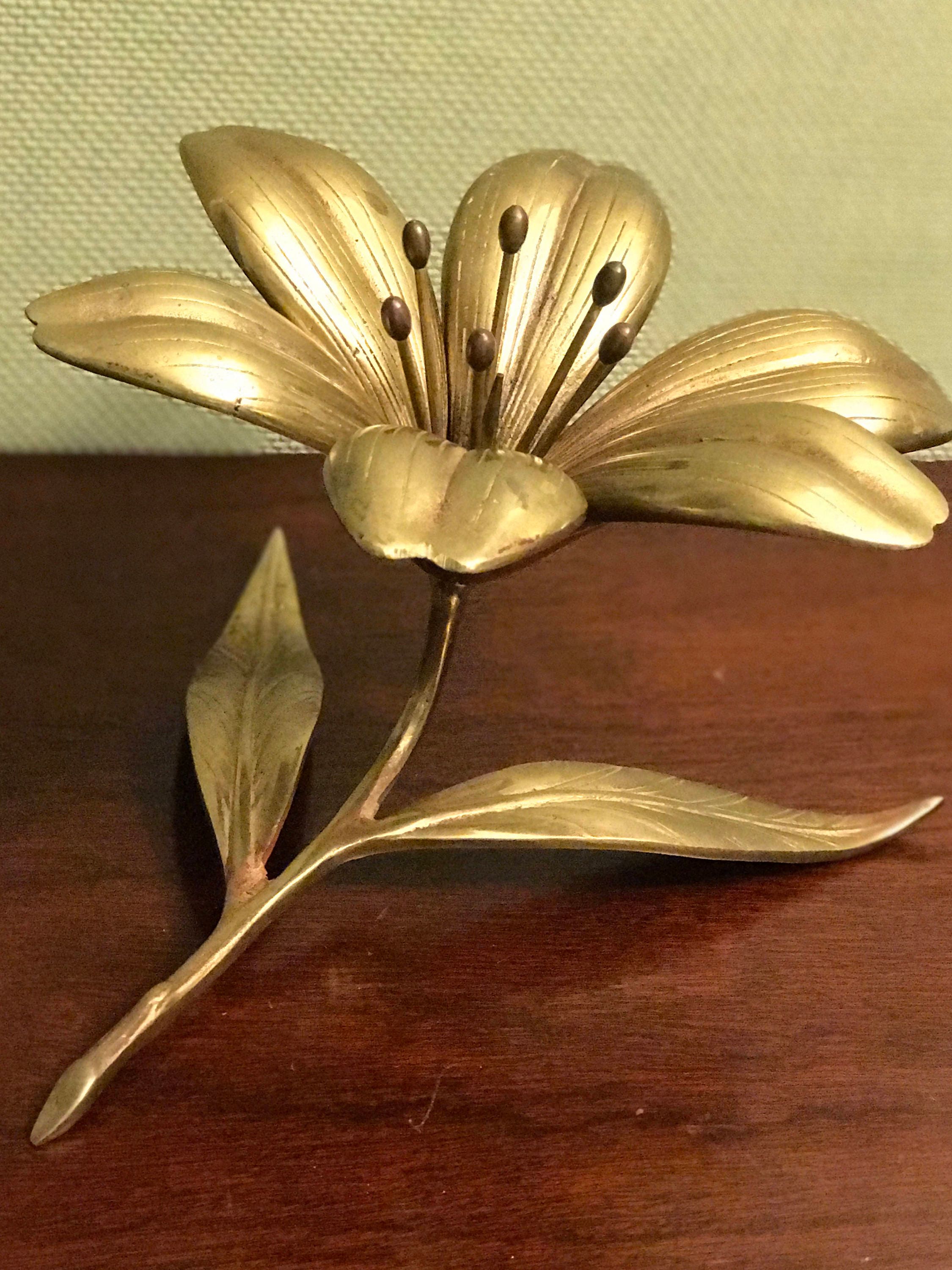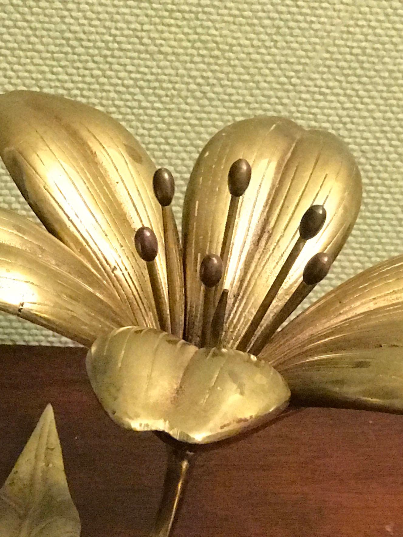 Mid Century Modern brass Lily Sculpture with two leaves and stem as the base and six removable petals. The beautiful petals can be removed and reversed to form a closed lily design. Very Unique