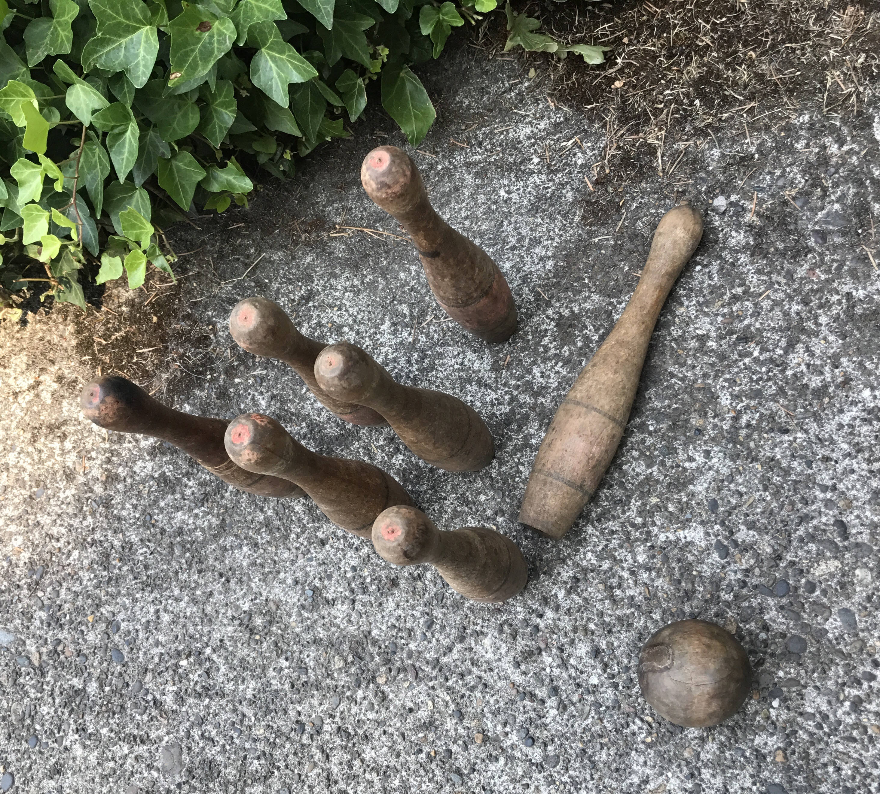 This is a fabulous set of Vintage (antique?) game of turned wooden pins and ball. This amazing set has a wonderful Patina. The pins are made of solid turned wood. The ball is solid wood. These are an amazing find of collectible bowling pins and ball. This set consists of seven pins and one ball.