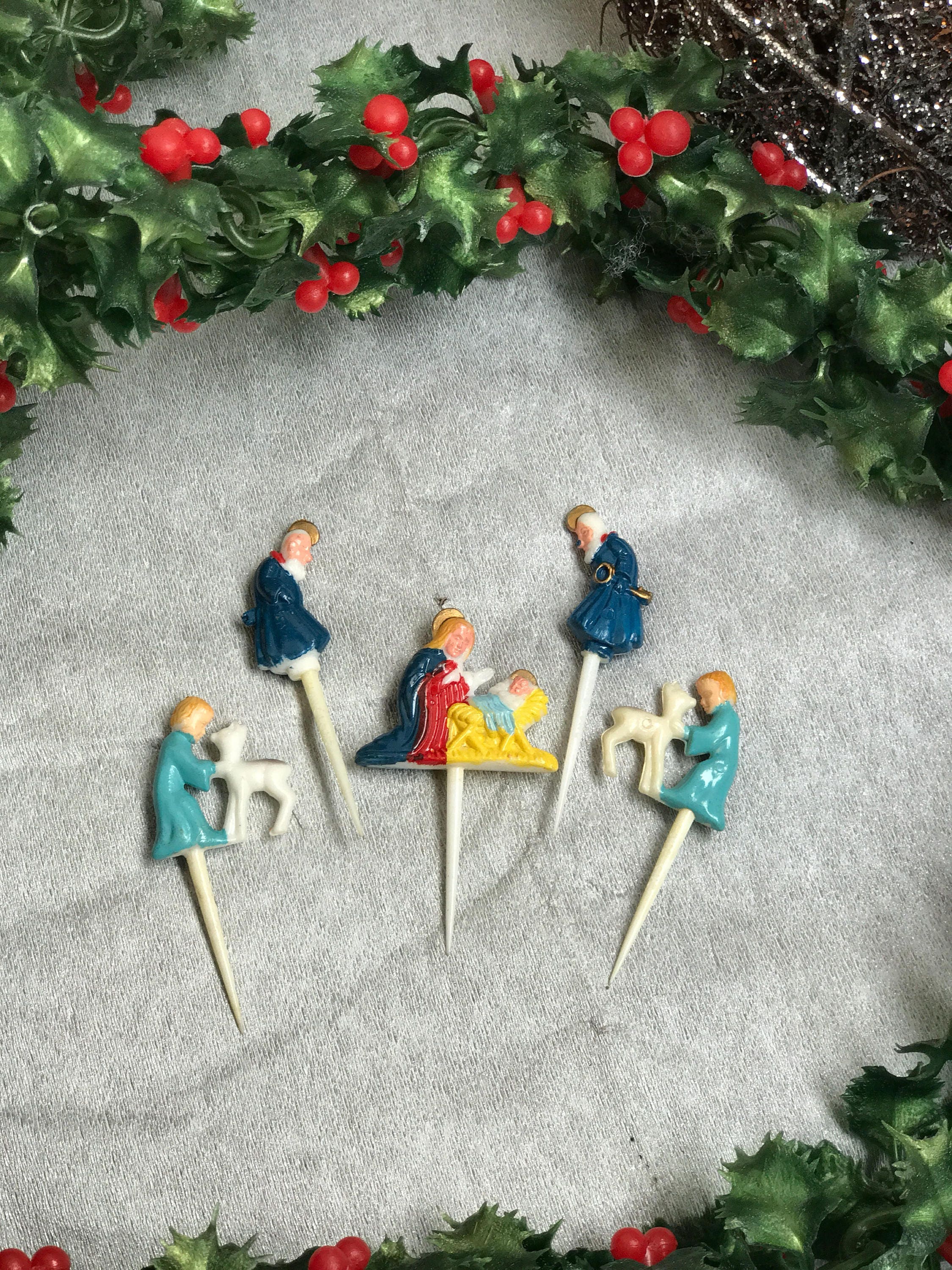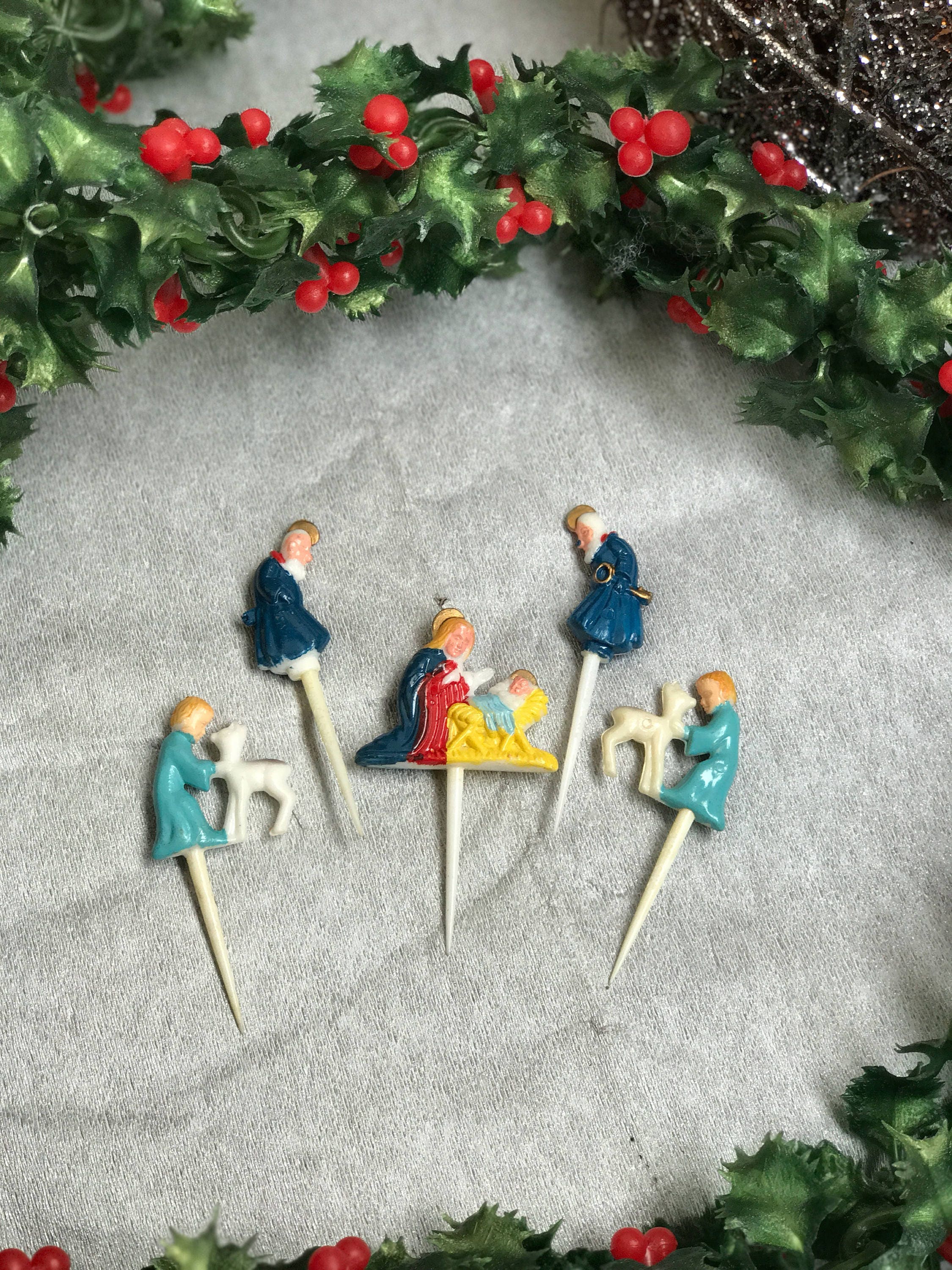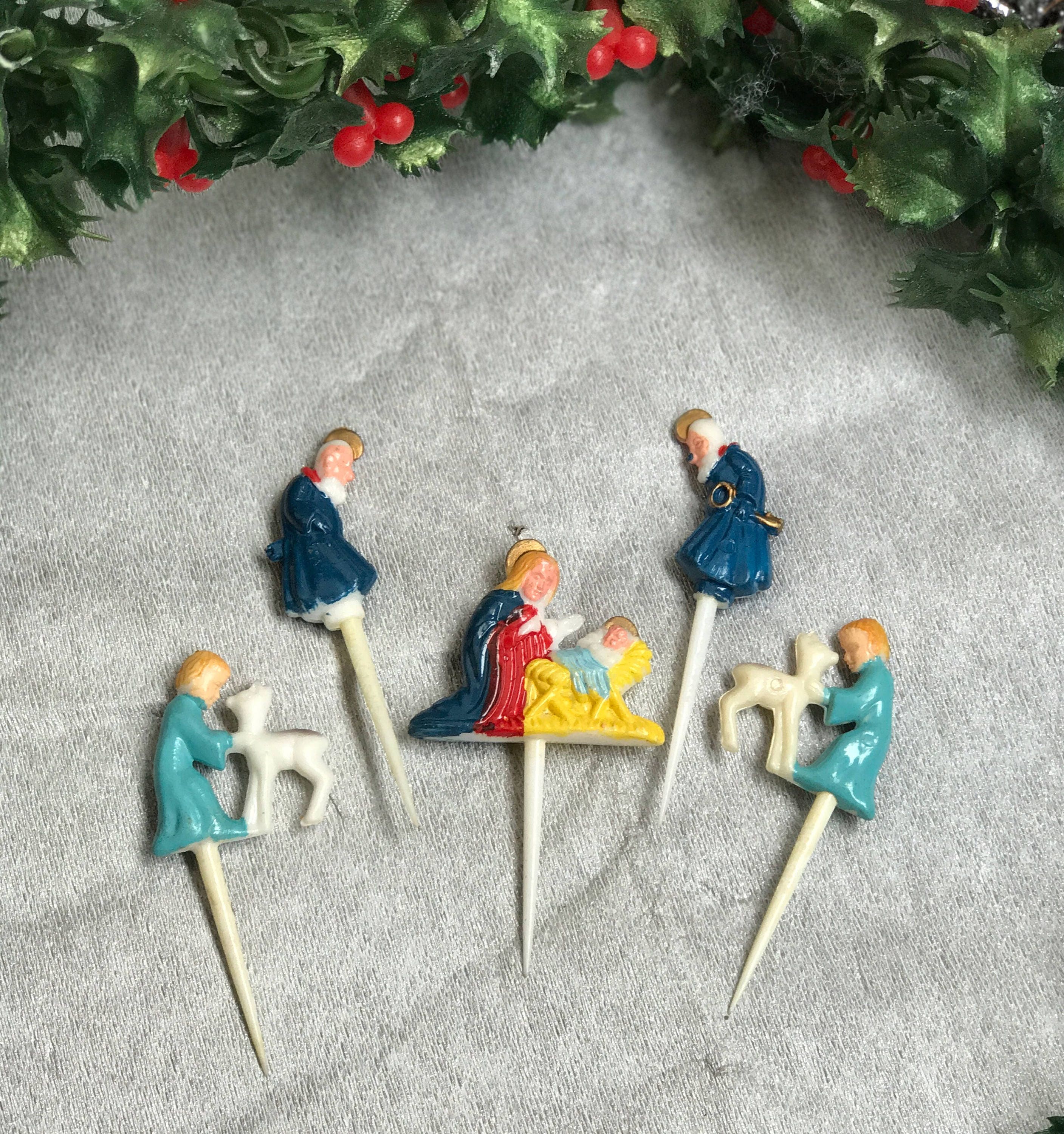 Vintage Celluloid Nativity Christmas cupcake toppers. These vintage cake decorating supplies are great for a Holiday themed party or craft project. The set includes 5 cupcake toppers. These little toppers are perfect for cupcakes.