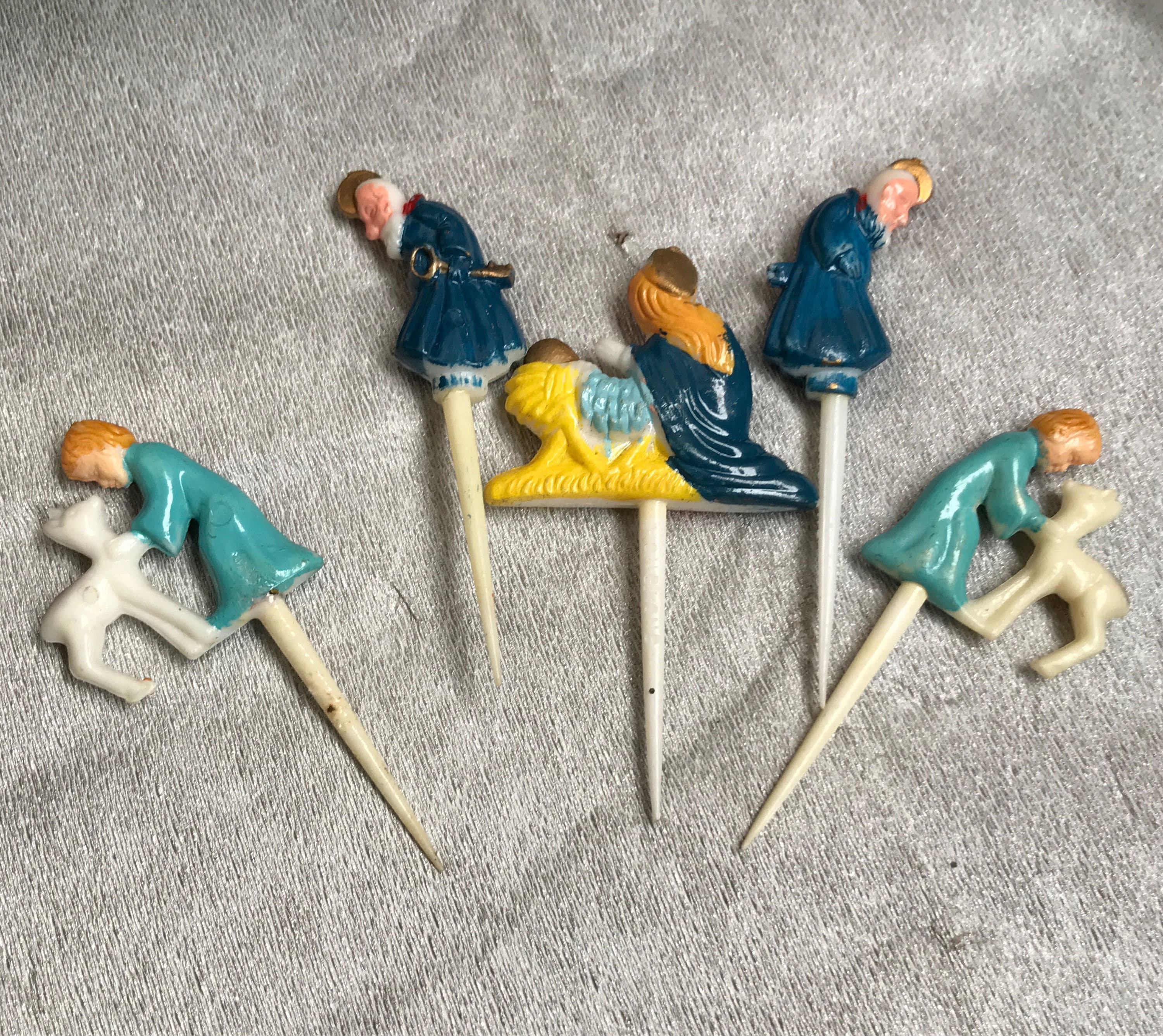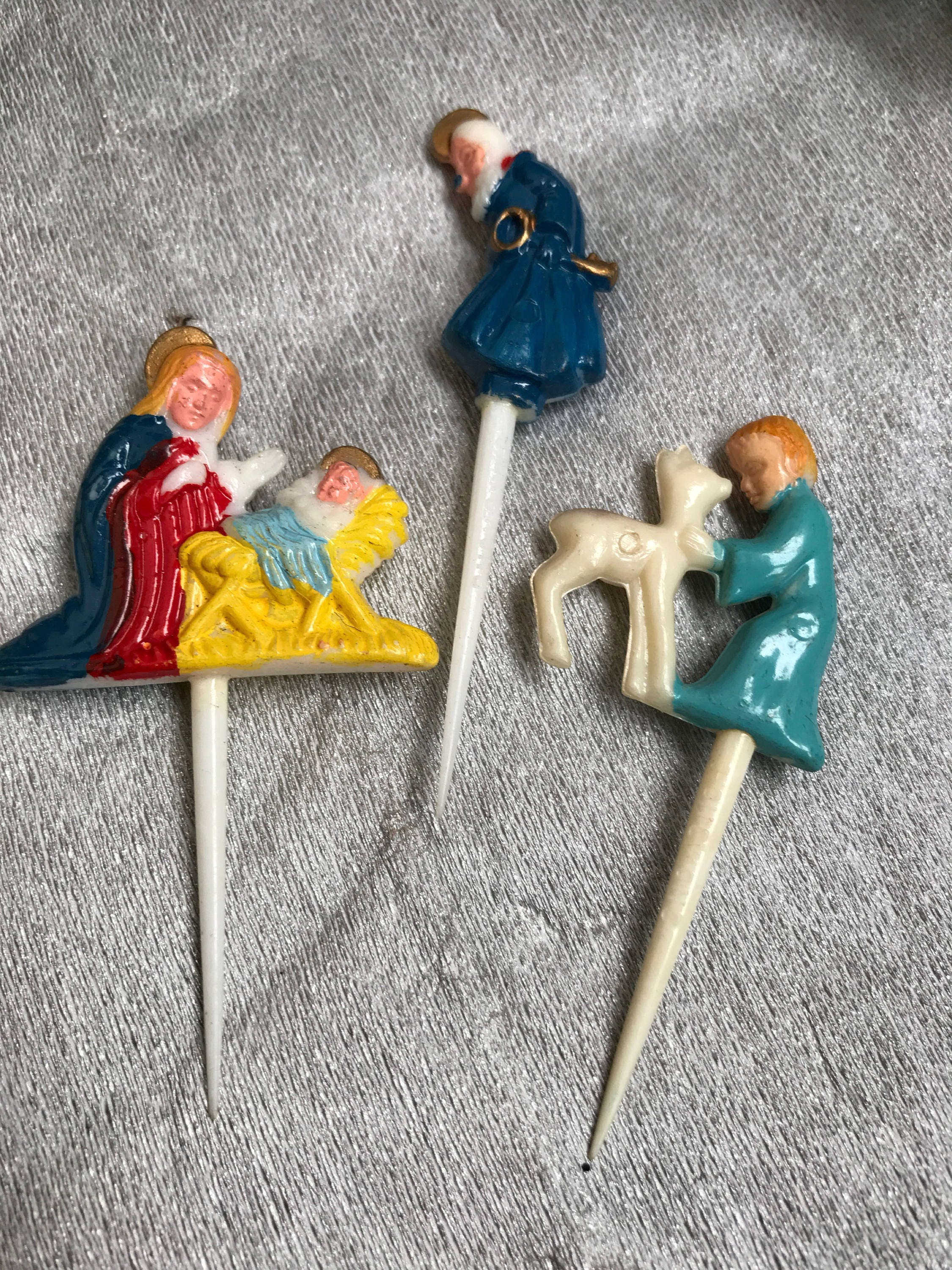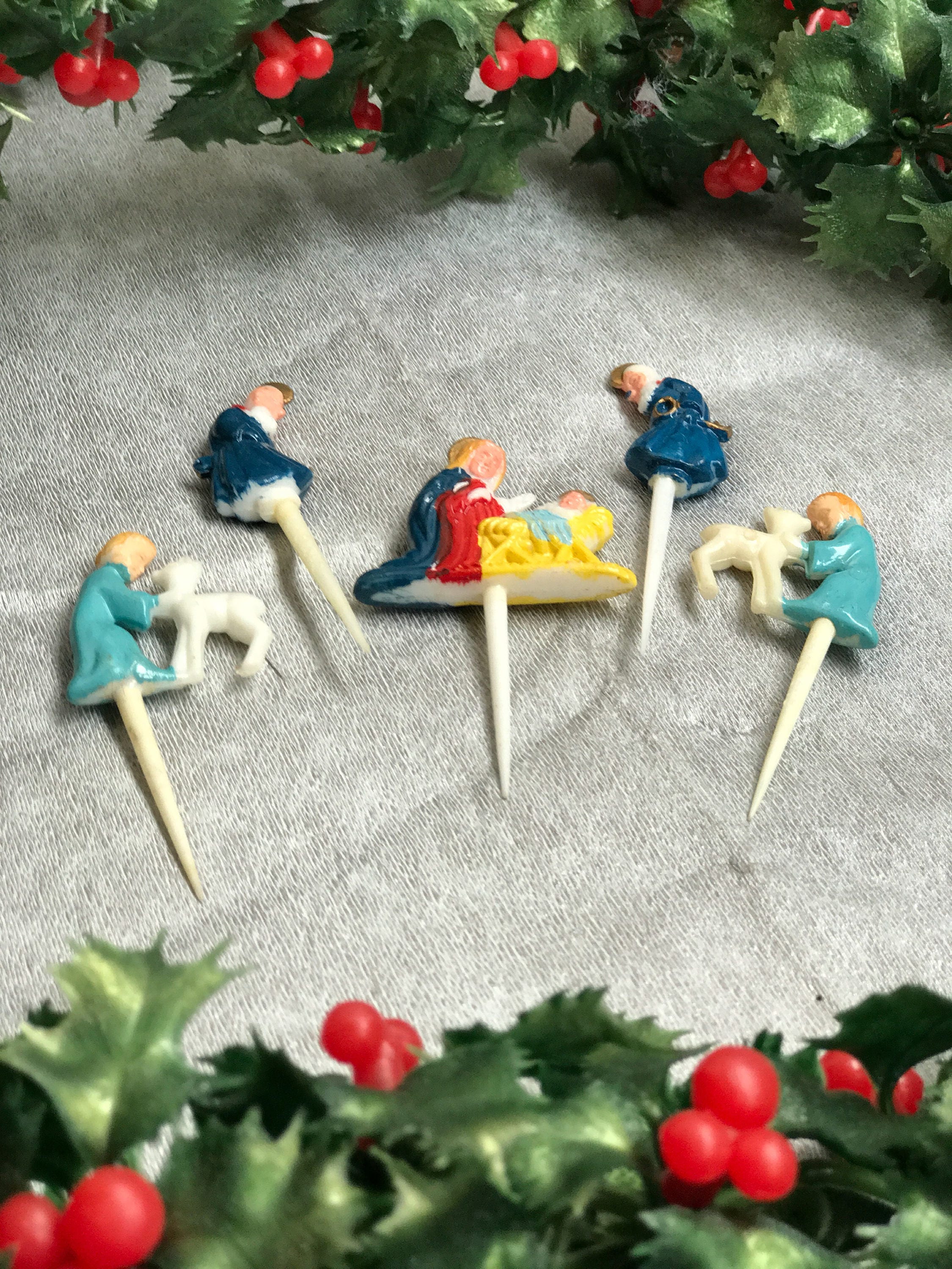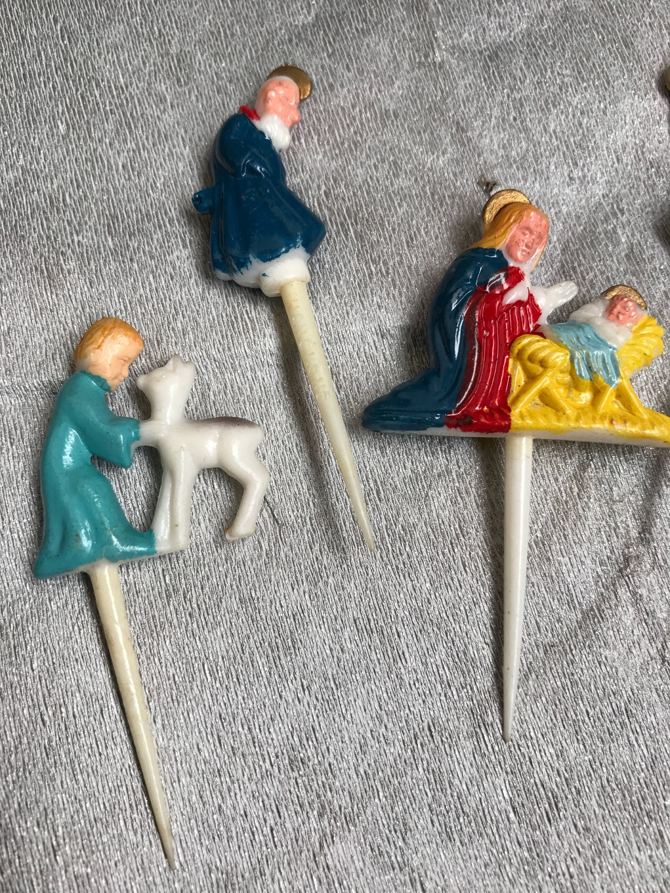 Vintage Celluloid Nativity Christmas cupcake toppers. These vintage cake decorating supplies are great for a Holiday themed party or craft project. The set includes 5 cupcake toppers. These little toppers are perfect for cupcakes.