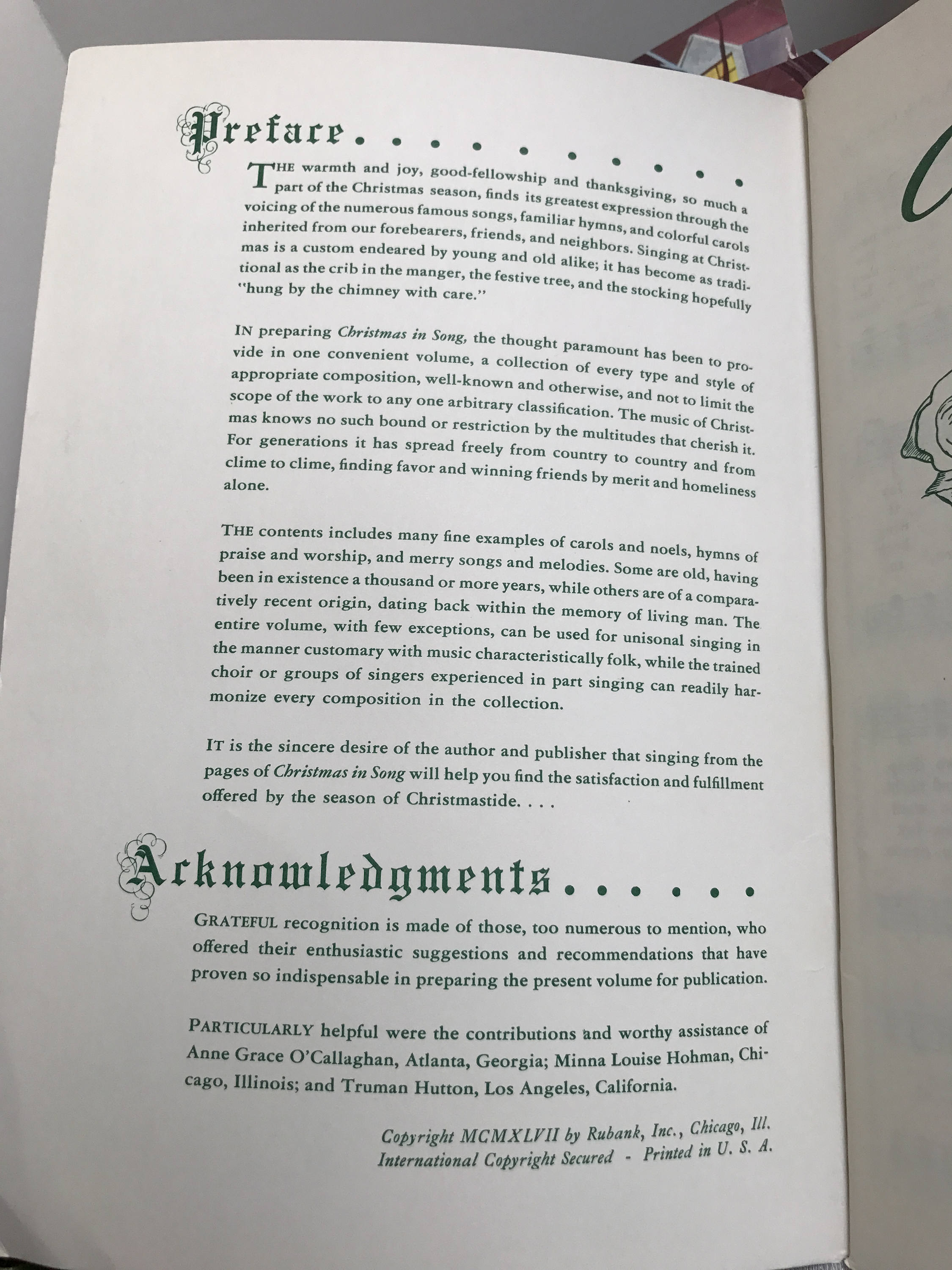 "The contents includes many find examples of carols and Noels, hymns of praise and worship, and many songs and melodies. Some are old, having been in existence 1,000 or more years, while others are of comparatively recent origin, dating back within the memory of living man. The entire volume, with few exceptions."