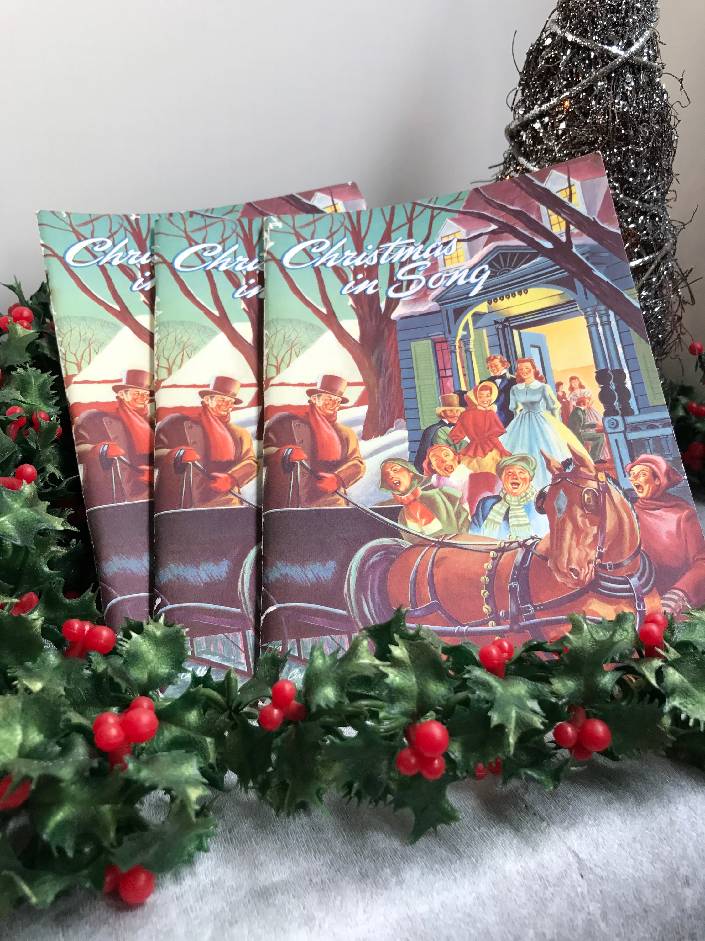 Beautiful vintage Christmas caroling books from the 1940s. These lovely books are beautifully illustrated on the entire cover front and back with pictures of old fashioned Carolers, a horse and carriage, and A lovely colonial home with family on the porch.