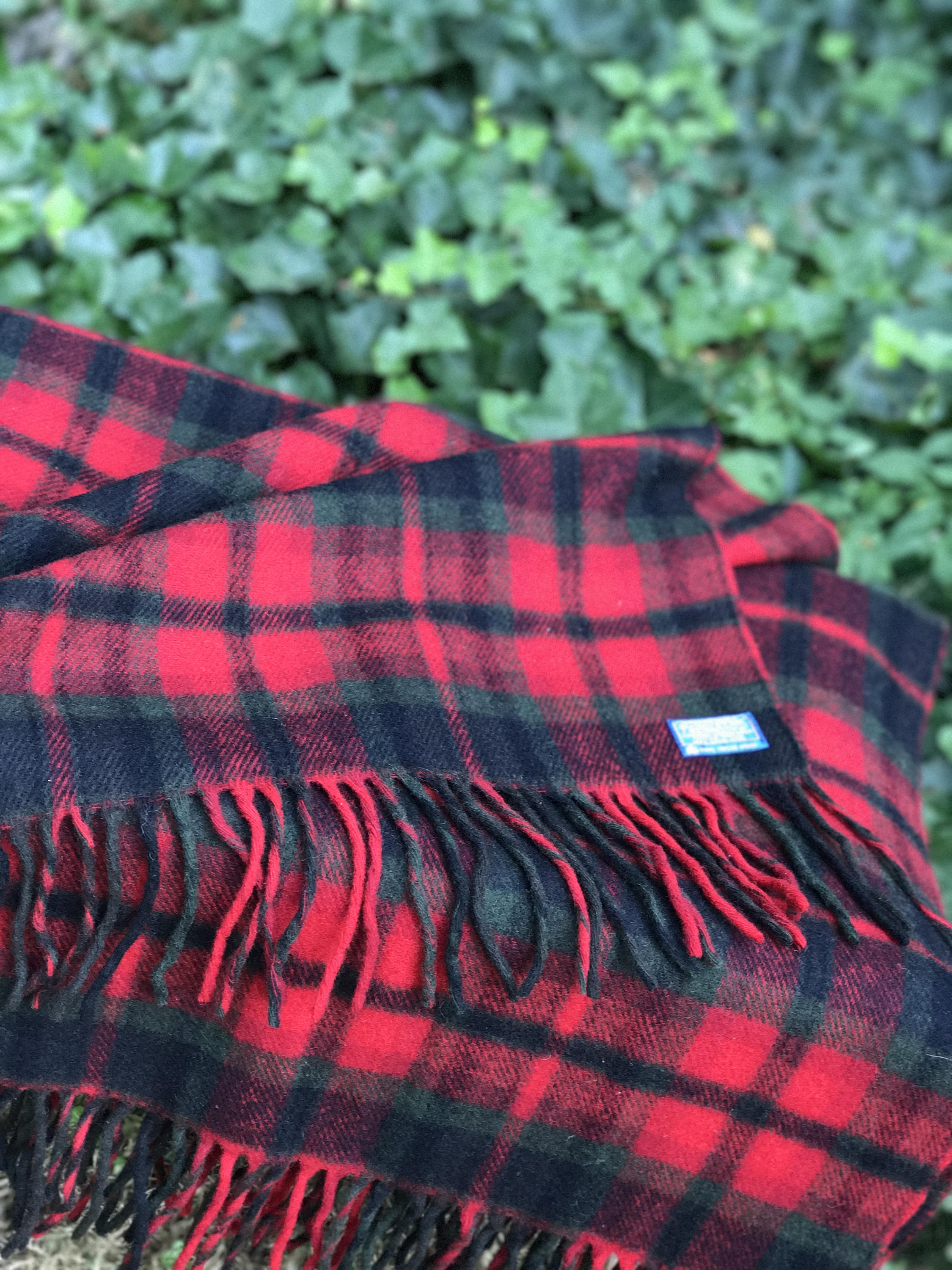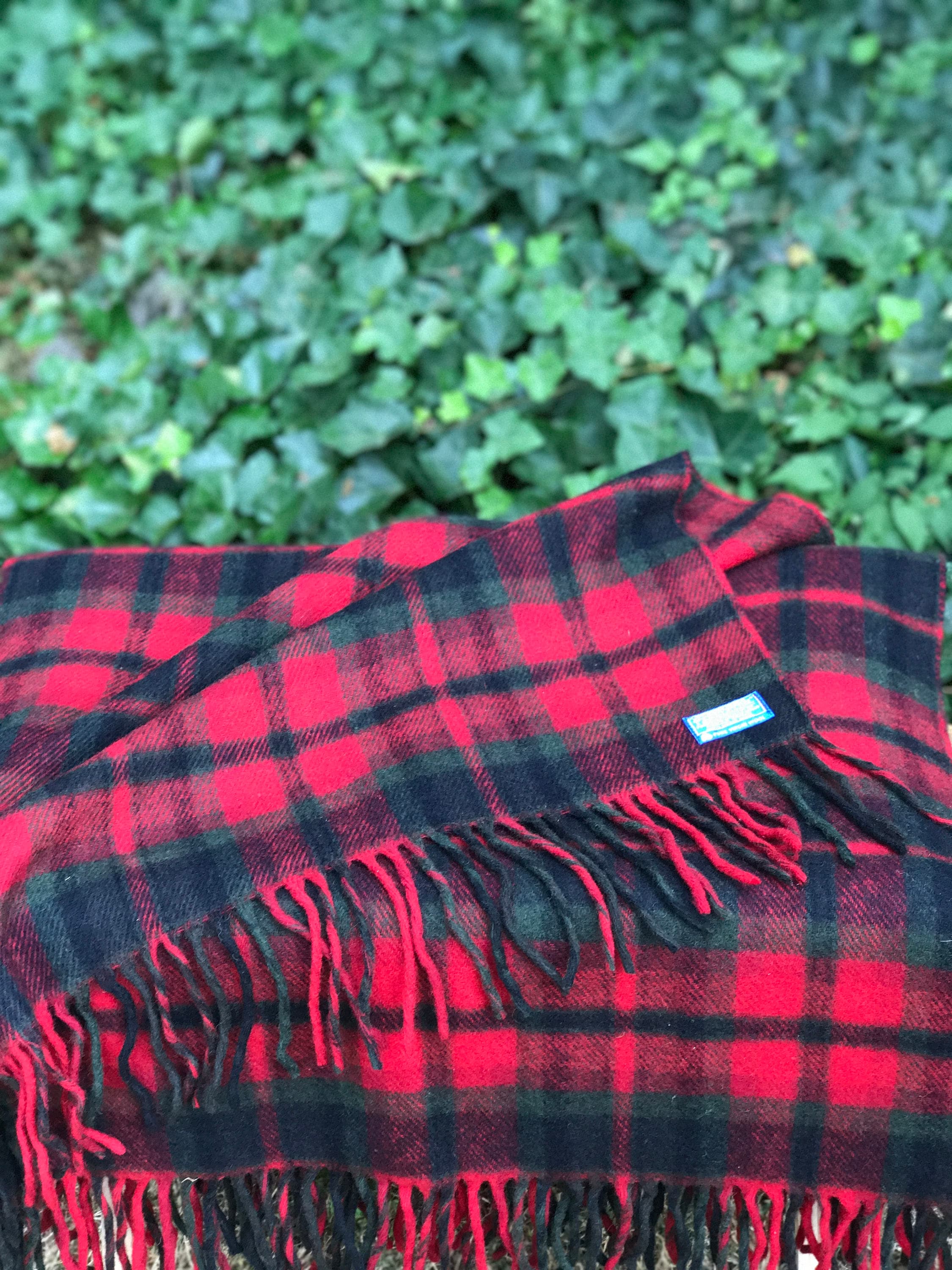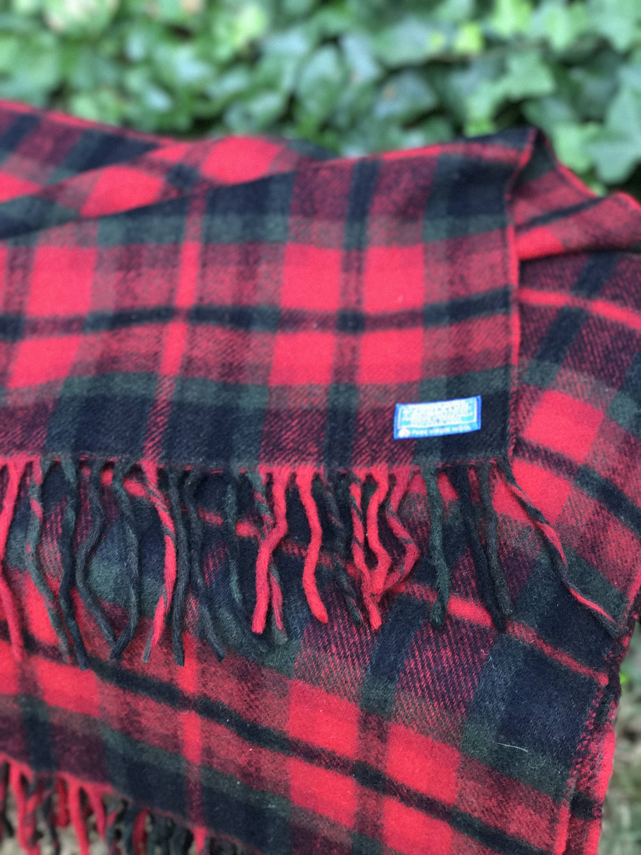 The Pattern is a classic red plaid with broad black and green lines. Perfect for a picnic or camping trip. Made of 100% virgin wool.