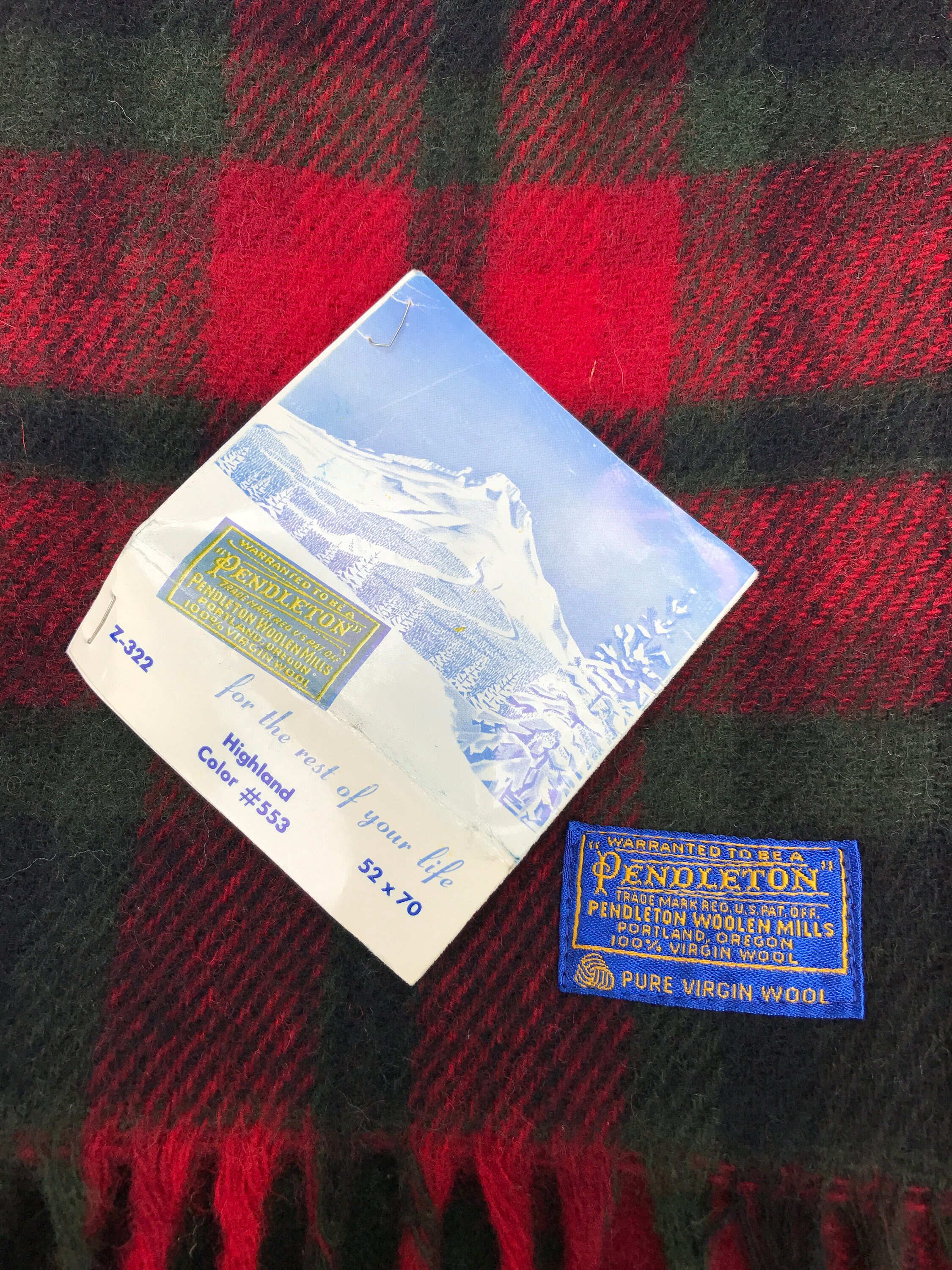The carrying case is tagged "Pendleton Robe in a bag". The original tags are in the bag. It has no foul odors. I have dry cleaned this blanket.
